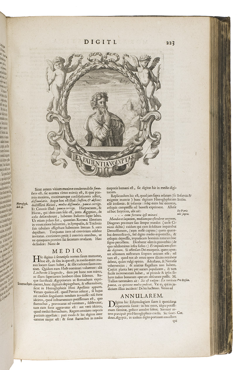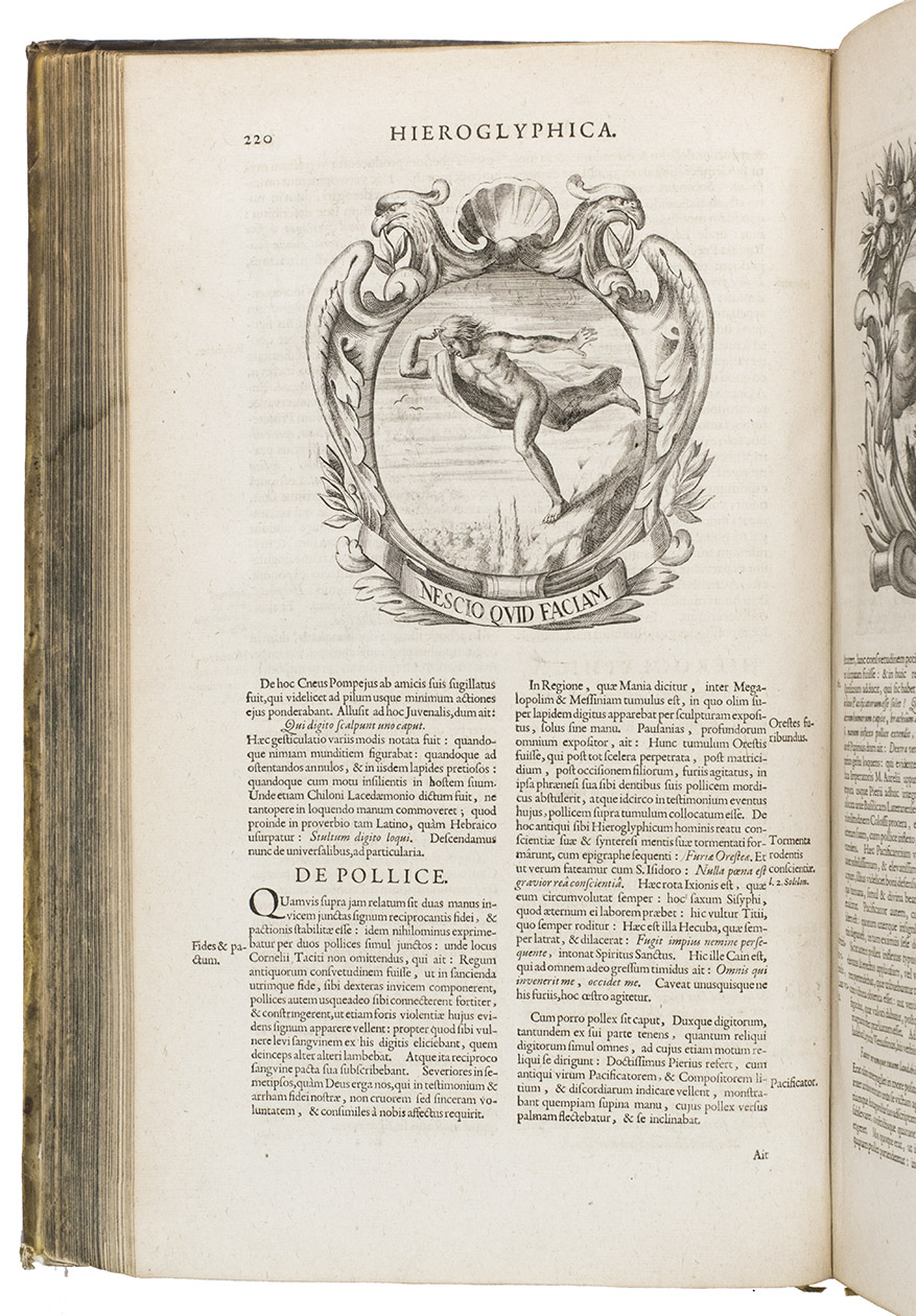 "The erudition demonstrated by the author is really quite extraordinary" (Raybould) including metoposcopy (the interpretation of facial wrinkles for divination!). An appendix adds short accounts of several subjects, including "hieroglyphia" and "androgyni", along with short works by other authors: Lactantius Firmianus's "De opificio Dei", Coelius Rhodiginus on humanity, and a long "Ode" to humanity: "Considerationes patheticae de creatione, & dignitate hominis" based on Trismegistus, Plato, Coelius and other ancient sources.