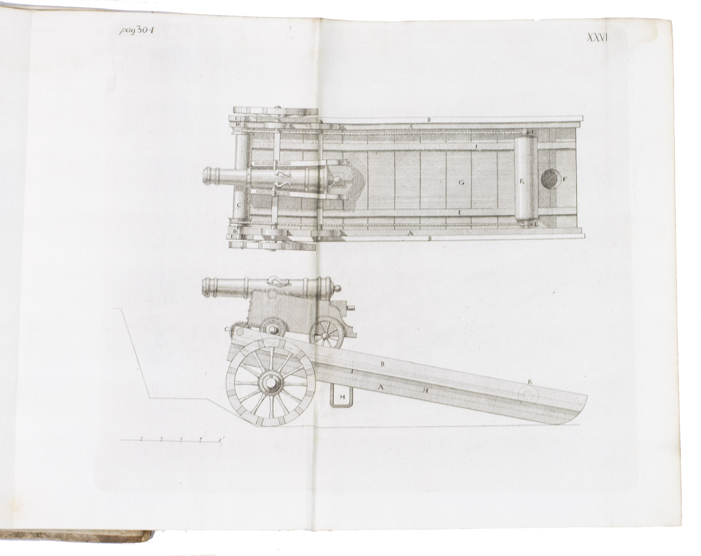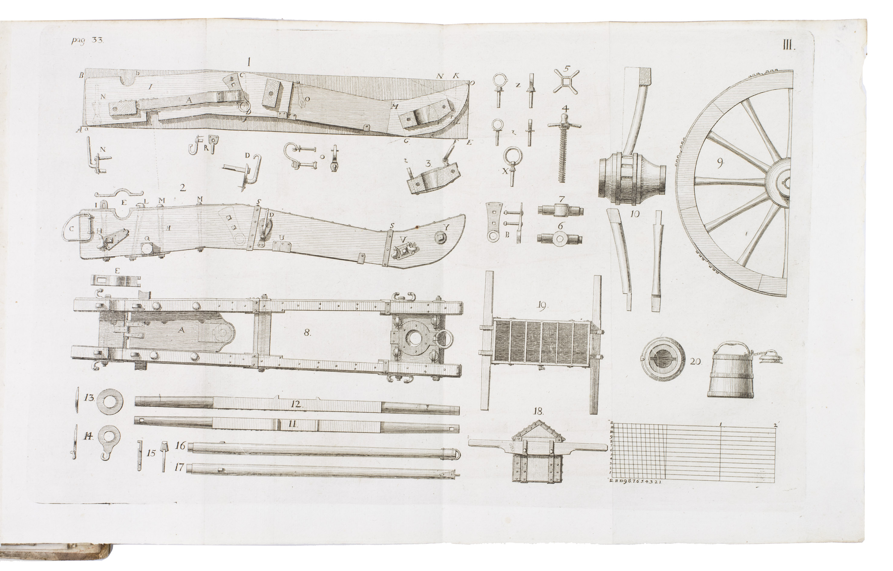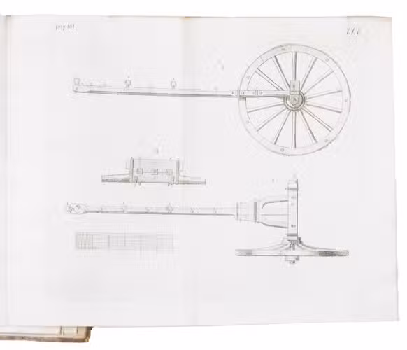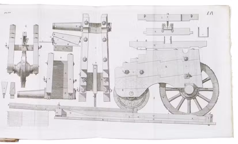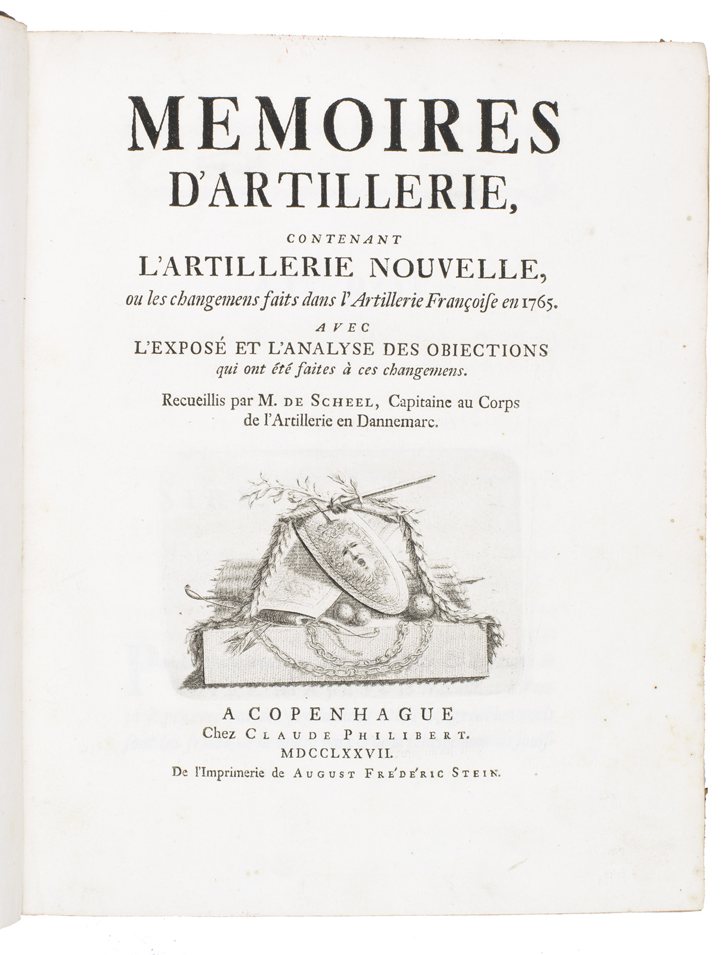 First edition of a work on the artillery of the French army, written by Heinrich Otto de Scheel, officer in the Danish army. It deals with the "artillerie nouvelle" following the changes made in the French army in 1765. The first part of the book deals with these changes individually, commenting on new regulations for the artillery during sieges, offence, defence, campaigns, etc. The second part sets out the various objections that had been made against the changes, with comments by the author. The plates depict different types of canons, machinery, siege engines, and more.