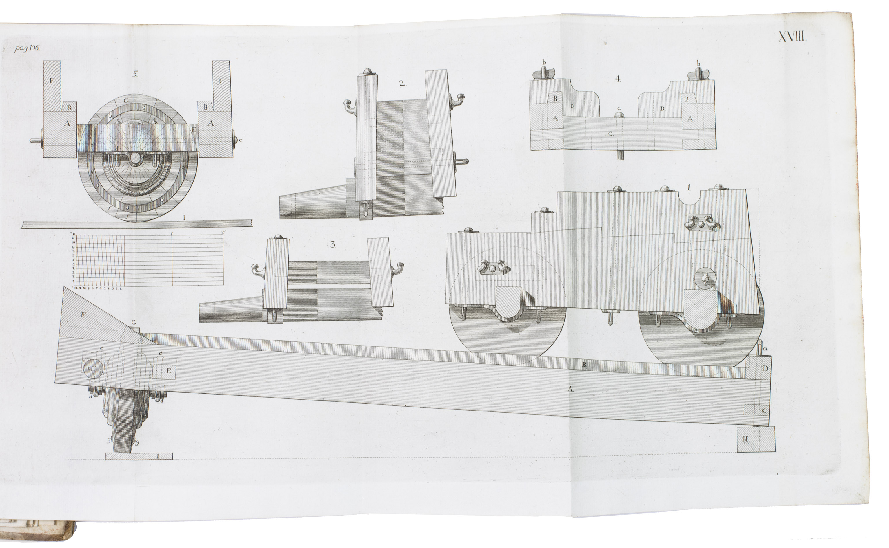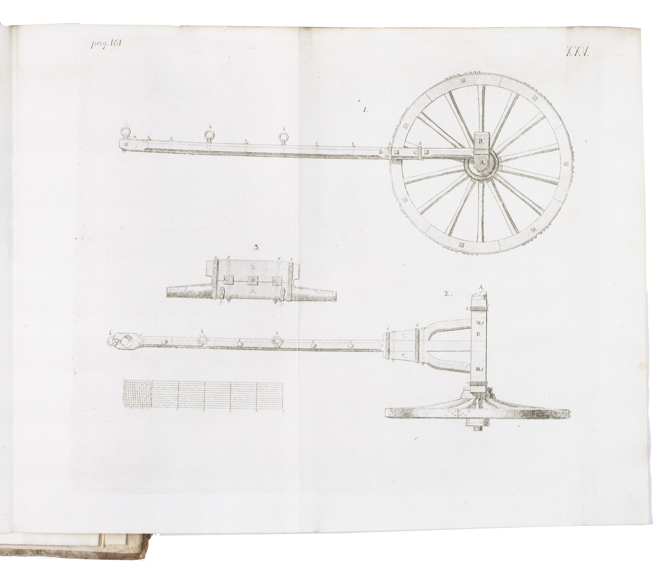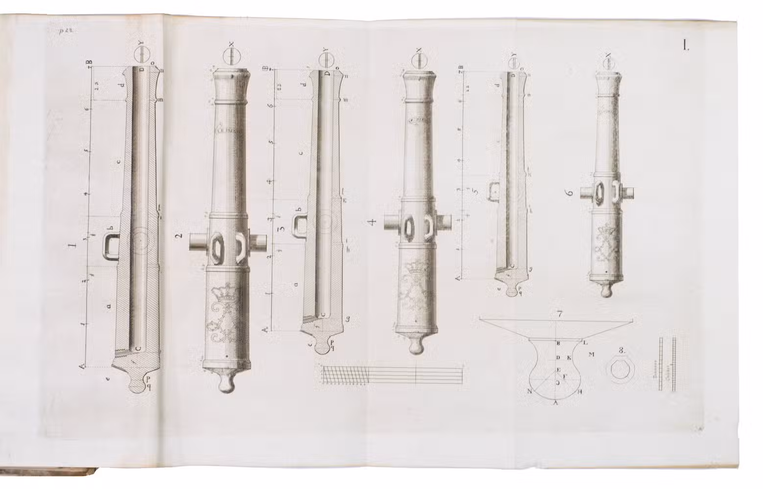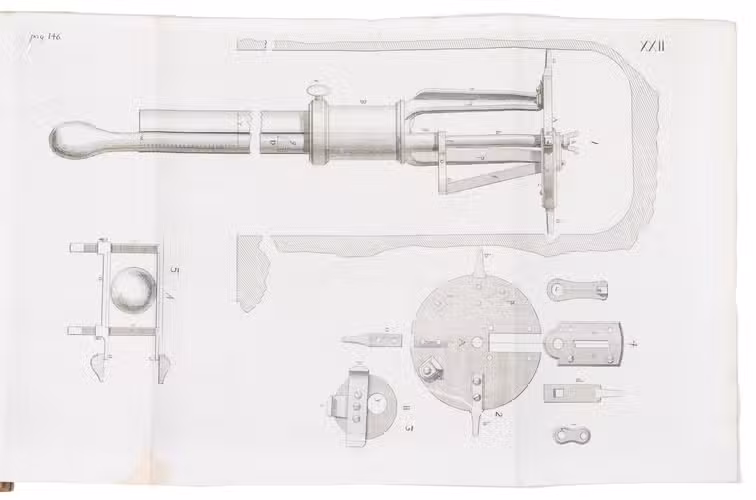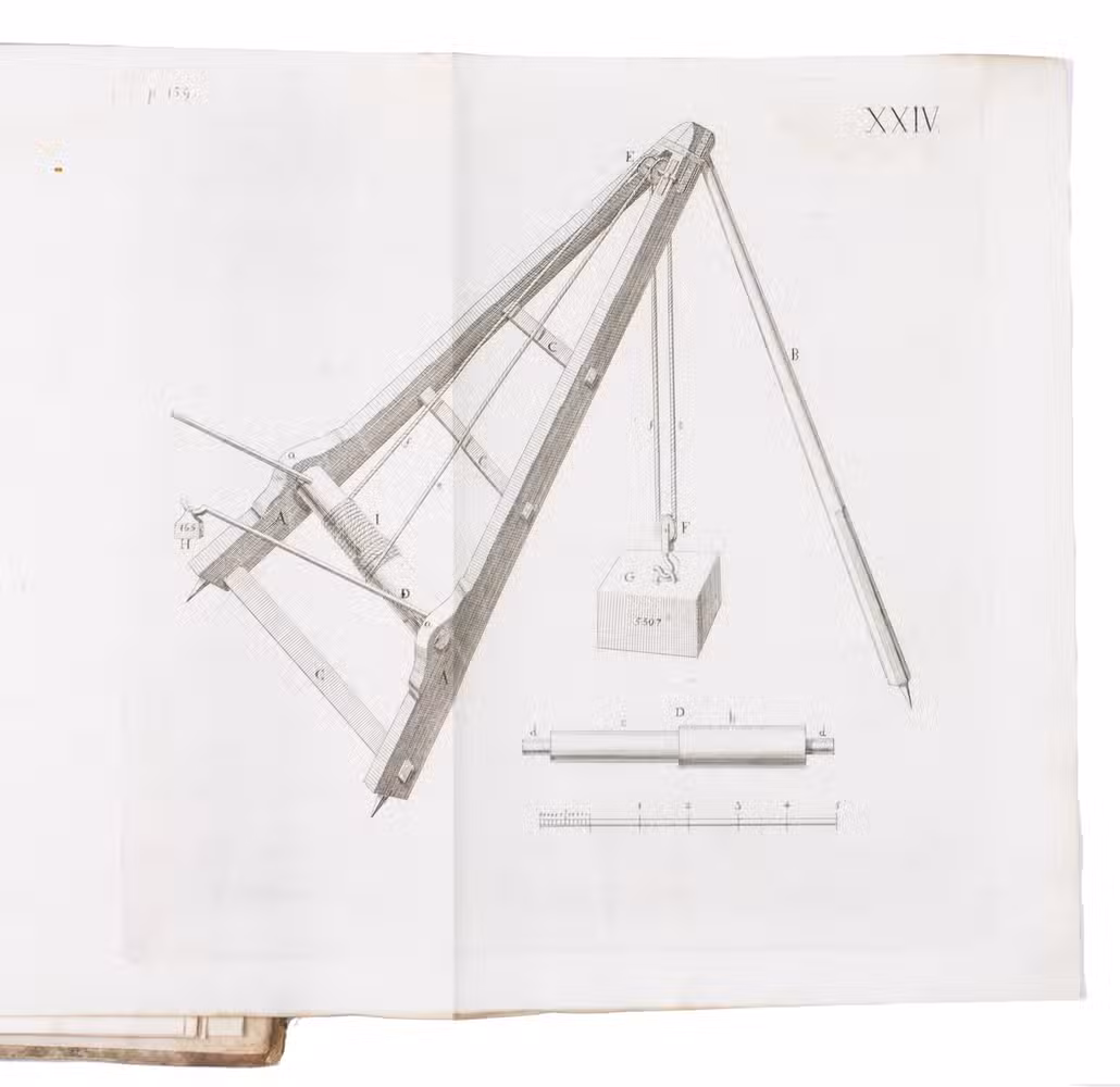 First edition of a work on the artillery of the French army, written by Heinrich Otto de Scheel, officer in the Danish army. It deals with the "artillerie nouvelle" following the changes made in the French army in 1765. The first part of the book deals with these changes individually, commenting on new regulations for the artillery during sieges, offence, defence, campaigns, etc. The second part sets out the various objections that had been made against the changes, with comments by the author. The plates depict different types of canons, machinery, siege engines, and more.