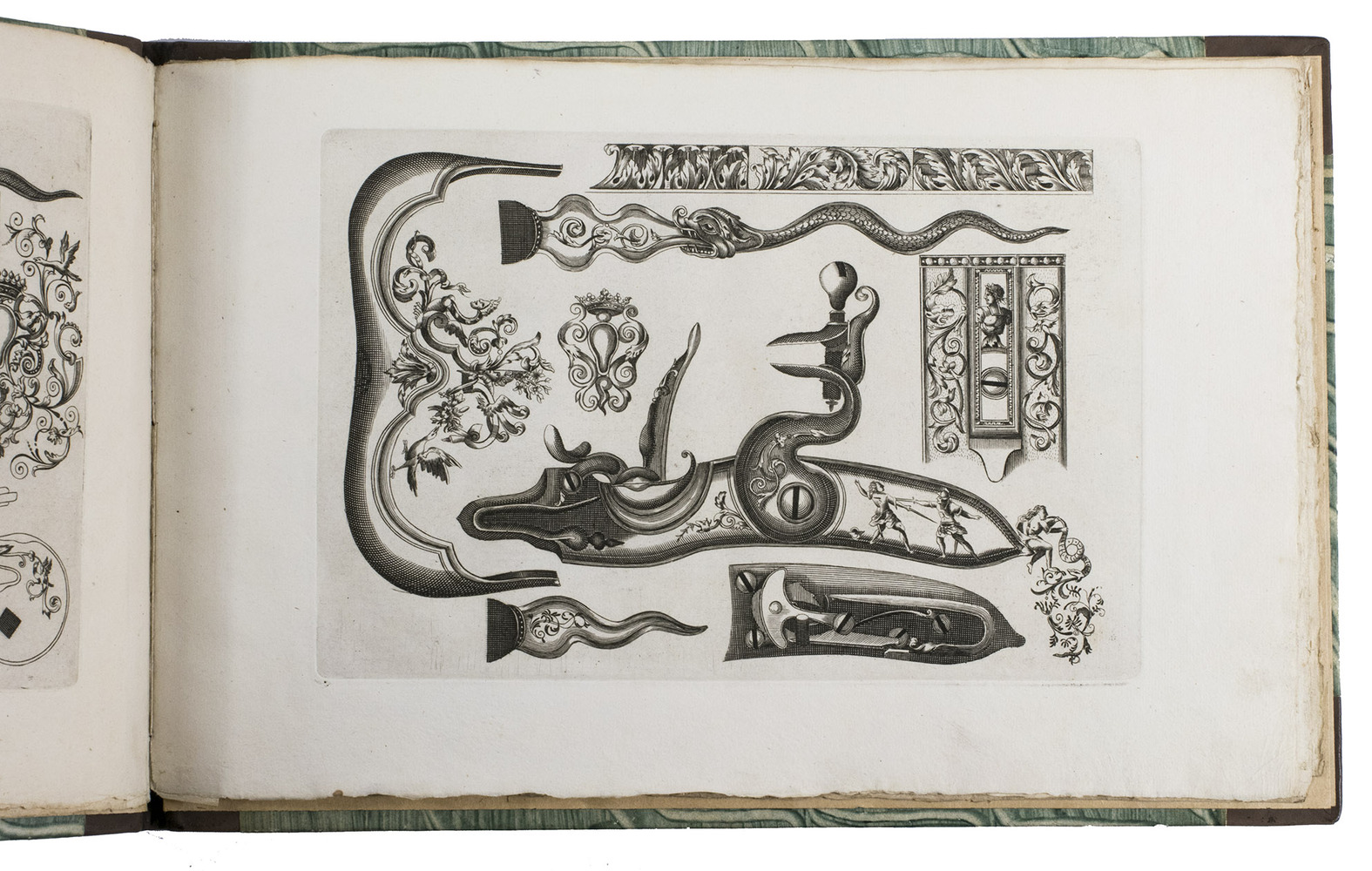Very rare complete and uncut copy of an expertly engraved pattern book for decorated firearms by the German engraver Petrus Schenk I (1660-1711), after the French designer of gun fittings and ornamental engraver Claude Simonin (ca. 1635-1721).