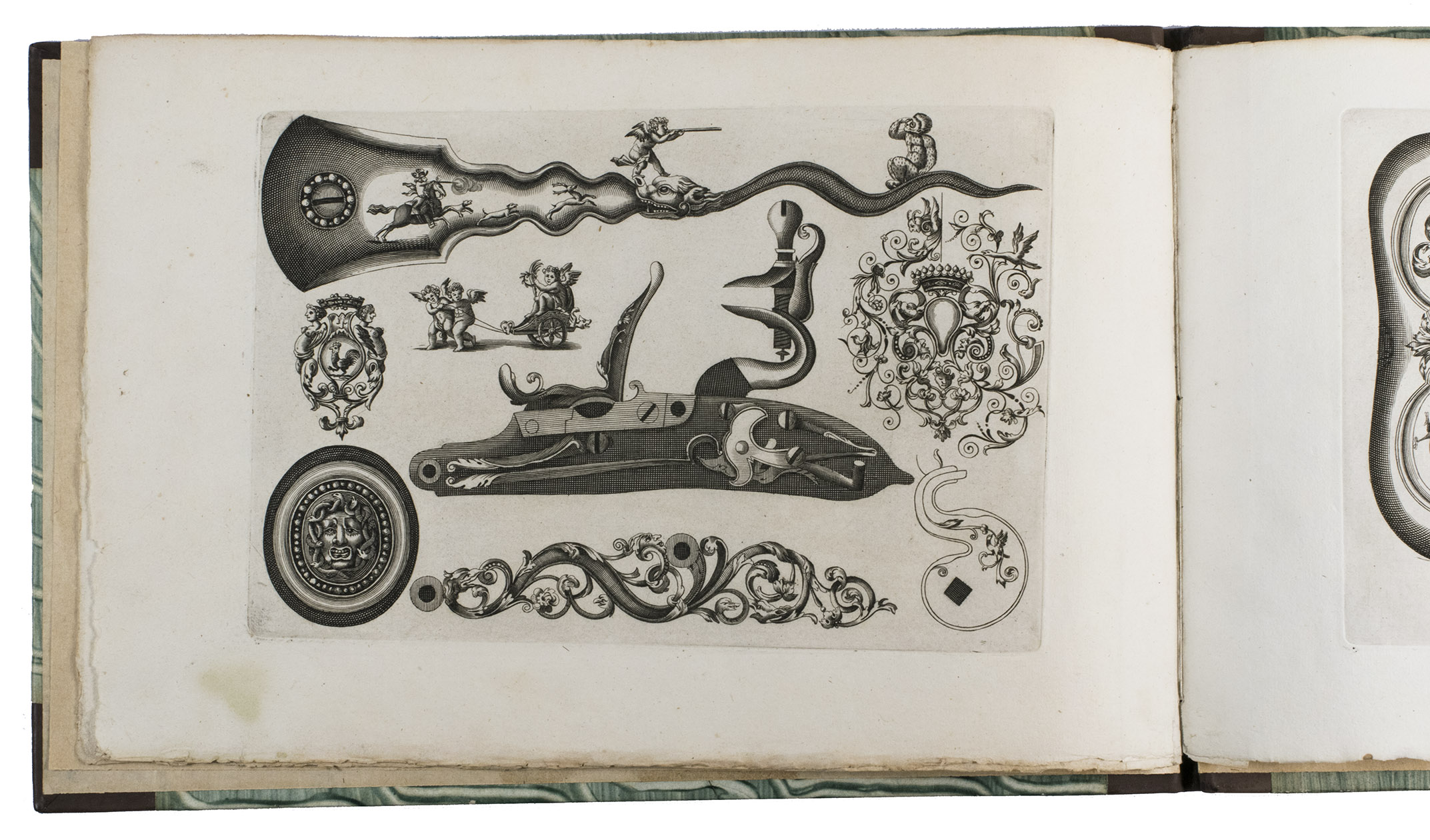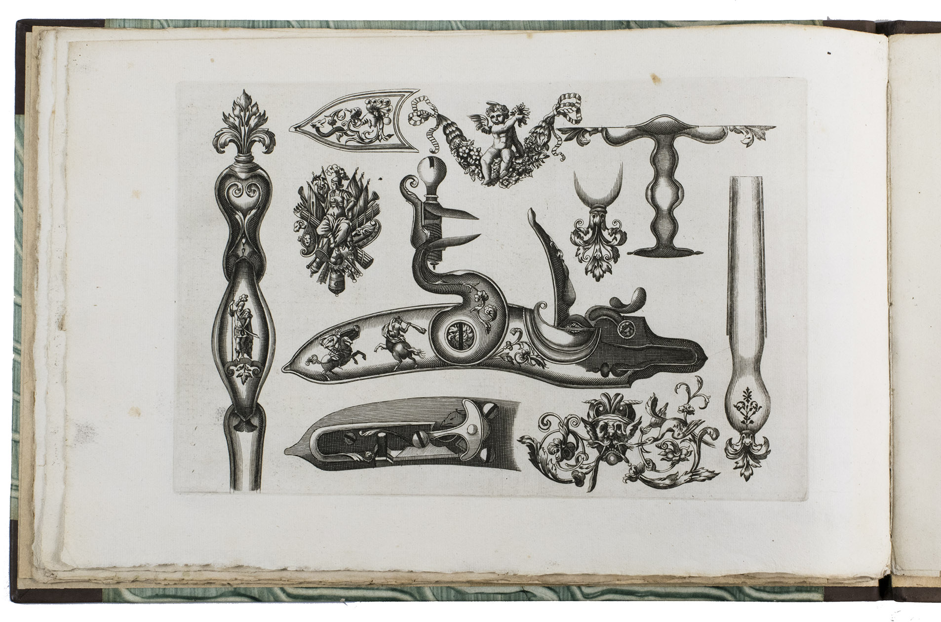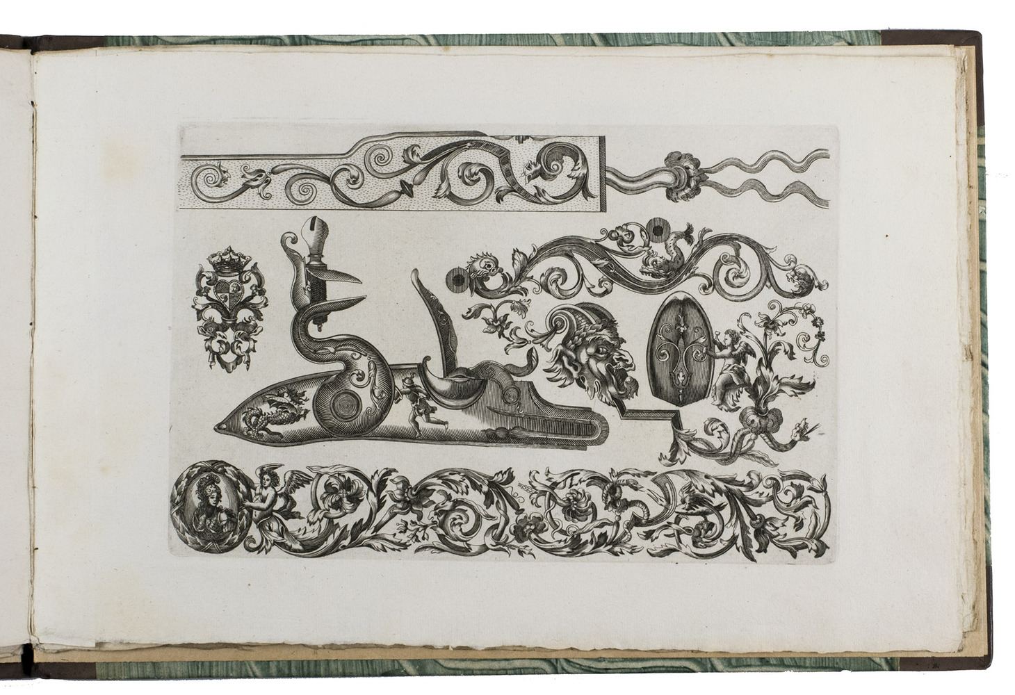 Amsterdam, Petrus Schenk, 1692. Oblong folio. With an engraved allegorical title page and 7 expertly engraved plates of ornamental designs on arquebuses. Modern half calf and green decorated paper sides. [8] ll.