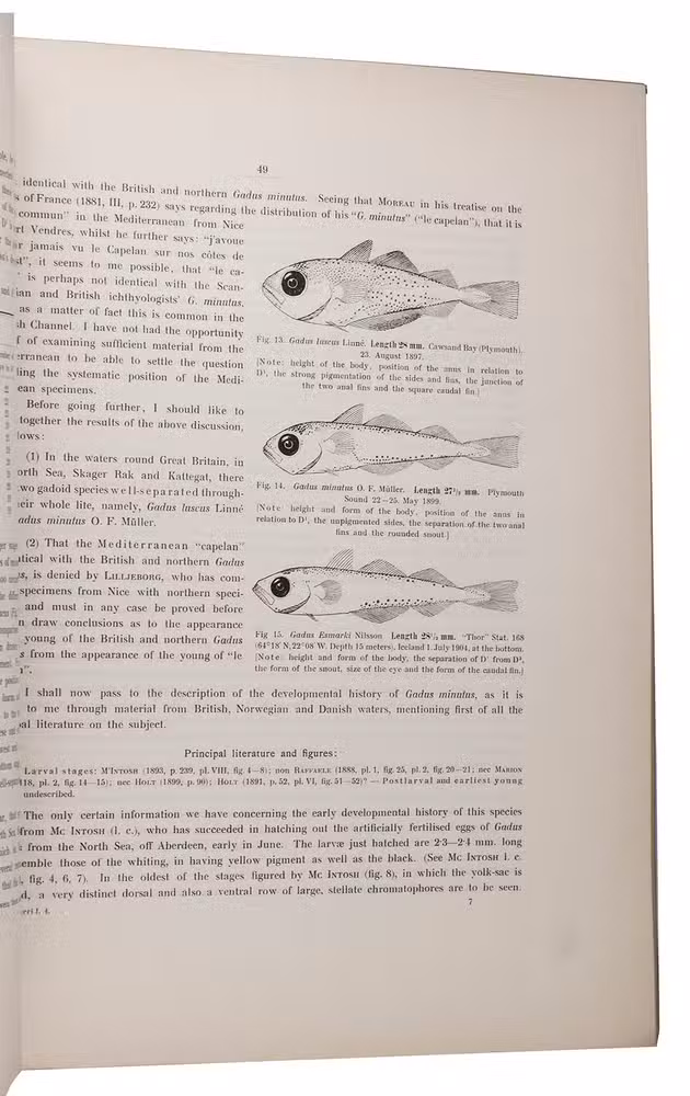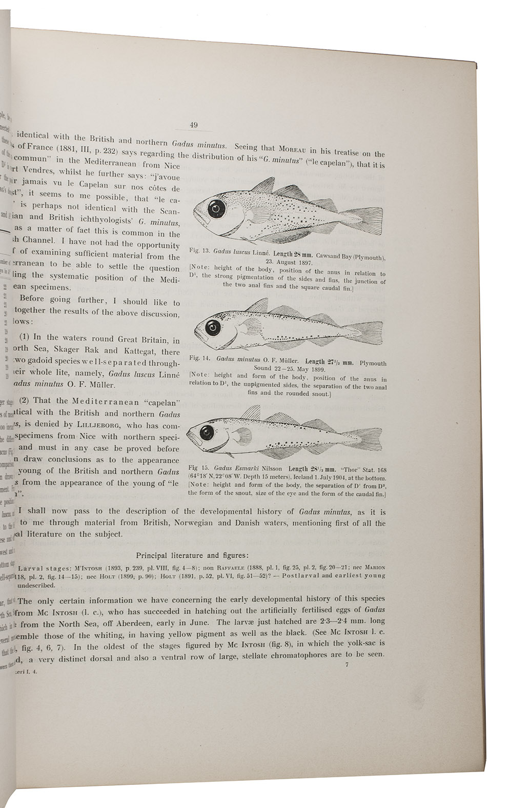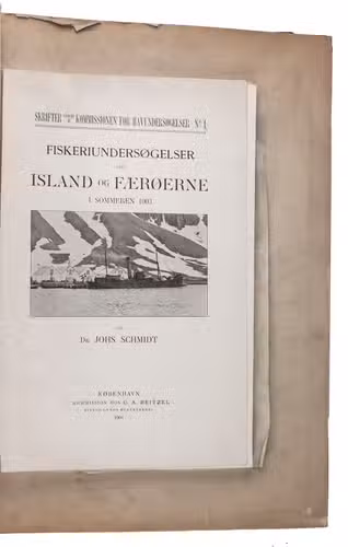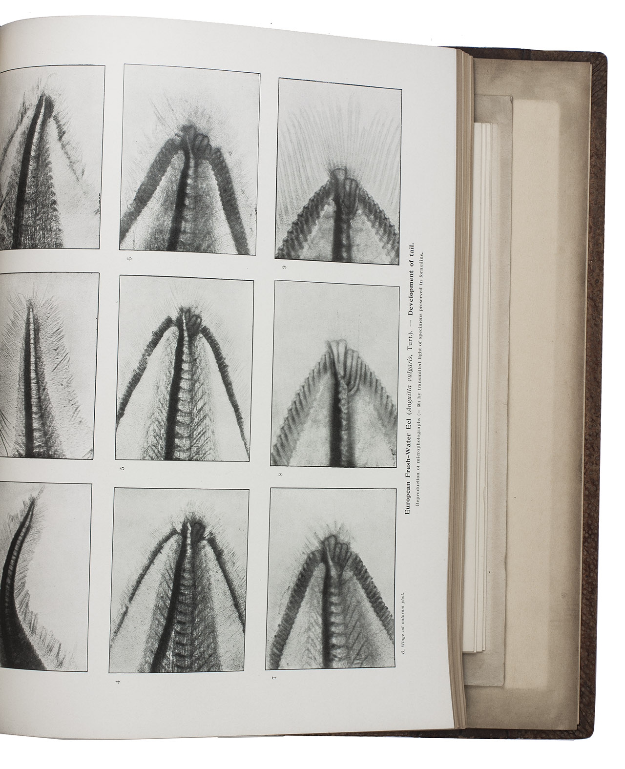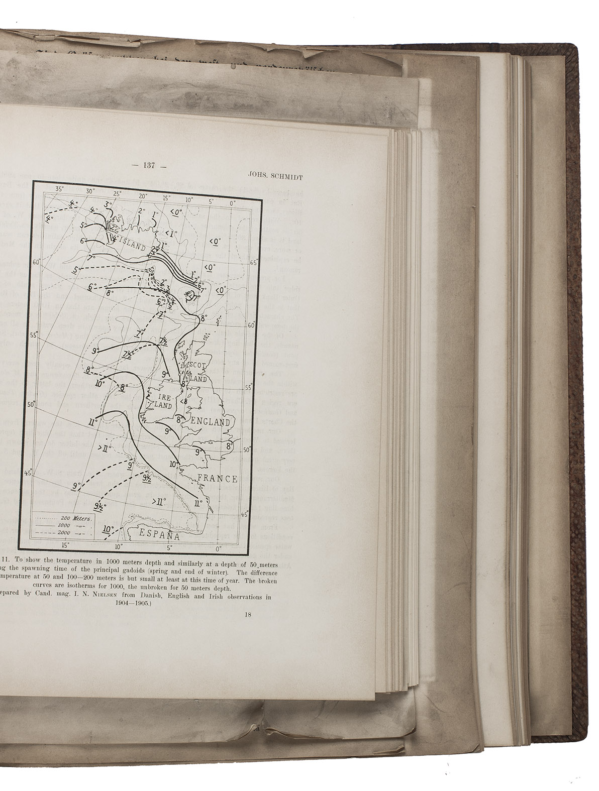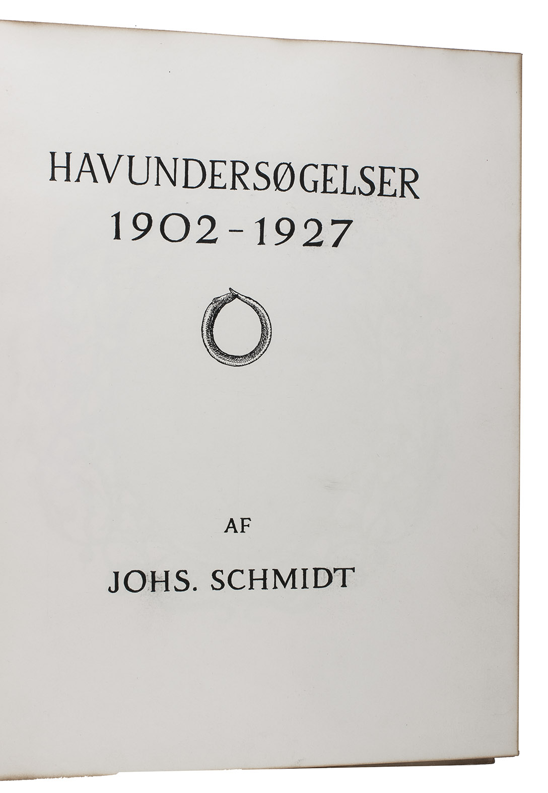 Huge volume containing an important collection of articles and papers on fish and especially eels, by the Danish biologist Ernst Johannes Schmidt (1877-1933), probably all his papers published in this period. Schmidt is best known for his findings on the migration patterns and breeding places of the eel, which he researched during various Danish expeditions in the North Atlantic Ocean and the Mediterranean Sea. He also, accidently, caught the first leptocephalus larva outside the Mediterranean Sea, which are also discussed in many of the papers. The book opens with a general title-page Havundersøgelser (Ocean studies), followed by a portrait, a letter and all the articles. Most of them are written in English, although a few are in Danish, German or French. Discussed in the articles are eels and their larvae, cod, halibut, sun-fishes and other fish, and one deals with various turtle species in the Danish West Indies. Many of the articles include illustrations in text, folding plates, maps and/or tables, showing migration routes, a fish's growth stages etc. Full list of contents available on request.