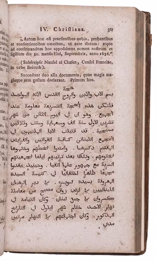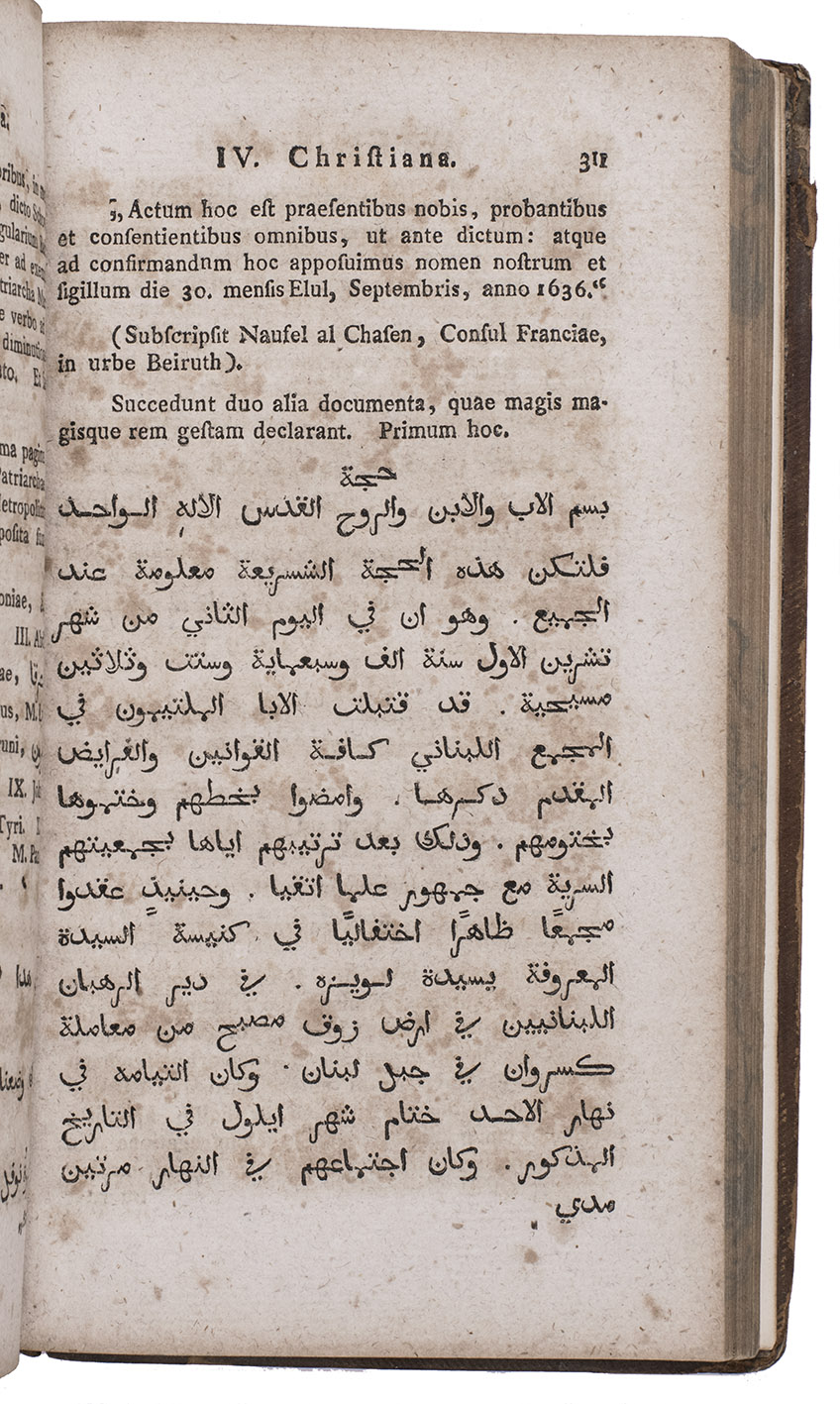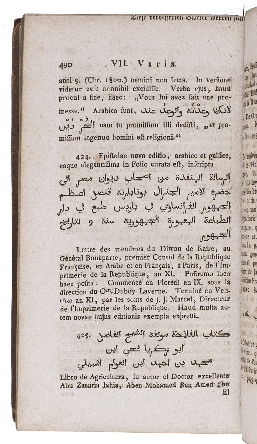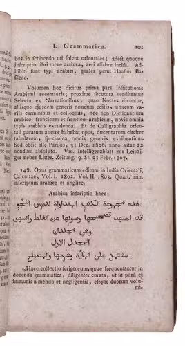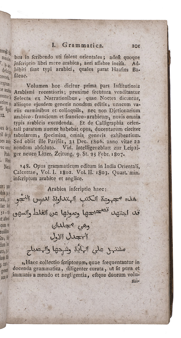 First combined edition of a pioneering Latin bibliography of Western Arabic scholarship, describing about 500 editions of Arabic works and books about Arabic language and literature, first published in 7 parts from 1799 to 1806. "The first and only comprehensive bibliography of Arabic texts and books on Arabic language and literature by European scholars" (Breslauer & Floter). The publications are arranged by subject matter and some of the entries include extensive comments (further comments appear at the beginning and end of each part). The seven parts were written and compiled under the guidance of Christian Friedrich Schnurrer (1742-1822) by 31 of his students as theses at the University of Tubingen. He was clearly the spiritual father of the work and is usually regarded as its "author".