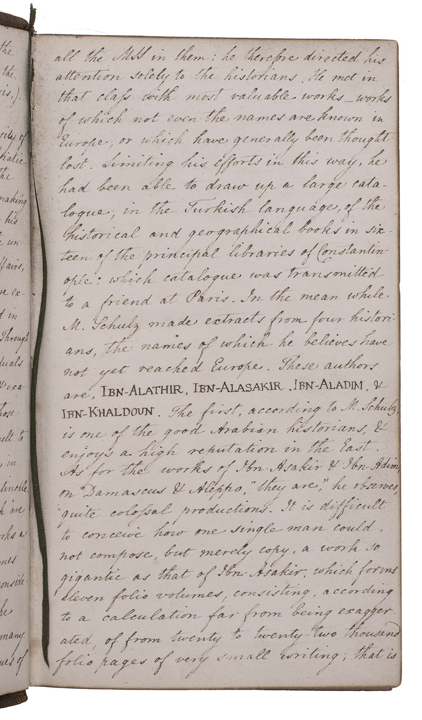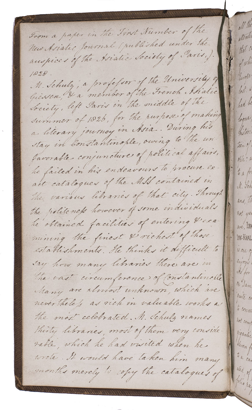 With on the endpapers a long manuscript note in English describing the journey of M. Schulz (probably the German orientalist Friedrich Eduard Schulz, 1799-1829) visiting 30 libraries in the region of Constantinople and the manuscripts he saw there. Of special importance are named those of Ibn Alathir, Ibn Alasakir, Ibn Aladim and Ibn Khaldoun.