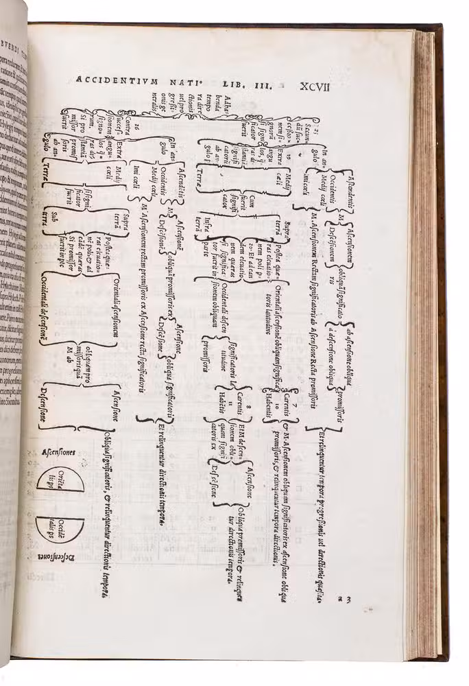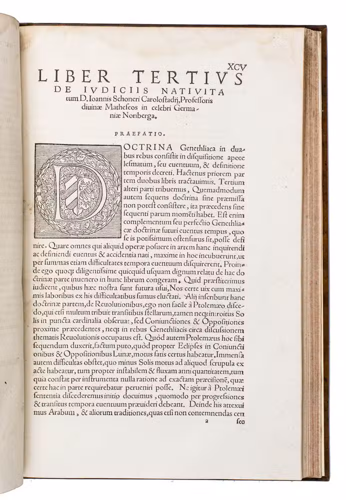 Rare first and only edition in Latin of the main astronomical and astrological work written by the German polymath Johannes Schöner (1477-1547) concerning the judgements of nativities and the method of finding the ascendant at birth. In 1543, Copernicus ground-breaking work De revolutionibus orbium coelestium (On the revolutions of the heavenly spheres) was published in Nuremberg, an endeavour in which Schöner was partially involved by encouraging Copernicus to publish his magnum opus, replacing the geocentric model of the universe (the Ptolemaic System) with the heliocentric model. "... although preferring the method of Ptolemy in astrological judgments, Schöner maintained that the Copernican model was not unfavorable to astrology" (Thorndike).