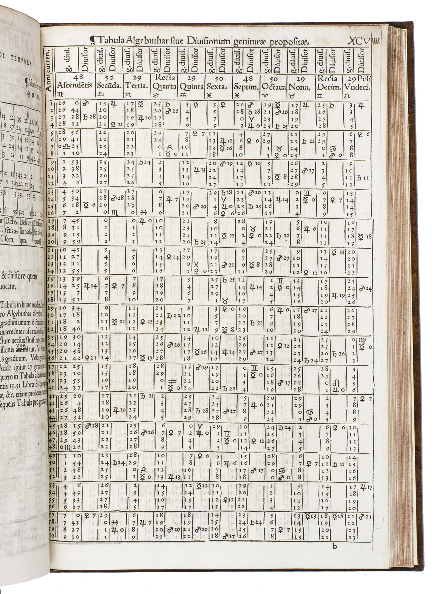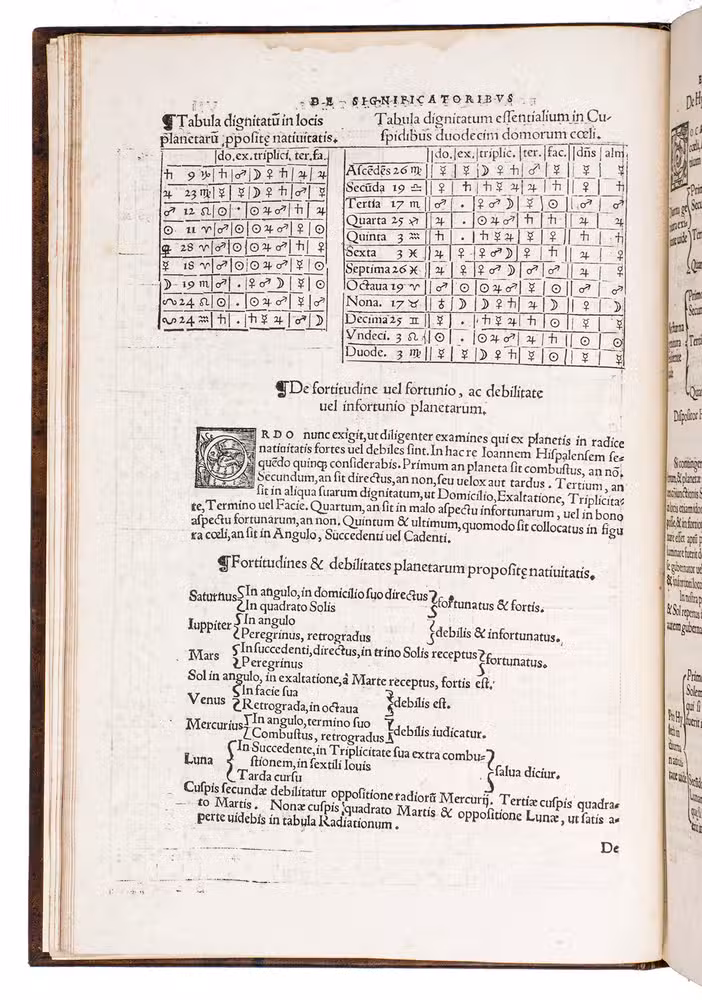 Nuremberg, Johann vom Berg and Ulrich Neuber, 1545. Folio (ca. 29 x 19.5 cm). With a woodcut headpiece and vignette on the title page, a large woodcut printer's device with the Latin motto "Hic est filius meus dilectus: in quo mihi bene complacitu est" on the verso of the last leaf. Further with numerous envelope horoscope diagrams, letterpress tables (incorporating the signs of the zodiac), and decorated woodcut initials in the text. Modern gold-tooled sprinkled leather. [8], CLII ll.