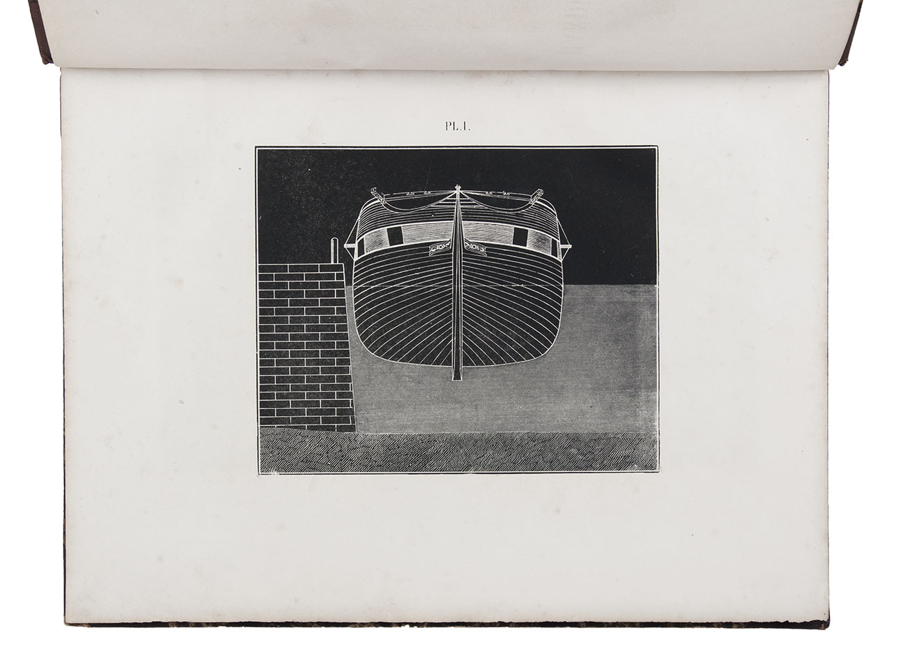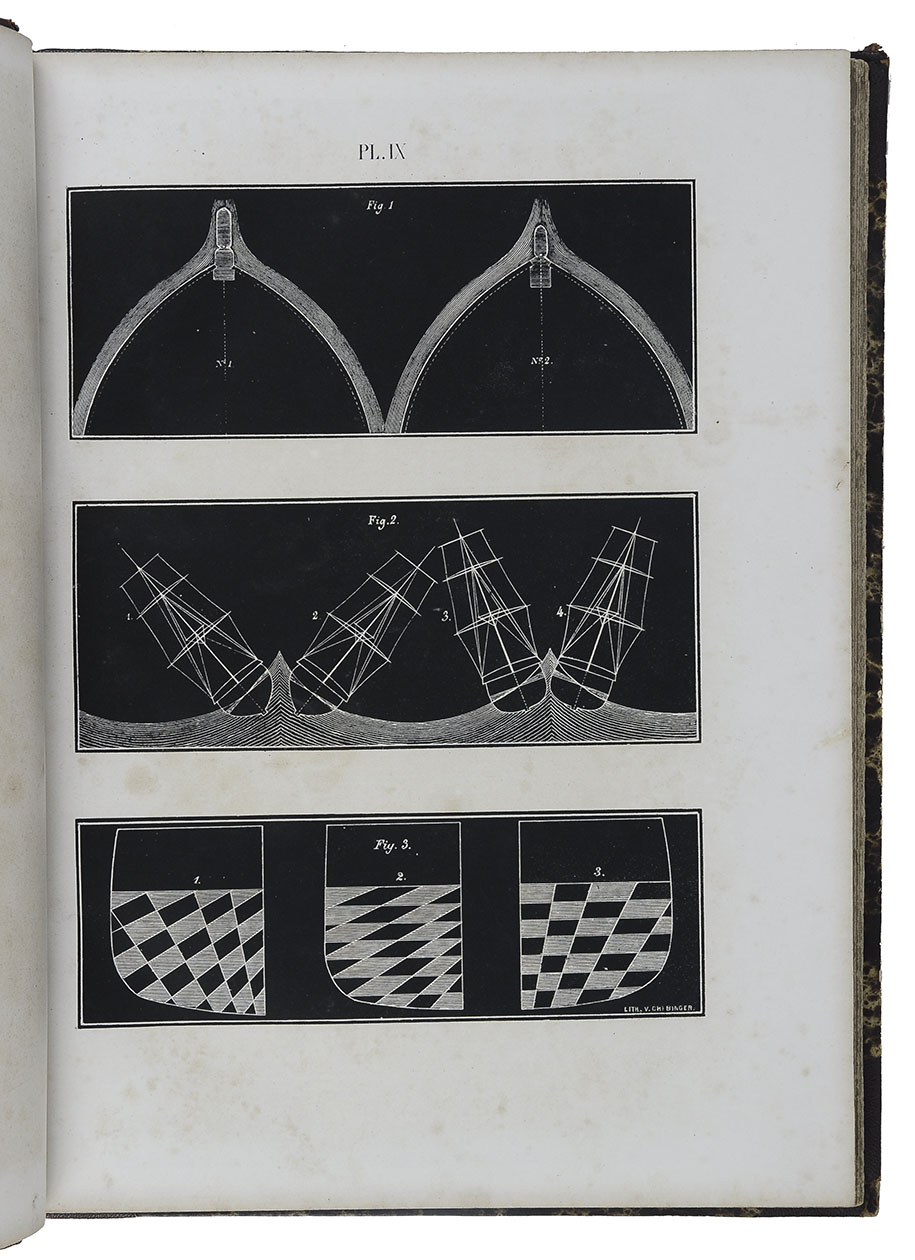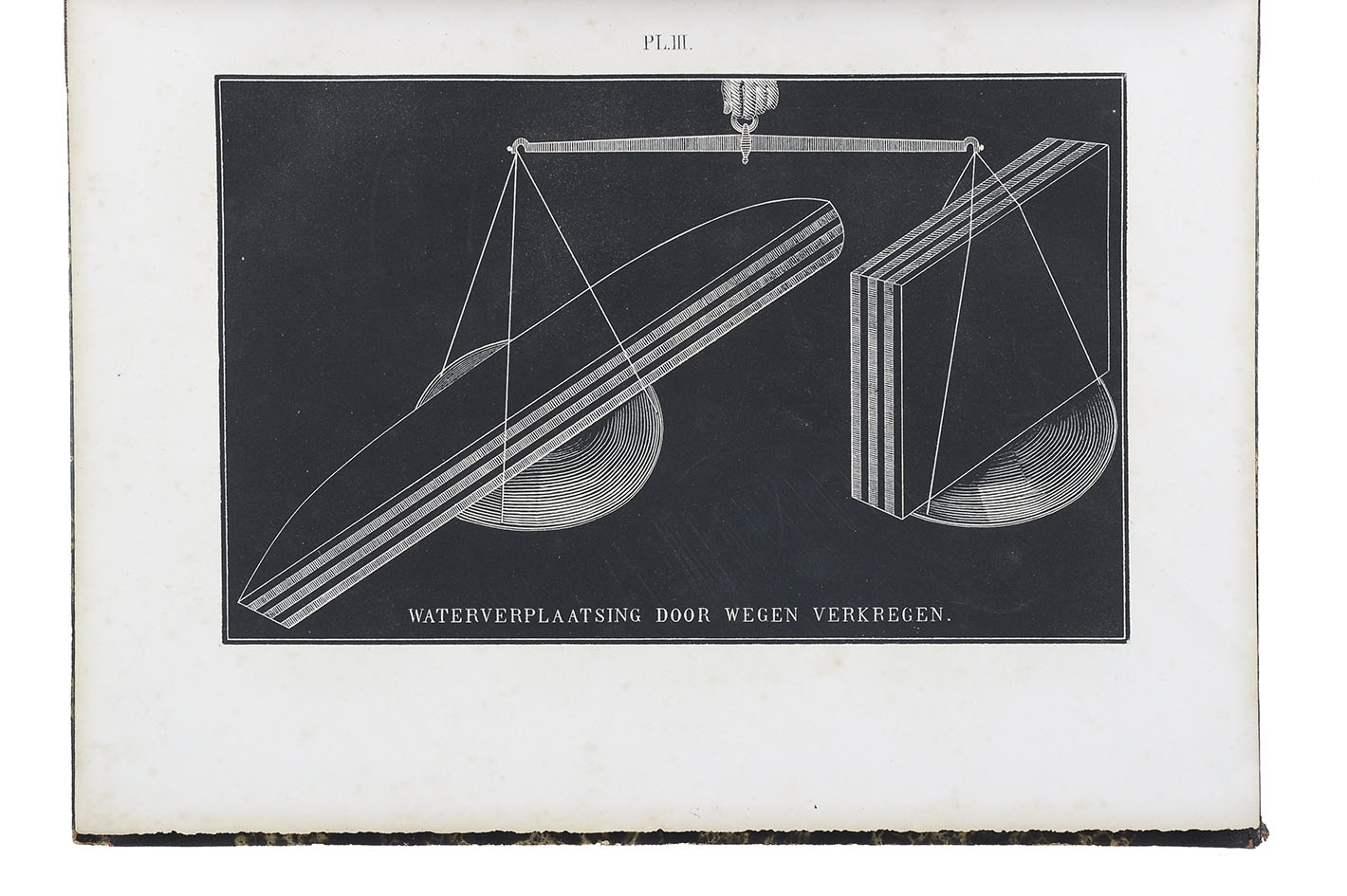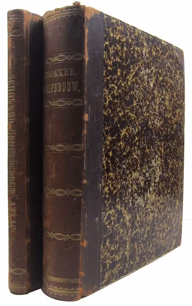 First and only edition of an extensive and well-illustrated Dutch manual on shipbuilding, according to the title-page based on the works of the American naval architect John W. Griffiths (1809-1882) but actually for the most part directly translated from Griffiths's well-known Treatise on marine and naval architecture, or, theory and practice blended in ship building, first published in 1850. Also the black on white plates are copied, but of very high quality, making it an attractive Dutch translation.