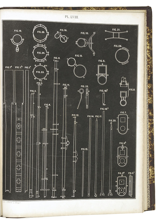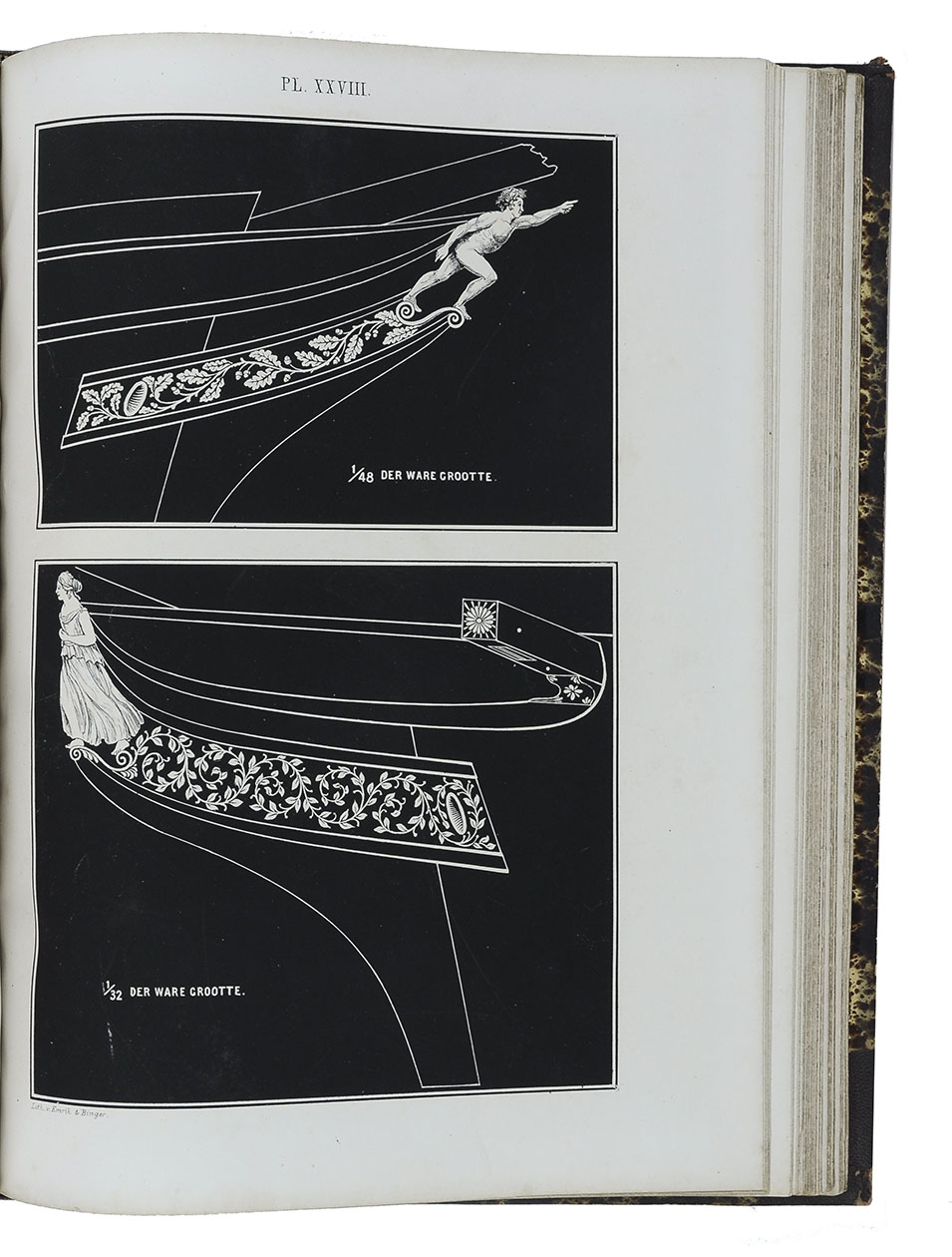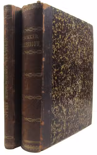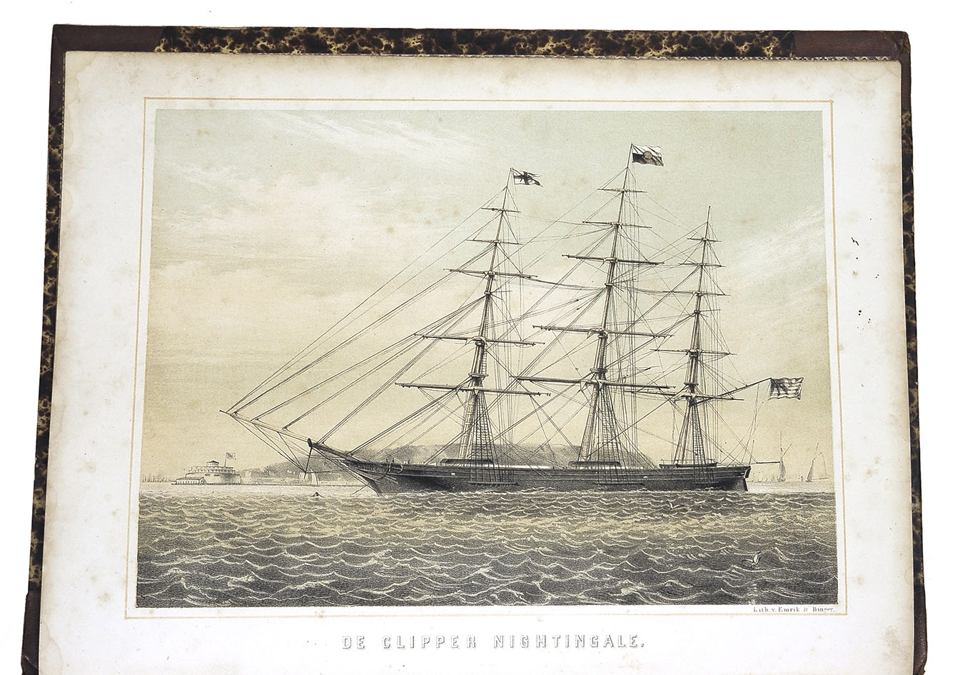 Amsterdam, Kraay brothers, 1861. 2 volumes. Large 4to (32 x 25 cm). With a chromolithographed view of the ship Nightingale as frontispiece, 2 folding tables, and 8 white on black lithographed illustrations and numerous tables in text. Further with 69 white on black lithographed plates (numbered as 60: I-LX) in the atlas volume, lithographed by Emrik & Binger, Haarlem. Contemporary half morocco, gold-tooled spine. XI, [1 blank], 805, [1 blank] pp. text