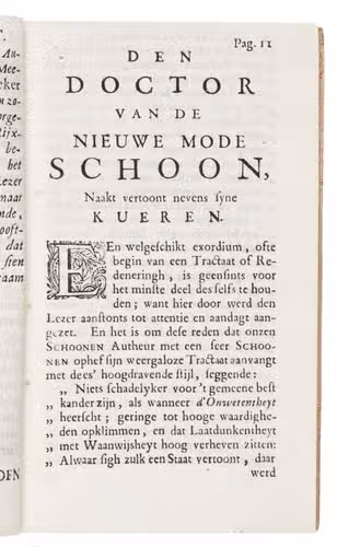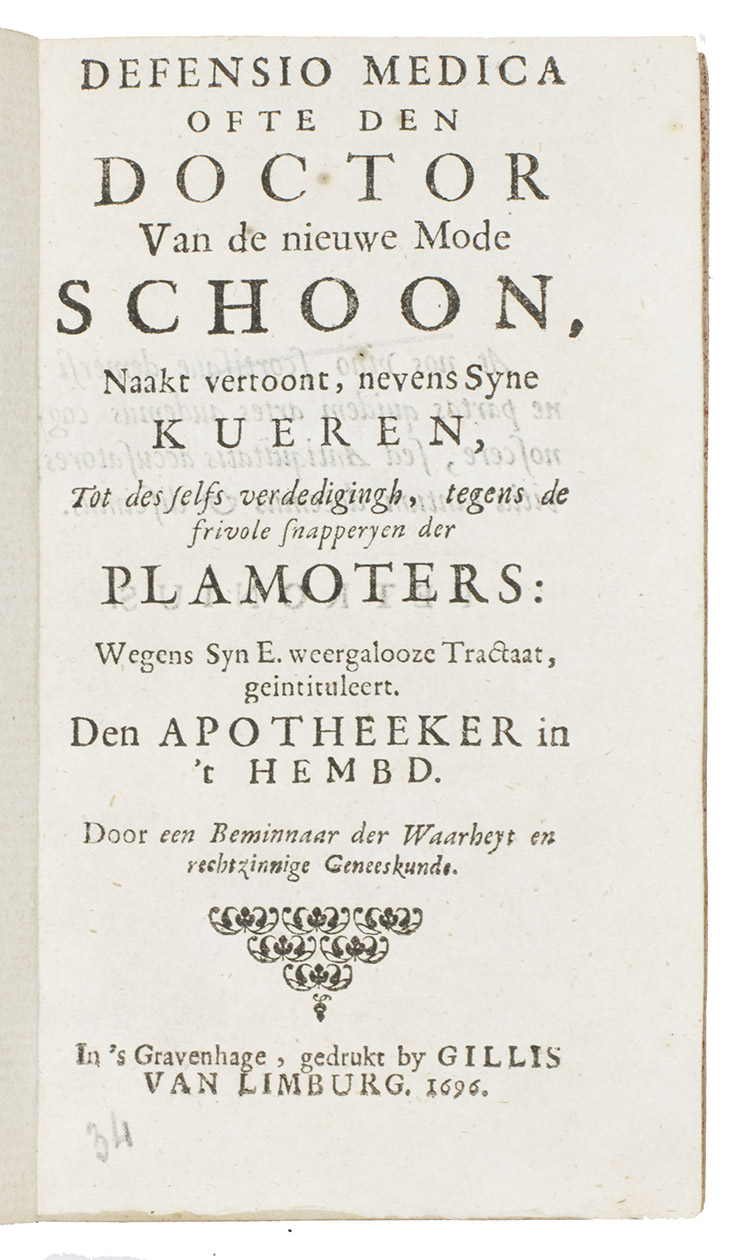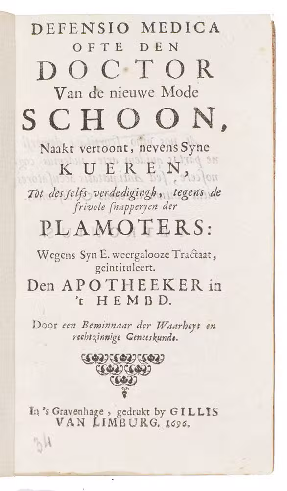 Defensio medica ofte den doctor van de nieuwe mode Schoon, naakt vertoont, nevens syne kueren, tot des selfs verdedigingh, tegens de frivole snapperyen der plamoters: wegen syn E. weergalooze tractaat, geintituleert, Den apotheker in t hembd. Door een beminnaar der waarheyt en rechtzinnige geneeskunde.