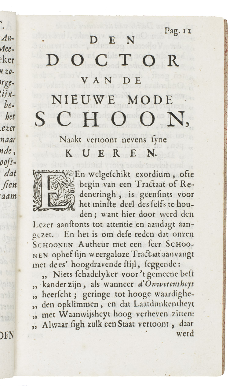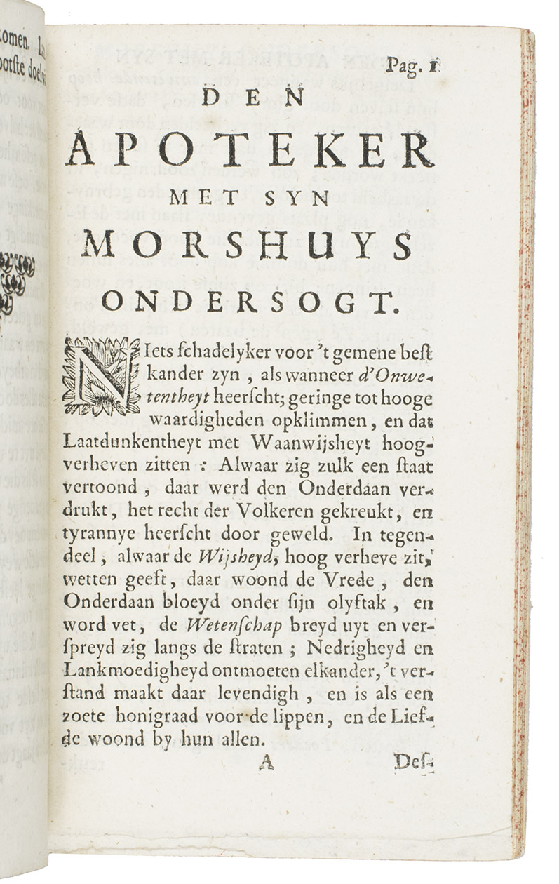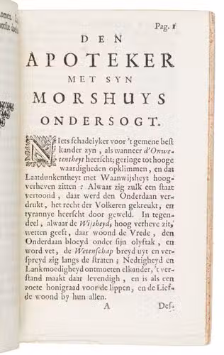 Ad 2: Very rare first and only edition of a fierce diatribe by Theodorus Schoon against the evil practices of the ignorant, obscure and lazy pharmacists and their helpers (the so-called "plamoters": filthy louts or ragamuffins), especially in The Hague, and the "Galen-physicians" who make use of their services, on payment and/or bribes of wine and Dutch gin, prescribing the most deadly and decayed "medicaments" often leading to the patients death instead of healing. Schoon proposes to solve the problem by submitting the pharmacists and assistants to a legally mandated examination overseen by leading physicians. The accusations created a great stir. Many counter attacks were launched.Ad 1: A third counterattack written by an anonymous author or group of authors, which is a "civilized", albeit arrogant and vitriolic pseudo-defense of Theodorus Schoon, without pursuing the matter further, dated The Hague, 24 June 1696, and signed by the initials of some pharmacists of The Hague.