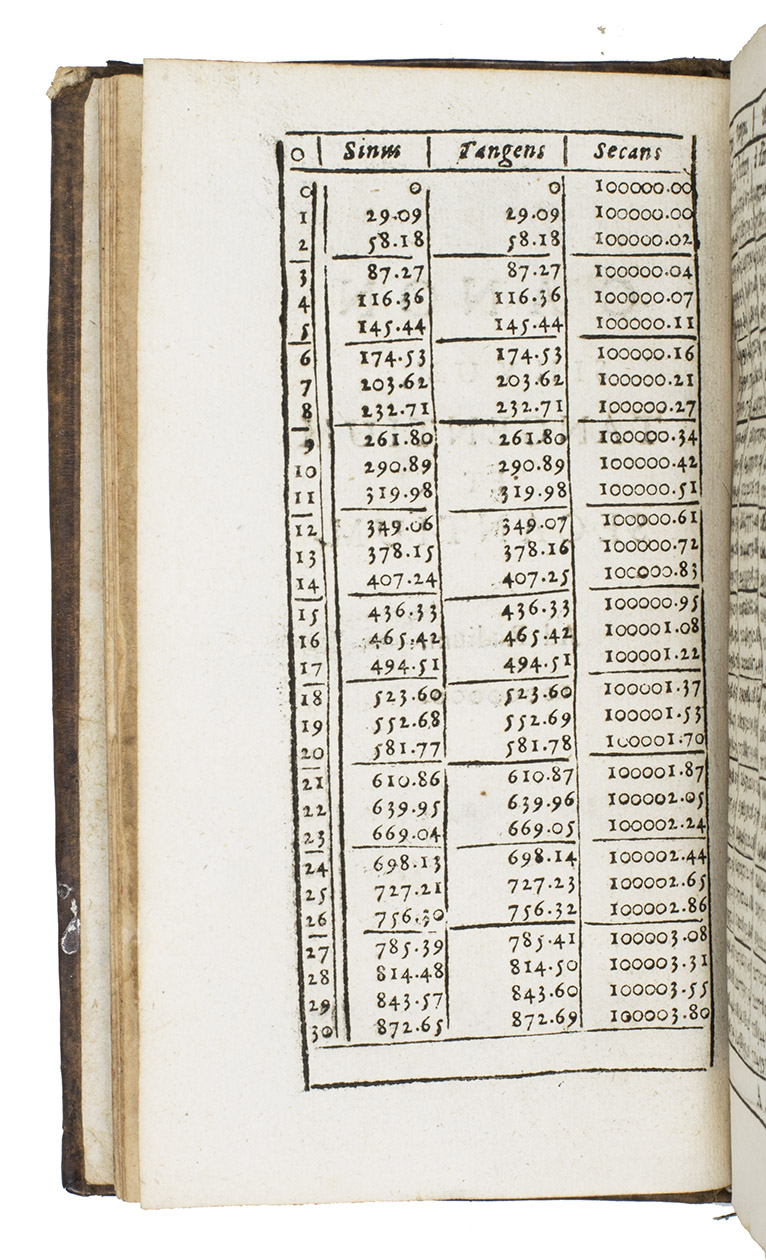 Frans van Schooten the elder (1581-1645) was a professor in the engineering school in Leiden. He made a significant improvement on the tables published by Albert Girard, which were based on a radius of 100,000. Schootens tables were reprinted (without acknowledgment) by Jan Jansz.