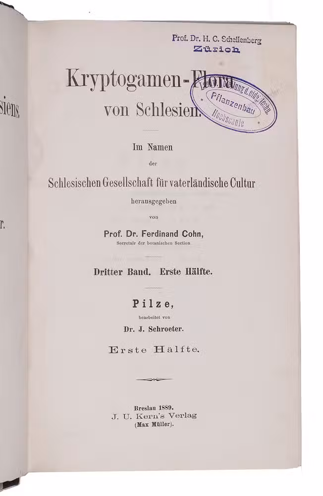 First edition of an extensive "flora" of the fungi of Silesia, written by the Polish mycologist Joseph Schröter (1837-1894). It was published as the third volume of the Krypogamen-Flora von Schlesien of Ferdinand Cohn.