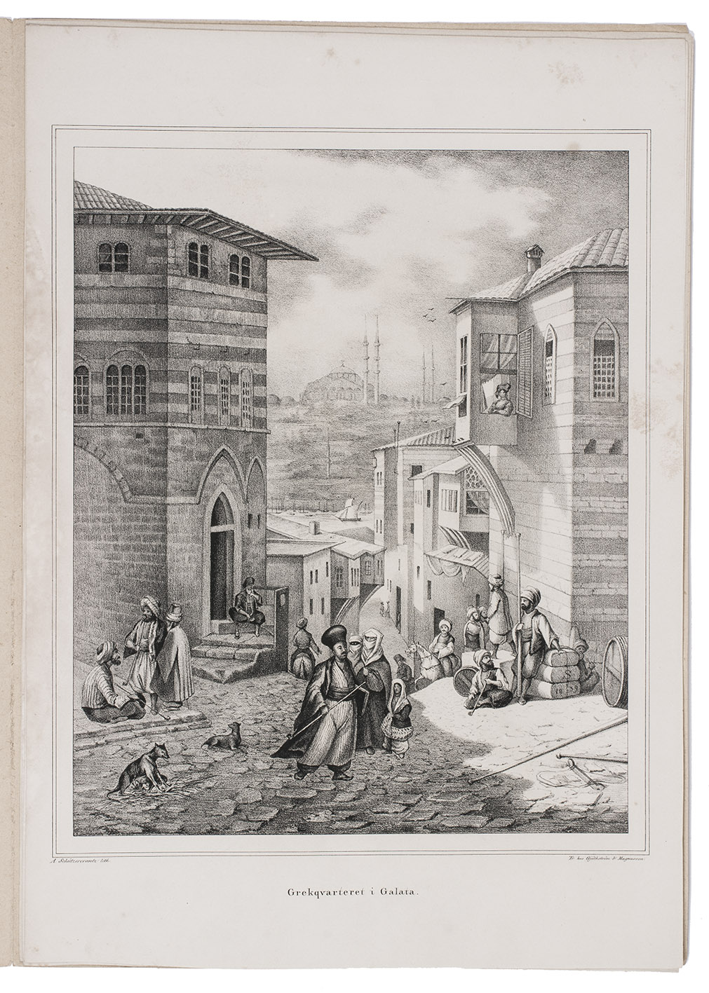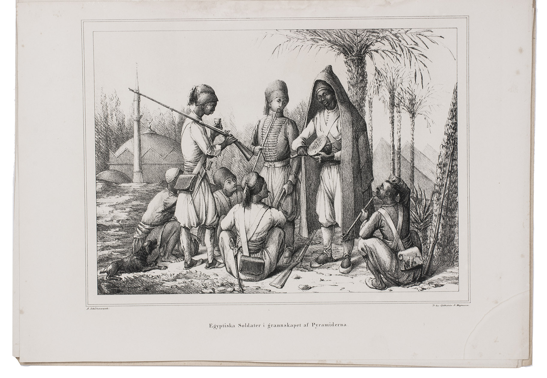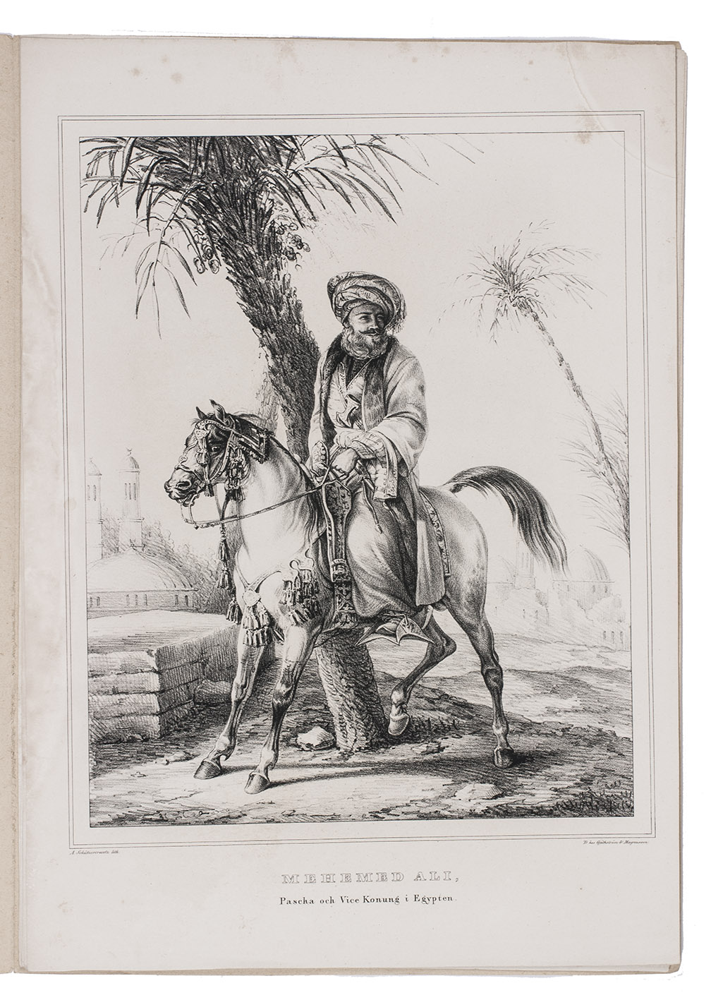 Very rare first edition of a series of 6 lithographed plates, illustrating a journey to the Ottoman Empire, Egypt and Greece, drawn and lithographed by the Swedish artist Adolf Ulrik Schützercrantz (1802-1854). In 1838 he visited Greece, Istanbul and Cairo. The lithographs include a portrait of the Ottoman Sultan Mahmud II (1785-1839) in full dress; Muhammad Ali (1769-1848), Pasha of Egypt, depicted on horseback; an Ottoman garrison at rest in Constantinople; a view of the Galata neighbourhood in Constantinople, with people in the streets; some Egyptian soldiers with pyramids in the background; and three Greek men in Athens. The plates are followed by 4 pages of descriptive text, all loosely inserted in a paper folder.