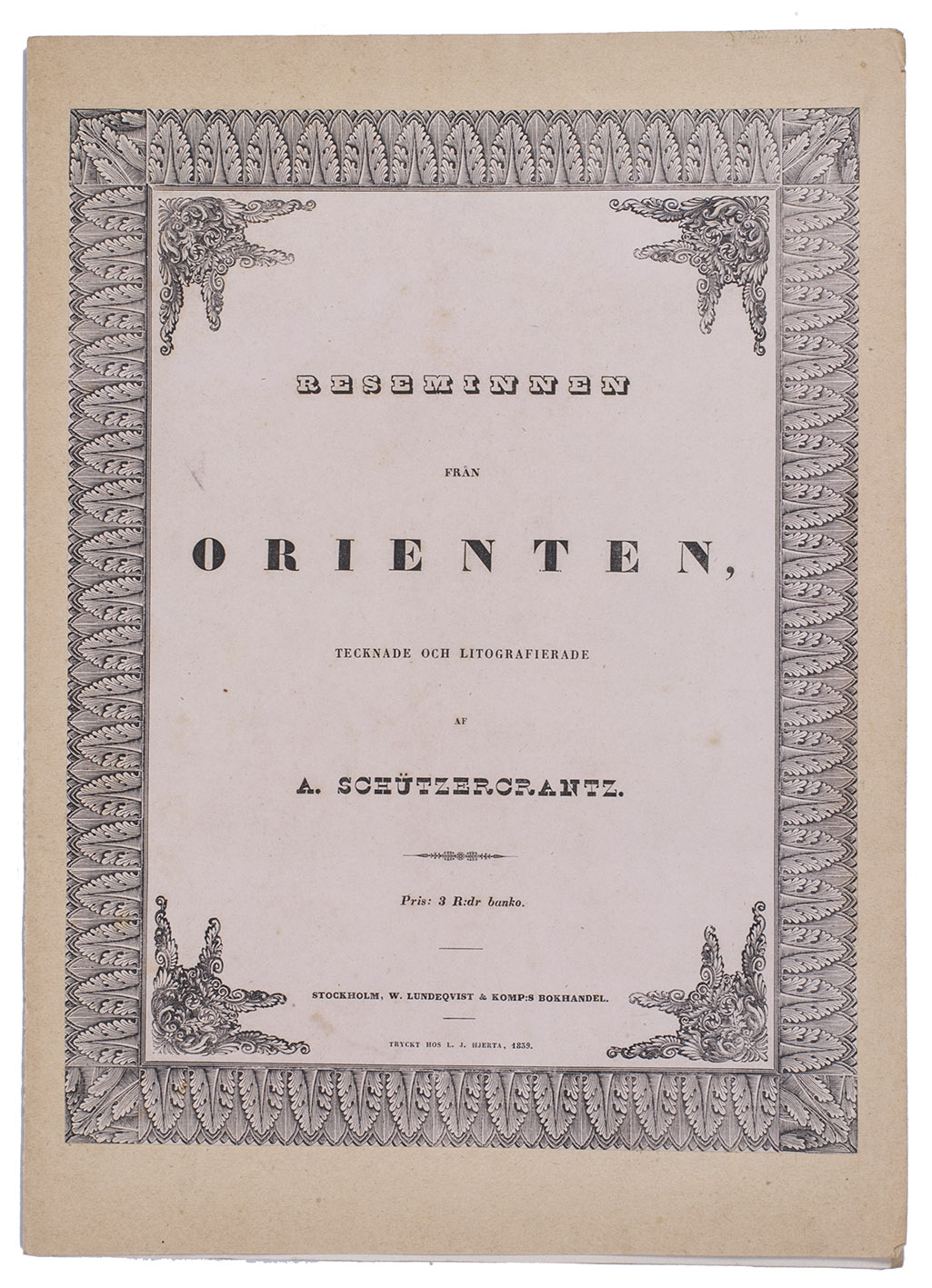 Stockholm, L.J. Hjerta, 1839. Folio. With 6 lithographed plates by Schützercrantz. Original publisher's printed paper wrappers mounted on a larger sheet serving as a folder. 4 pp.