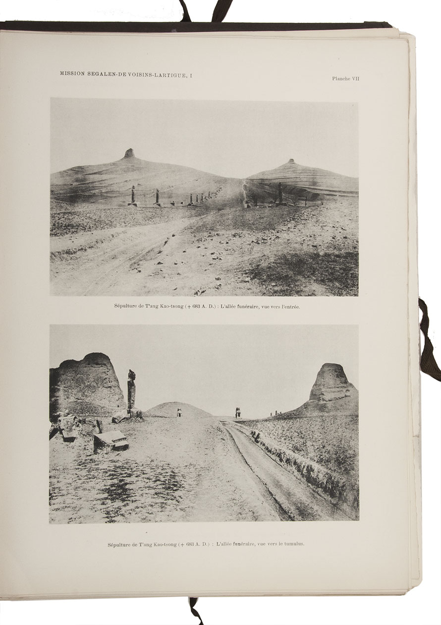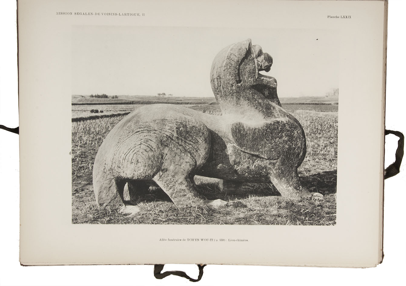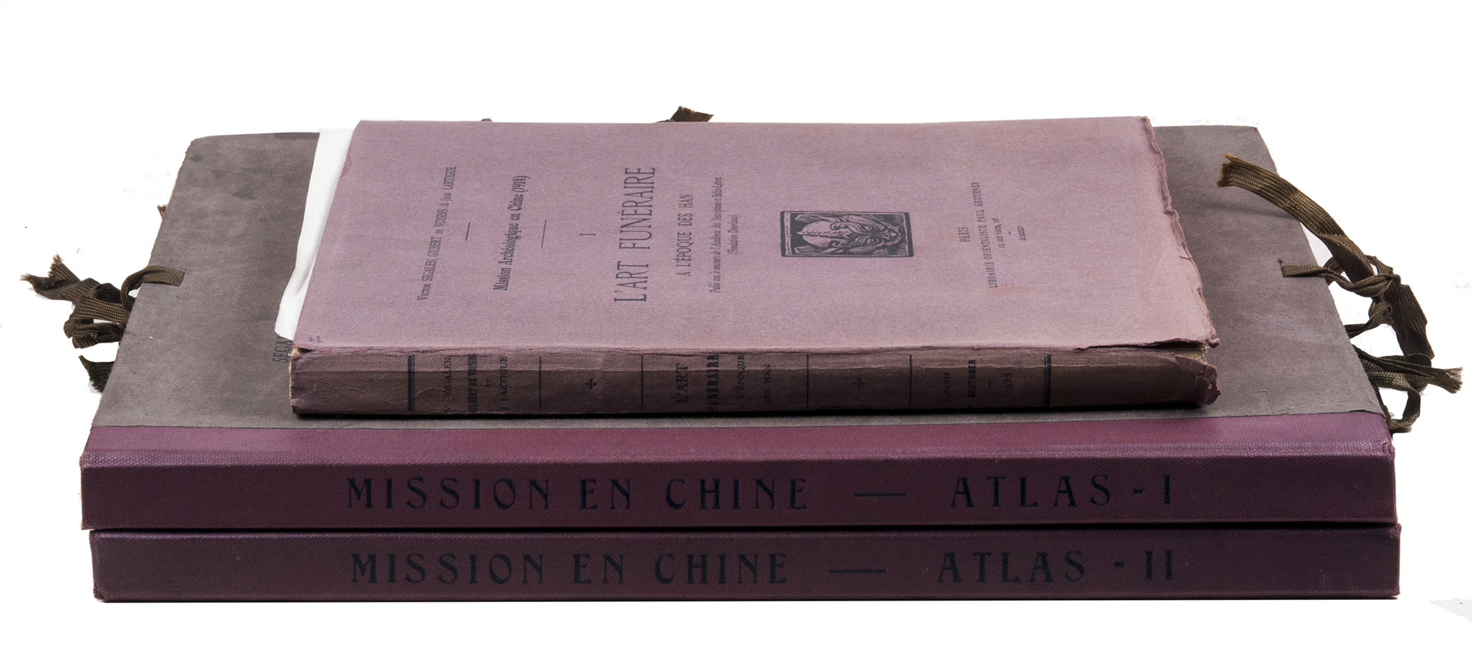 First edition of an art-historical work on Chinese funeral monuments, dating mainly from the Han dynasty. The work was compiled and written by the French archaeologists Gilbert de Voisins (1877-1939), Jean Lartigue (1886-1940) and Victor Segalen (1878-1919), who was in charge of the expedition. The expedition was cut short due to the First World War. The two atlases contain 144 loose collotype plates, showing statues, tombs, mausoleums, reliefs and monuments as well as some of the sites, covering the areas of Nanjing, Shanxi and Sichuan. Scolarly descriptions of the plates are given in the text volume, along with small maps of the area, plans of the excavation sites and tombs and schematic reproductions of the artefacts.