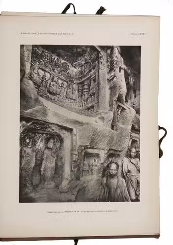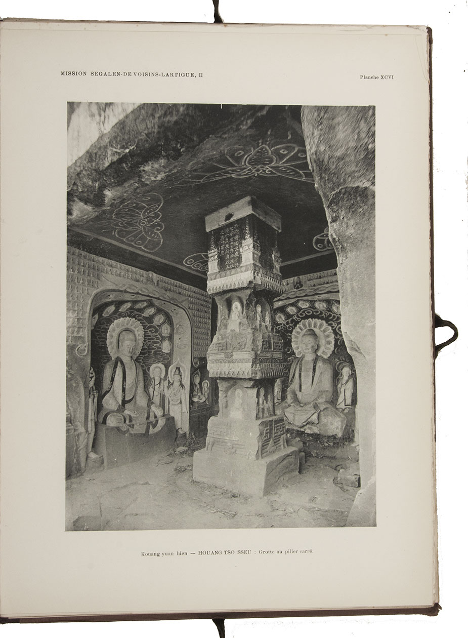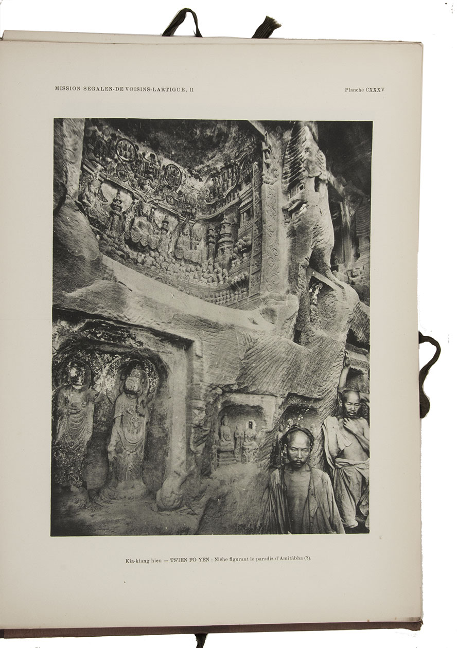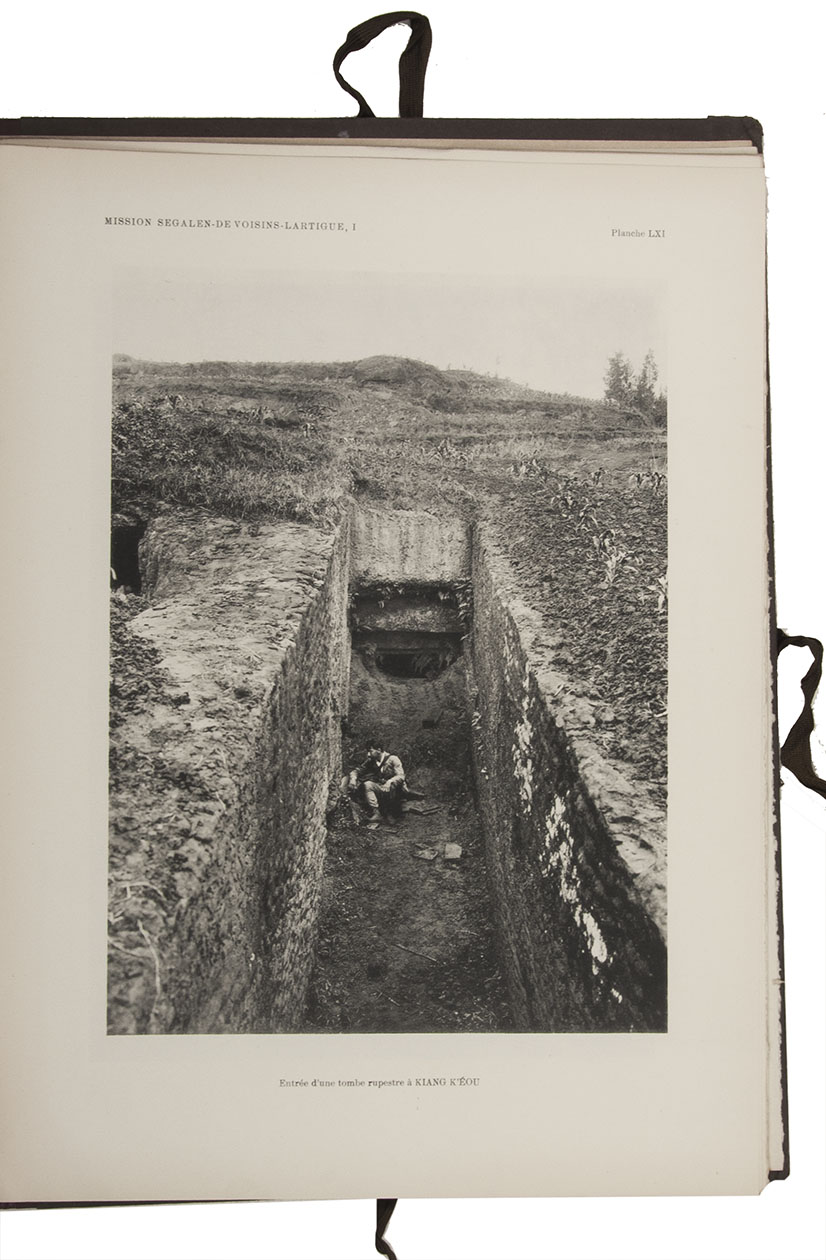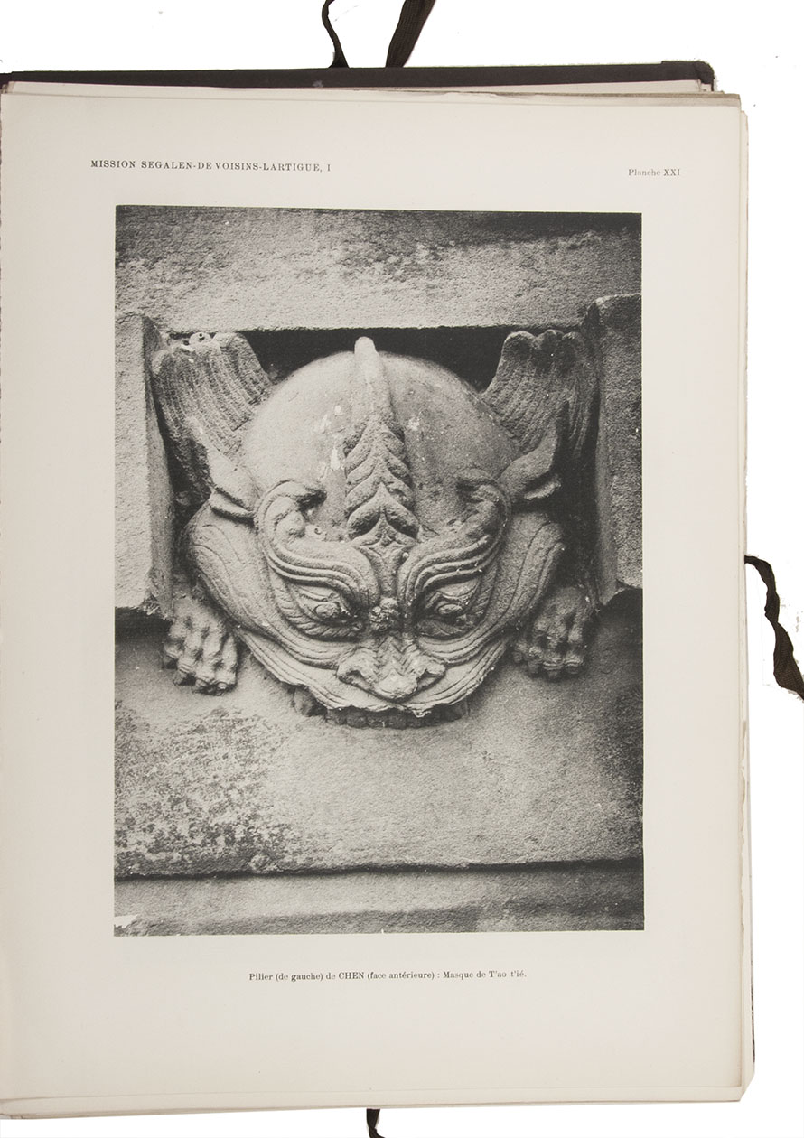 First edition of an art-historical work on Chinese funeral monuments, dating mainly from the Han dynasty. The work was compiled and written by the French archaeologists Gilbert de Voisins (1877-1939), Jean Lartigue (1886-1940) and Victor Segalen (1878-1919), who was in charge of the expedition. The expedition was cut short due to the First World War. The two atlases contain 144 loose collotype plates, showing statues, tombs, mausoleums, reliefs and monuments as well as some of the sites, covering the areas of Nanjing, Shanxi and Sichuan. Scolarly descriptions of the plates are given in the text volume, along with small maps of the area, plans of the excavation sites and tombs and schematic reproductions of the artefacts.