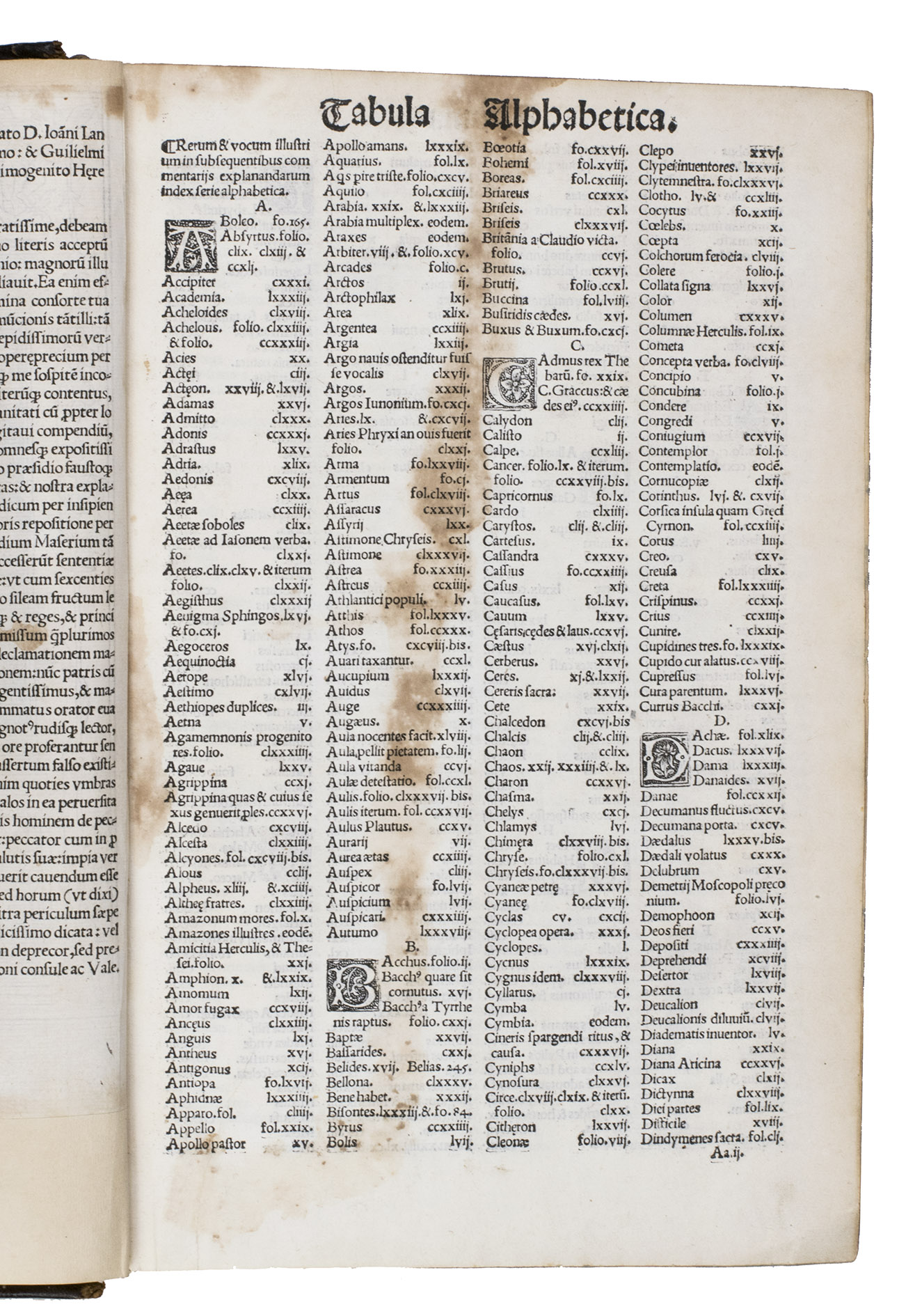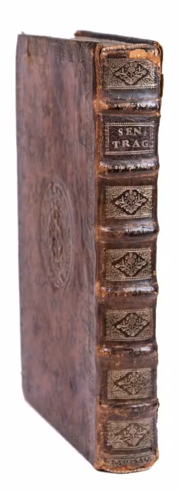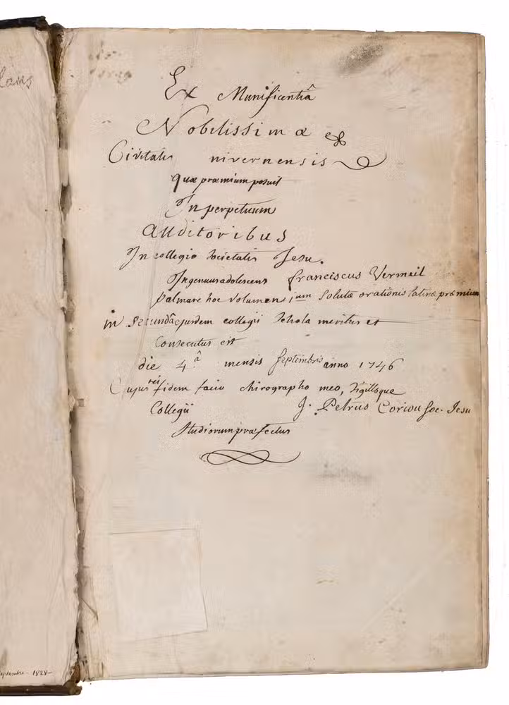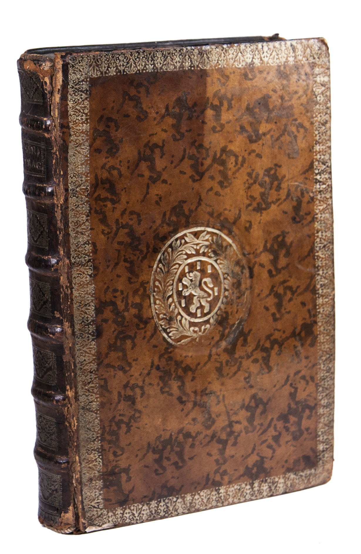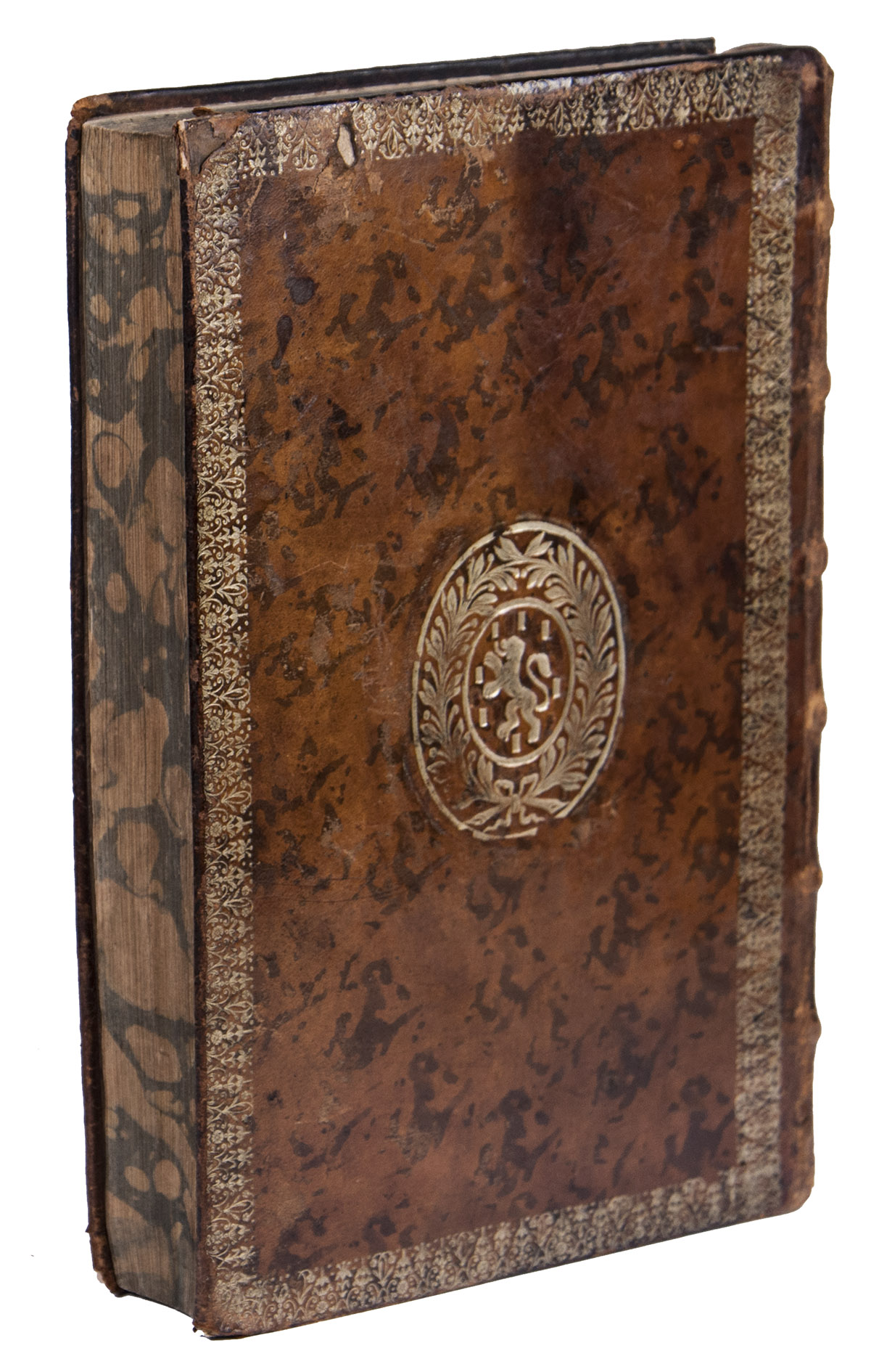 With a printed book plate of the Fossé d'Arcosse family, and a manuscript presentation note dated 1828 ("Emilien Fossé Darcosse donné par Mr B. V. le 10 septembre 1828") on the front pastedown. On the first free endpaper, an 18th-century Latin manuscript inscription records the awarding of a prize to Franciscus Vermeil, a noble student at the Jesuit College of Nevers in France, for his scholarly achievements. The prize, which included an award for a Latin oration, was granted on 4 September 1746, by virtue of a perpetual endowment from the city of Nevers. The award is formally attested by the "Praefectus Studiorum" (director of studies), J. Petrus Coriou, whose autograph and the official seal of the college are present. The corners of the boards are bumped, the front hinge is weakened, the ends of the spine are slightly damaged (with some minor loss of material), and with some minor loss of material on the back board. The front board is slightly rubbed, the outer half of both boards is slightly faded from sun exposure. The lower margin of the title page and the outer margin of the sixth preliminary leaf have been reinforced. The final privilege leaf (blank on the verso except for some manuscript annotations) has been mounted on the recto of the adjacent blank flyleaf. The first and last leaves are slightly water stained, and the upper margins have been cut somewhat short. Otherwise in good condition. De Reuck 497; Moreau and Renouard 967; Renouard (Badius) III, 252-53; USTC 144361; Vander Haeghen II, 49; not in Kossmann.