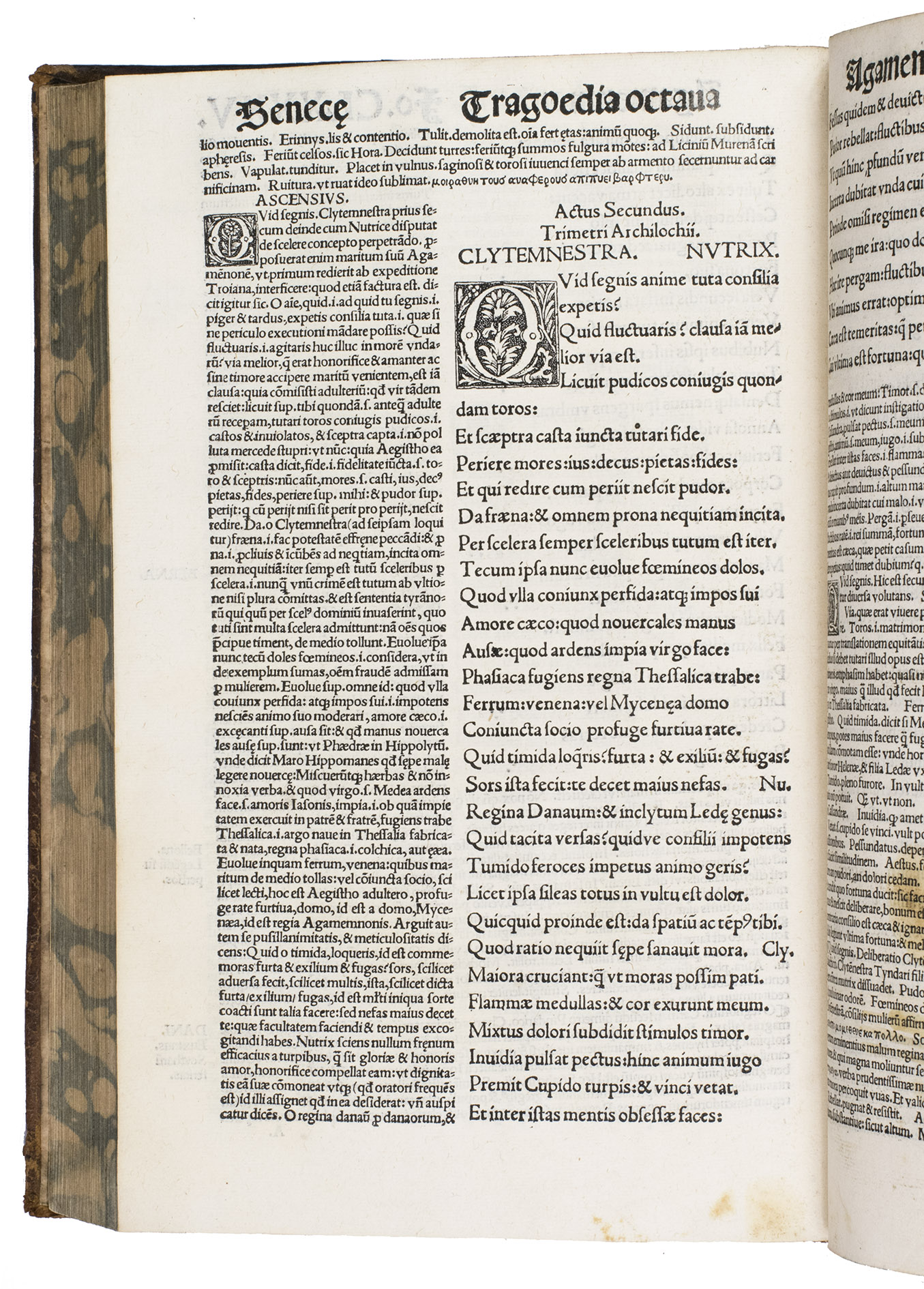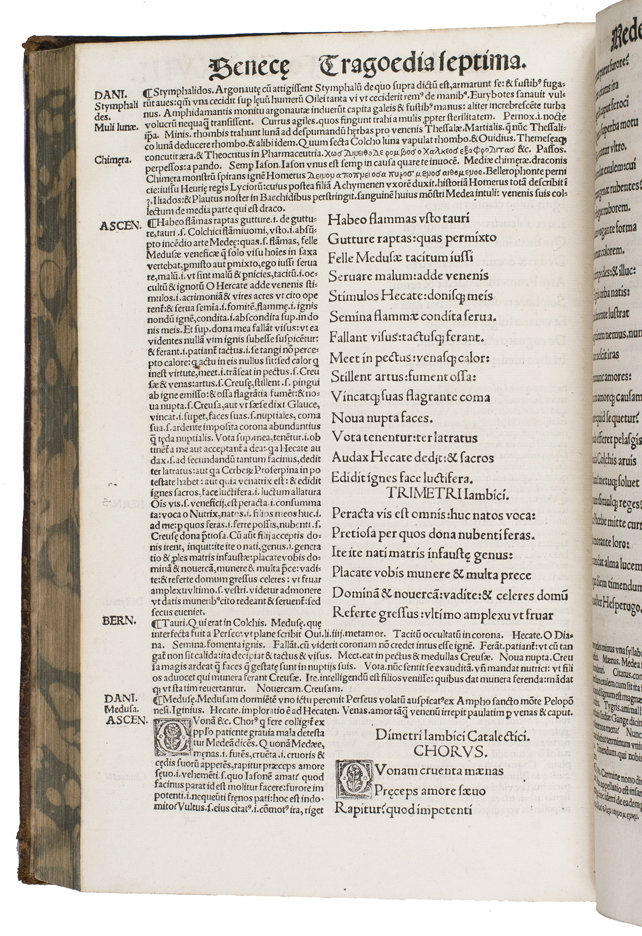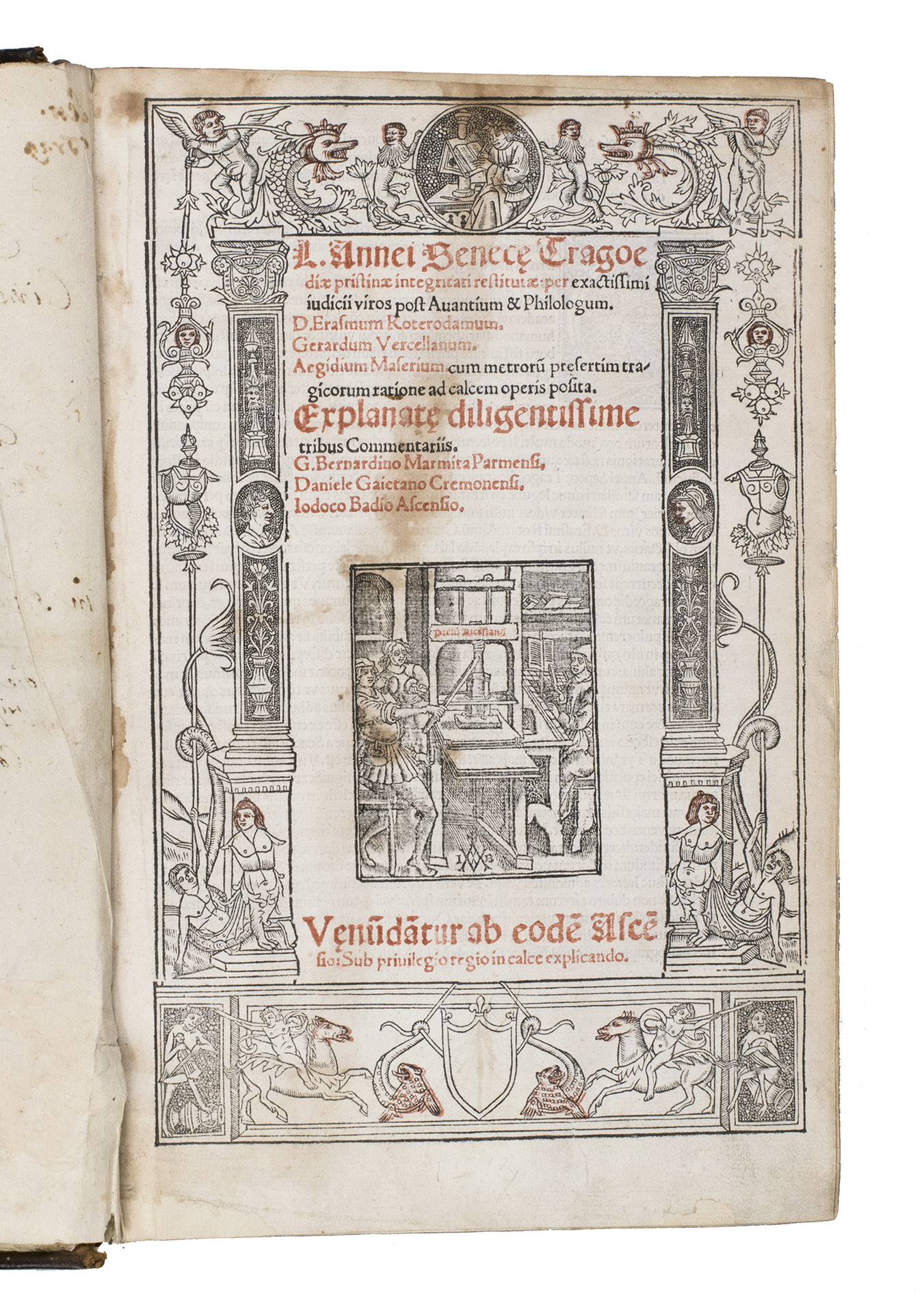 1514 Paris edition of Senecas tragedies, printed and edited by the humanist printer Jodocus Badius (1462-1535), with contributions from Erasmus and others. Although Erasmus had permitted Badius to use his preparatory work, in his autobiographical letter to Botzheim, he reflects on the painstaking effort that went into this preparation and subtly expresses his irritation at seeing Badius "nostra cum alienis miscuisse" (that is, having mixed Erasmus contributions with those of others).