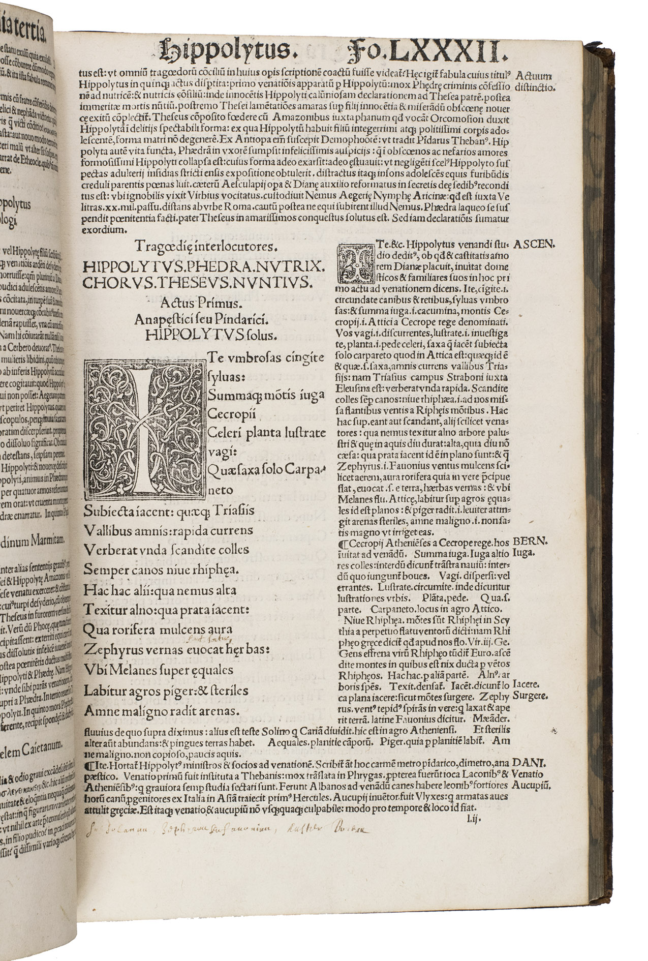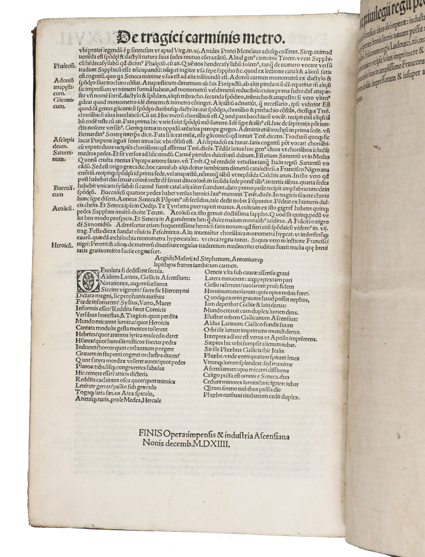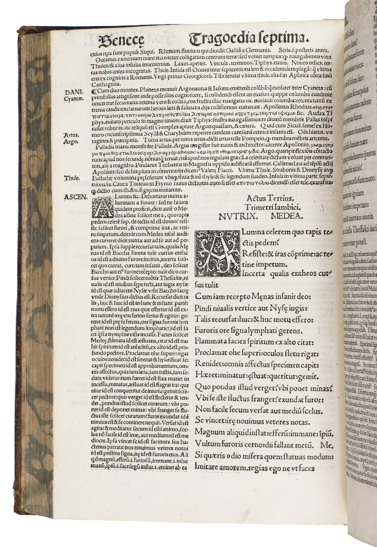 1514 Paris edition of Senecas tragedies, printed and edited by the humanist printer Jodocus Badius (1462-1535), with contributions from Erasmus and others. Although Erasmus had permitted Badius to use his preparatory work, in his autobiographical letter to Botzheim, he reflects on the painstaking effort that went into this preparation and subtly expresses his irritation at seeing Badius "nostra cum alienis miscuisse" (that is, having mixed Erasmus contributions with those of others).