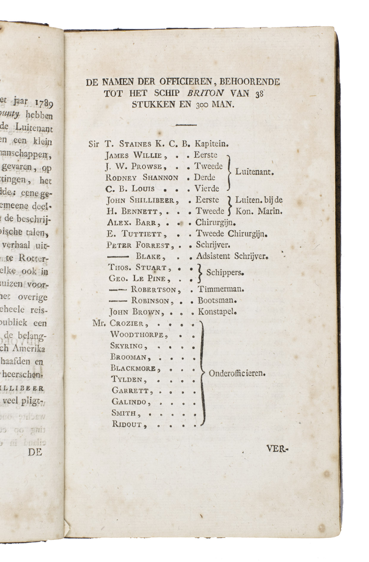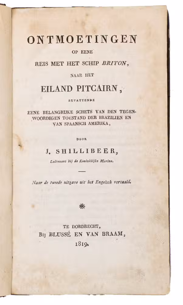 Lieutenant John Shillibeer (1786-1841) participated in the Battle of Trafalgar in 1805, before he was assigned to the HMS Briton in 1813. His notes from this voyage were the basis for the work A narrative of the Briton's voyage, to Pitcairn's Island (1817), which was published shortly after his return to England. This work was translated into Dutch in 1819, which is the present work. This translation is very scarce. It has only been recorded in six libraries worldwide, and we have only been able to find two other copies in sales records of the past 100 years.