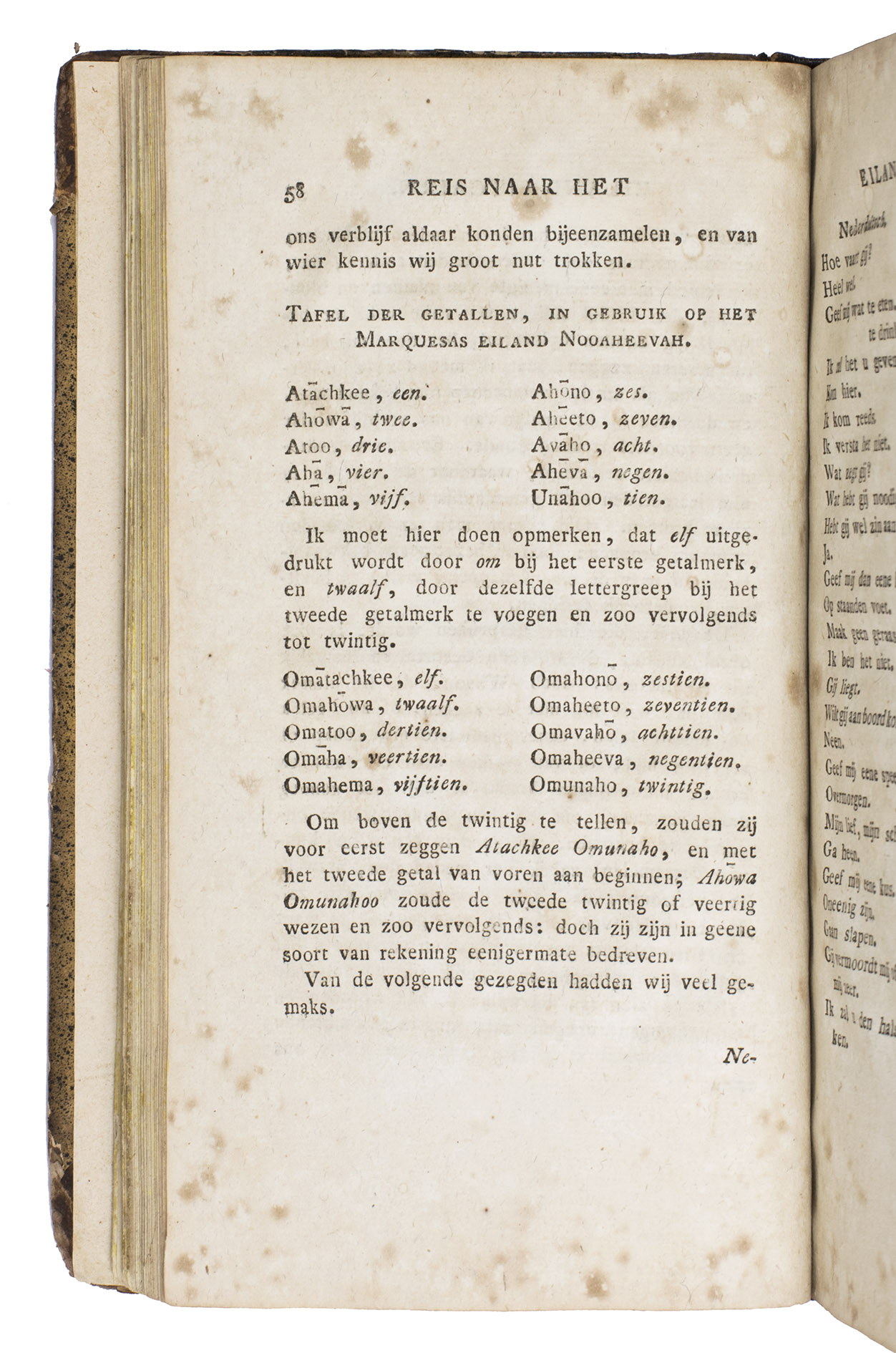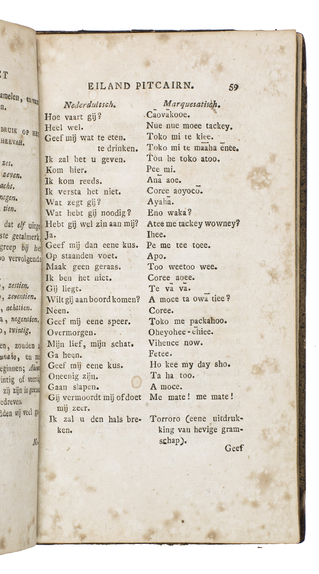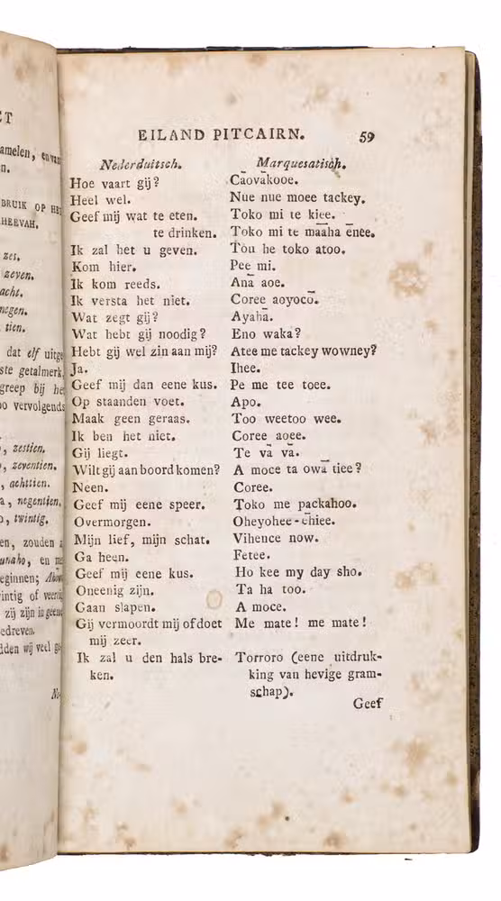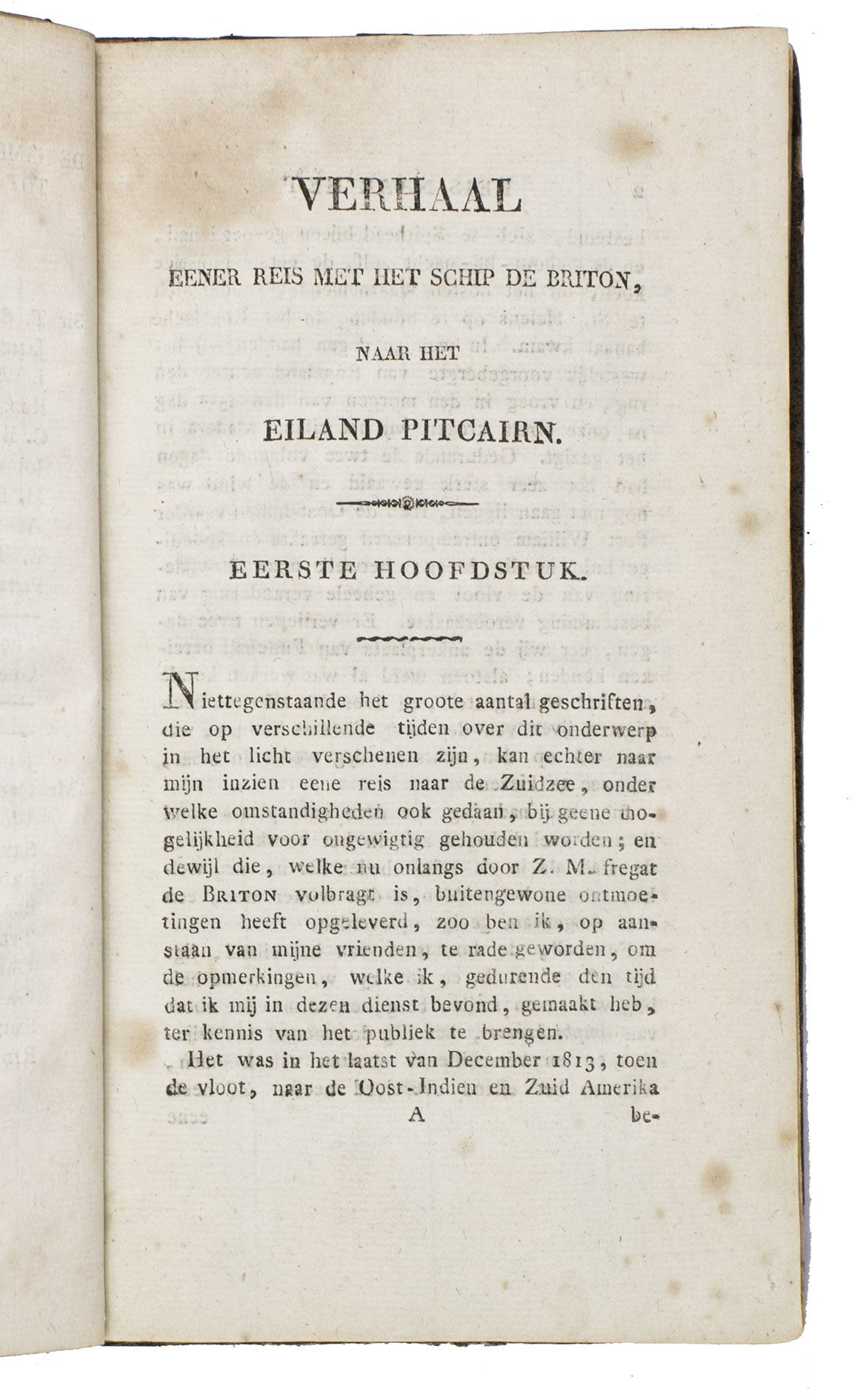 First Dutch edition of a fascinating account of the voyage of the HMS Briton to Brazil and the Pitcairn Islands, including some noteworthy details about the mutiny of the HMS Bounty in 1789. Unbeknownst at the time, the survivors of the mutiny had settled on Pitcairn. Although most of them had passed away in the early 19th century, their descendants where still living there. The crew of the HMS Briton met them in 1814. The present work includes a rare interview with one of them, which offers a wealth of information about the mutiny and its aftermath.