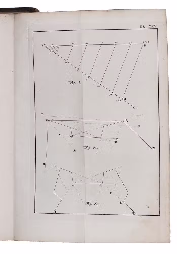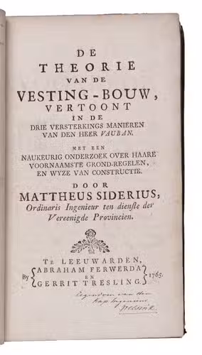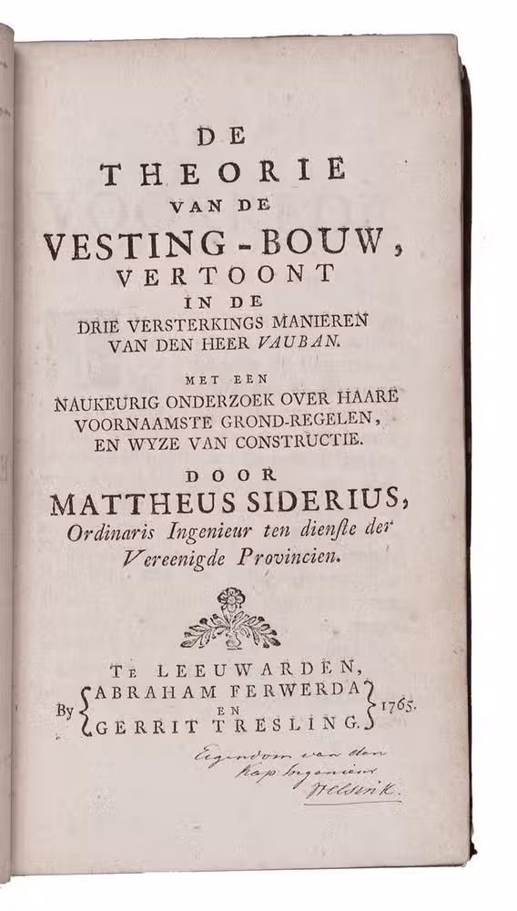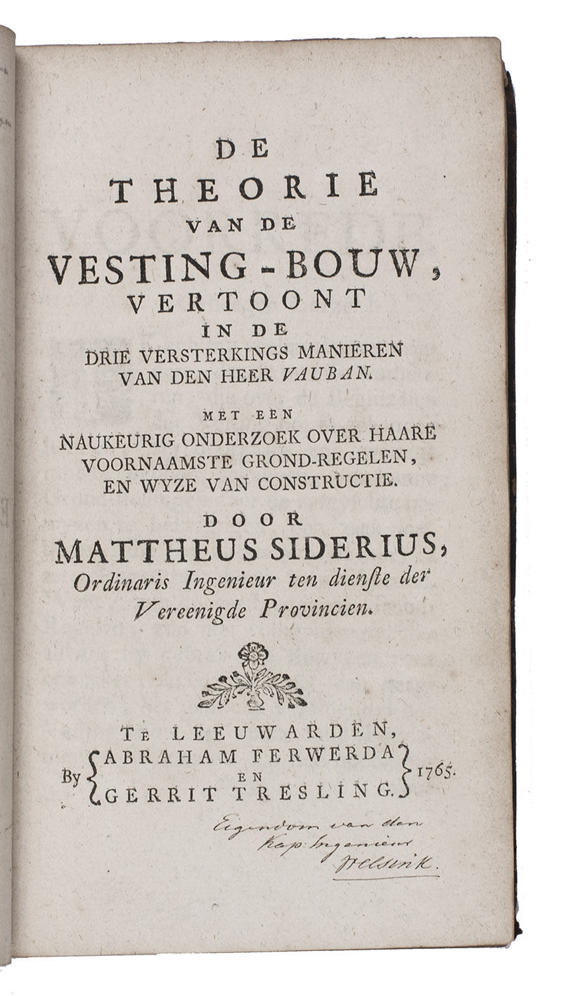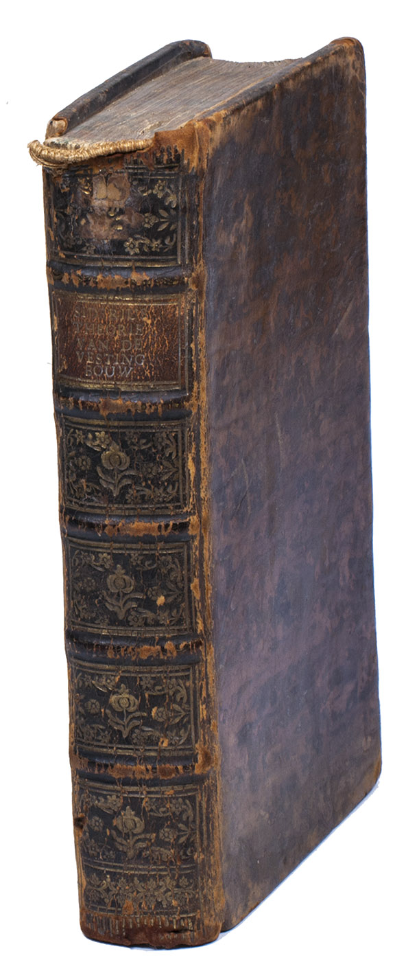 First edition, in the original Dutch, of a revised and modernized introduction to the methods and principles of fortification established by the greatest French exponent of the art, Sébastien Le Prestre de Vauban (1633-1707). As usual in Vauban's approach, the text is divided into two principal parts, the first and longest discussing regular (symmetrical) fortifications and the second discussing irregular fortifications, the latter with a drop-title. But in each part Siderius distinguishes three different manners of constructing the desired forms, a new presentation that quickly became "authoritative" (Jähns). Siderius notes as the greatest weakness of earlier manuals that they gave only rules to follow without explaining the reasons behind them, which he considered dangerous, so he here set out to fill that gap. The 29 plates are clear and precise, and fold out to display the entire image outside the book's margins, so that one can consult the plates and text simultaneously. The folding tables are similarly designed.