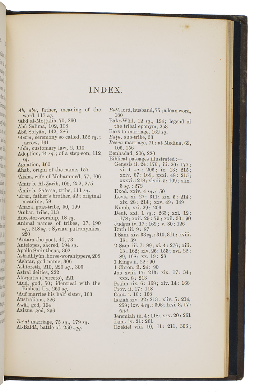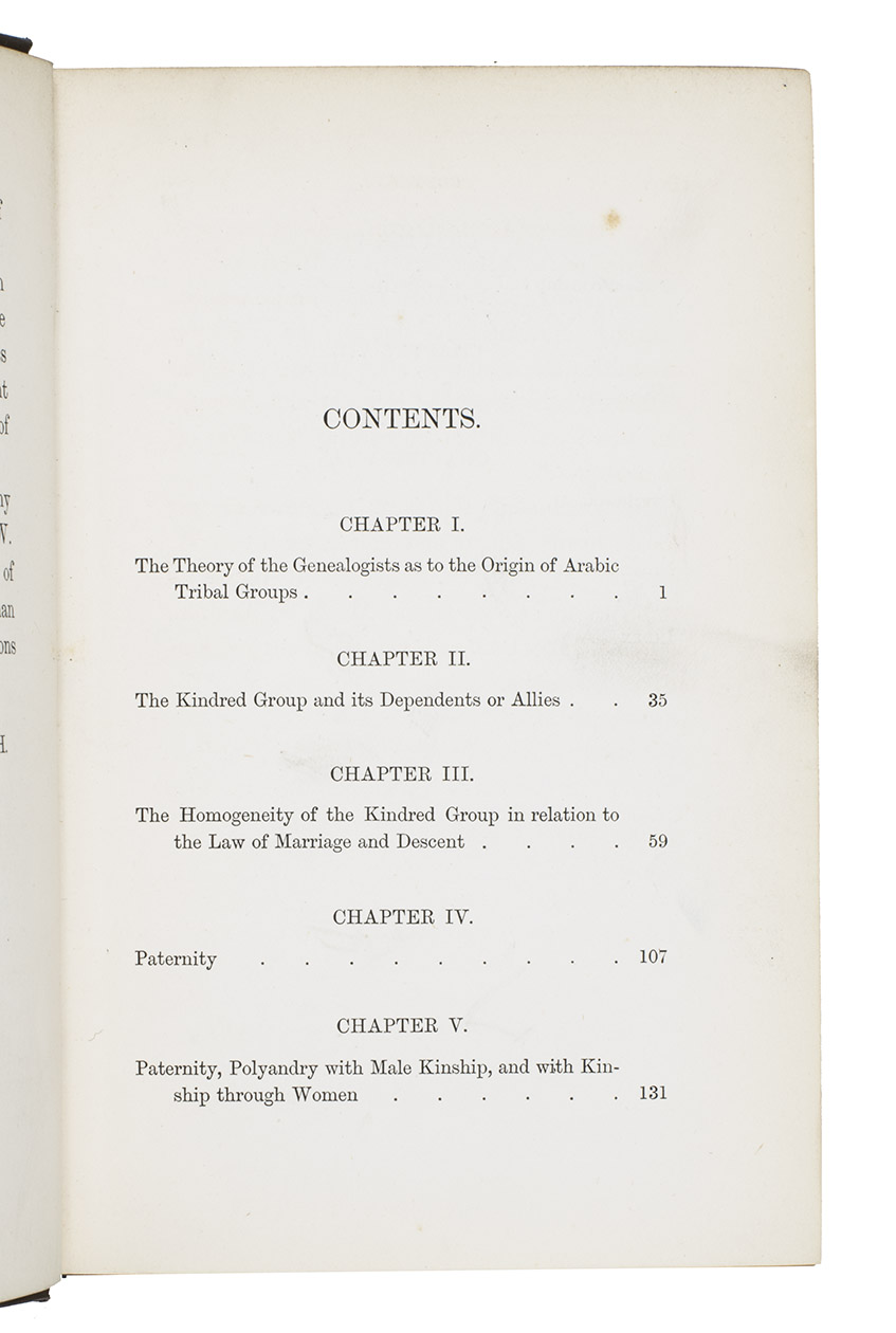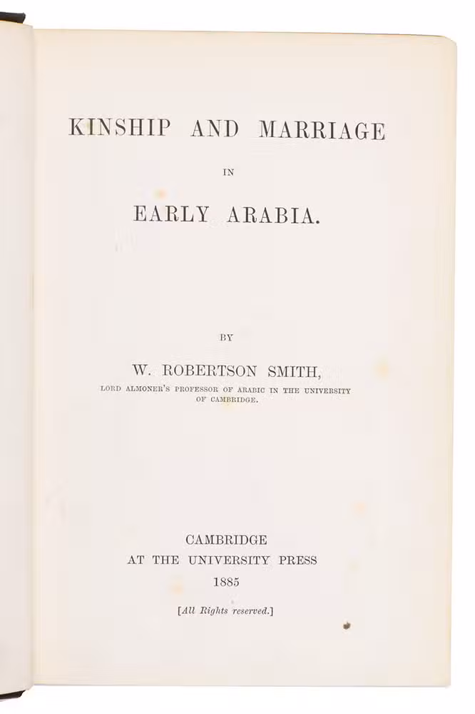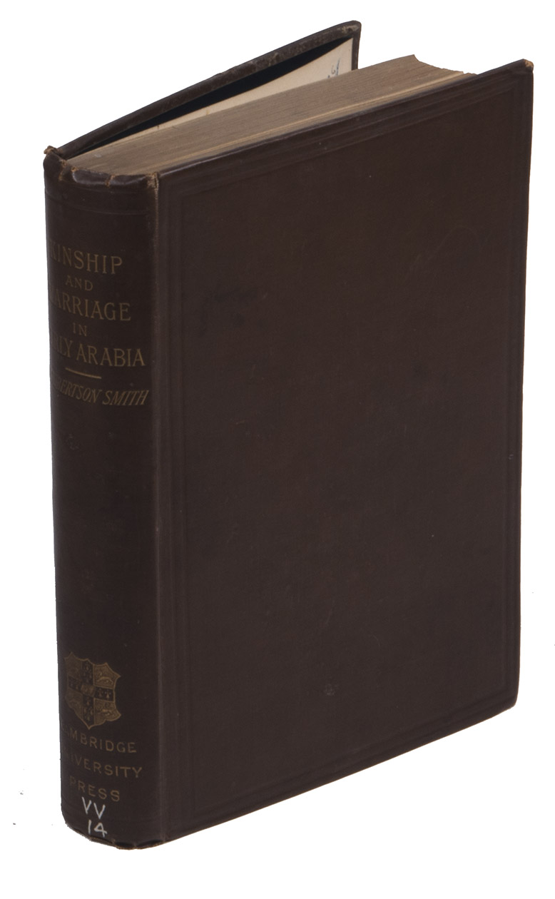 Presentation copy of the rare first edition of William Robertson Smiths influential work of on kinship and marriage in early Arabia. It examines the evidence for a pre-Islamic matriarchal kinship and corresponding laws of marriage and tribal organization that was superceded in Arabia at the time of Mohammed. Robertson Smith, Lord Almoners Professor of Arabic at the University of Cambridge, concluded that male kinship had been preceded by female kinship and "drew a line of evolutionary progress in family forms from a totemist matriarchy to exogamy" (Joseph). His work proved very influential, because it was one of the first anthropological analyses of kinship in the Middle East that tried to reconcile conflicting theories on this topic.