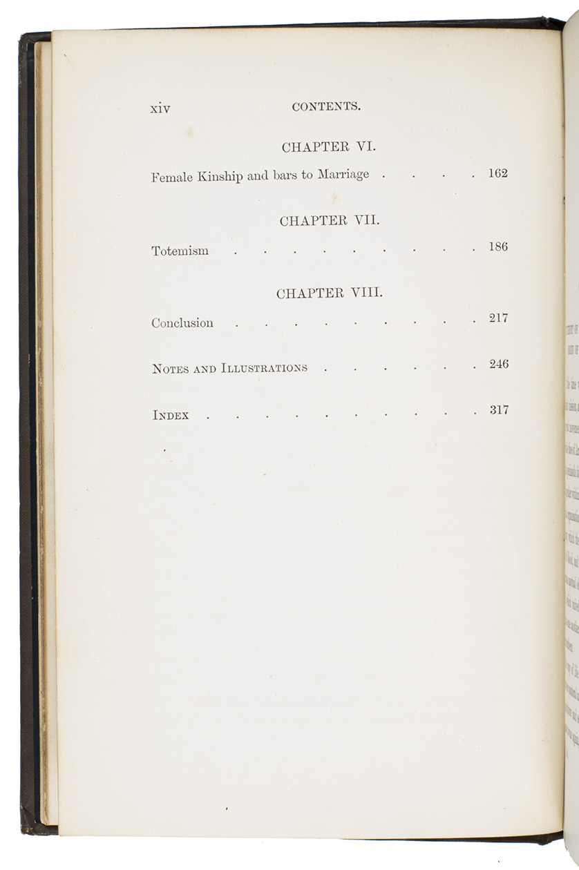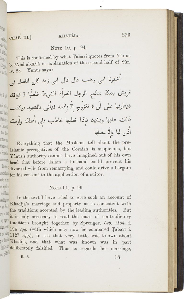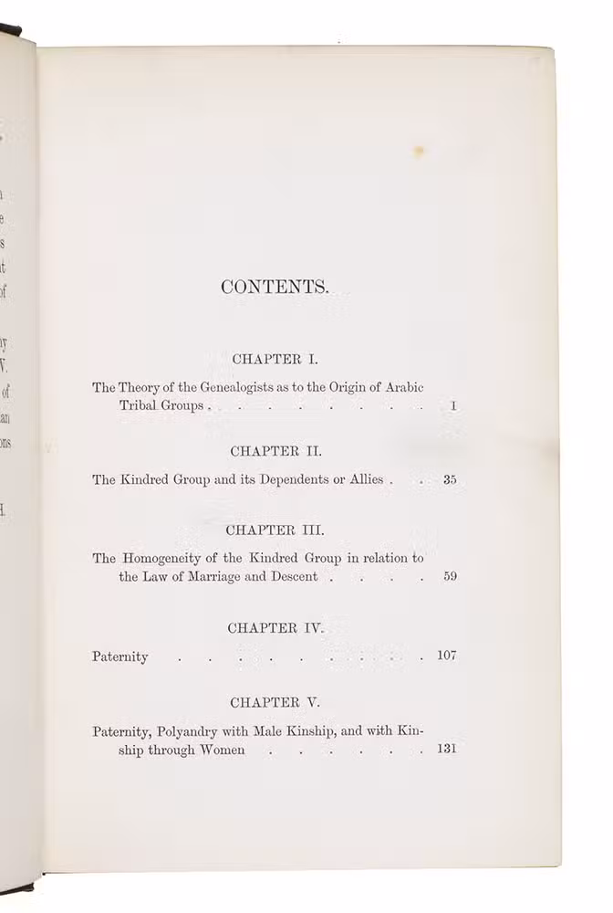 Presentation copy of the rare first edition of William Robertson Smiths influential work of on kinship and marriage in early Arabia. It examines the evidence for a pre-Islamic matriarchal kinship and corresponding laws of marriage and tribal organization that was superceded in Arabia at the time of Mohammed. Robertson Smith, Lord Almoners Professor of Arabic at the University of Cambridge, concluded that male kinship had been preceded by female kinship and "drew a line of evolutionary progress in family forms from a totemist matriarchy to exogamy" (Joseph). His work proved very influential, because it was one of the first anthropological analyses of kinship in the Middle East that tried to reconcile conflicting theories on this topic.