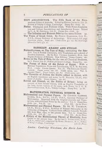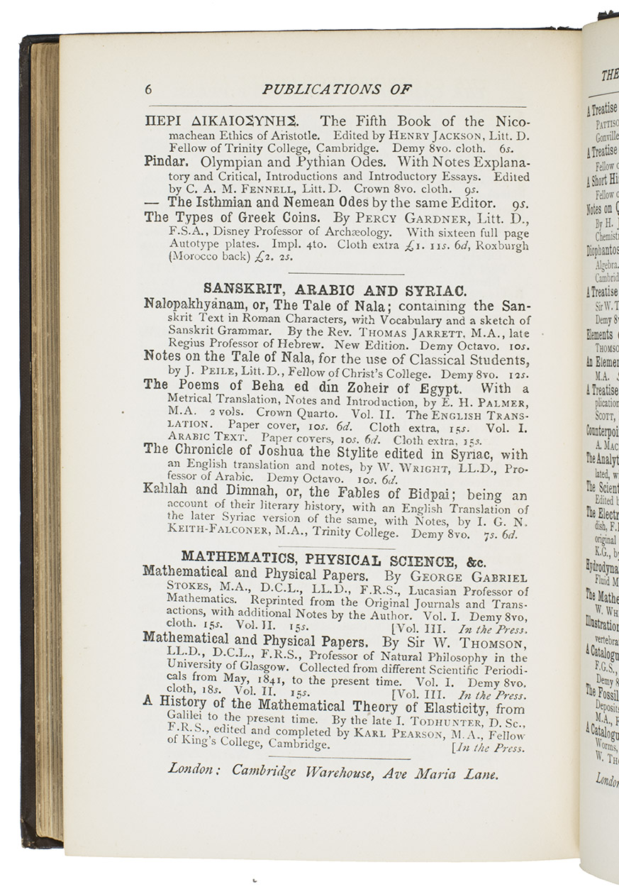 Cambridge, C.J. Clay and son, Cambridge University Press Warehouse, 1885. 8vo. Contemporary brown cloth, lettering in gold on the spine. xiv, 322, [2], 16 pp.
