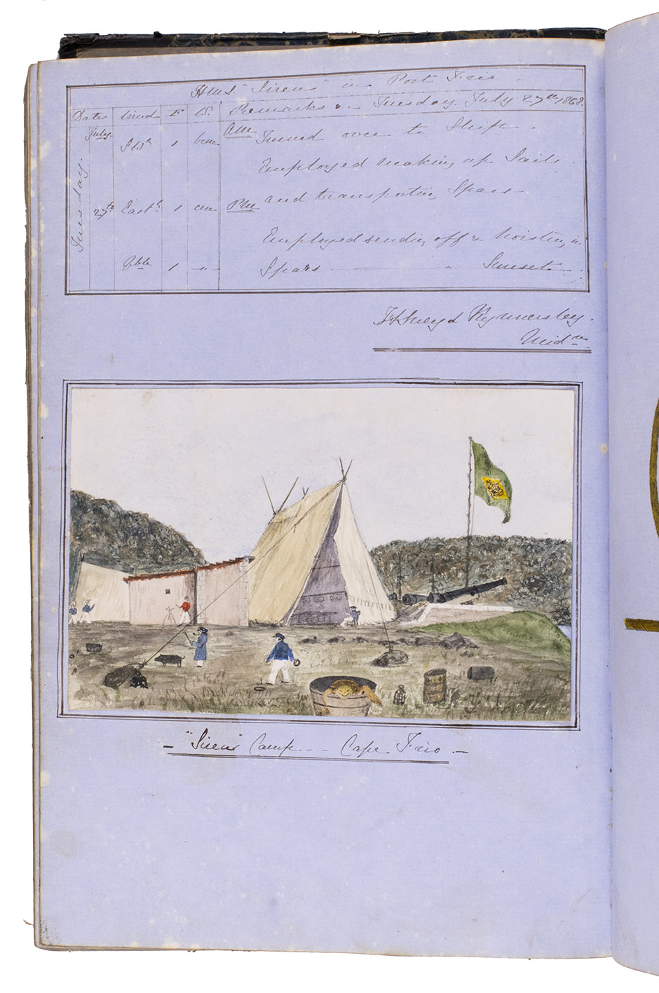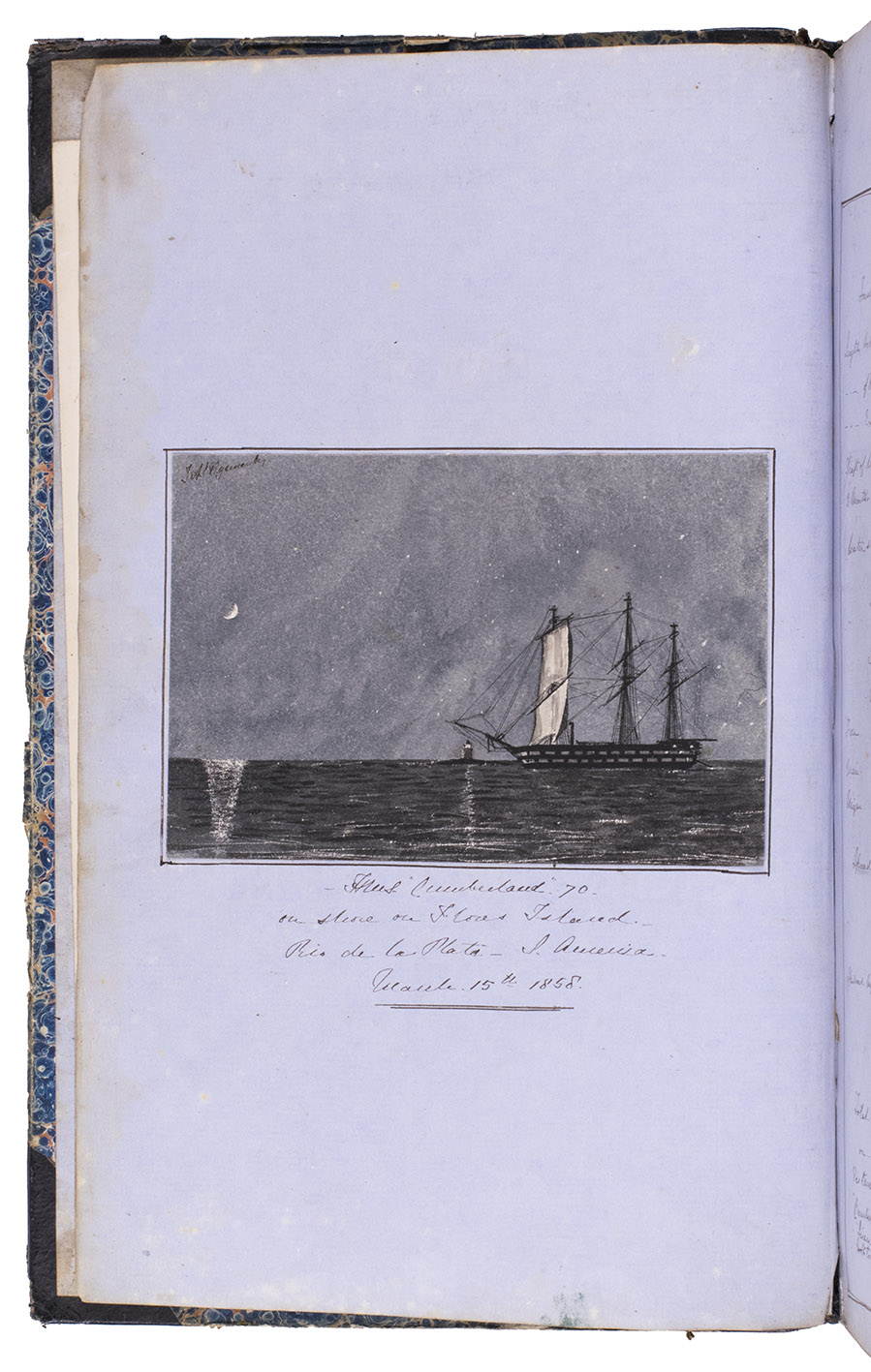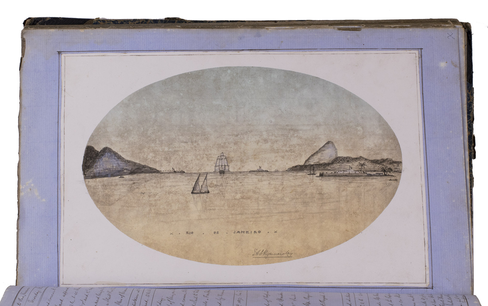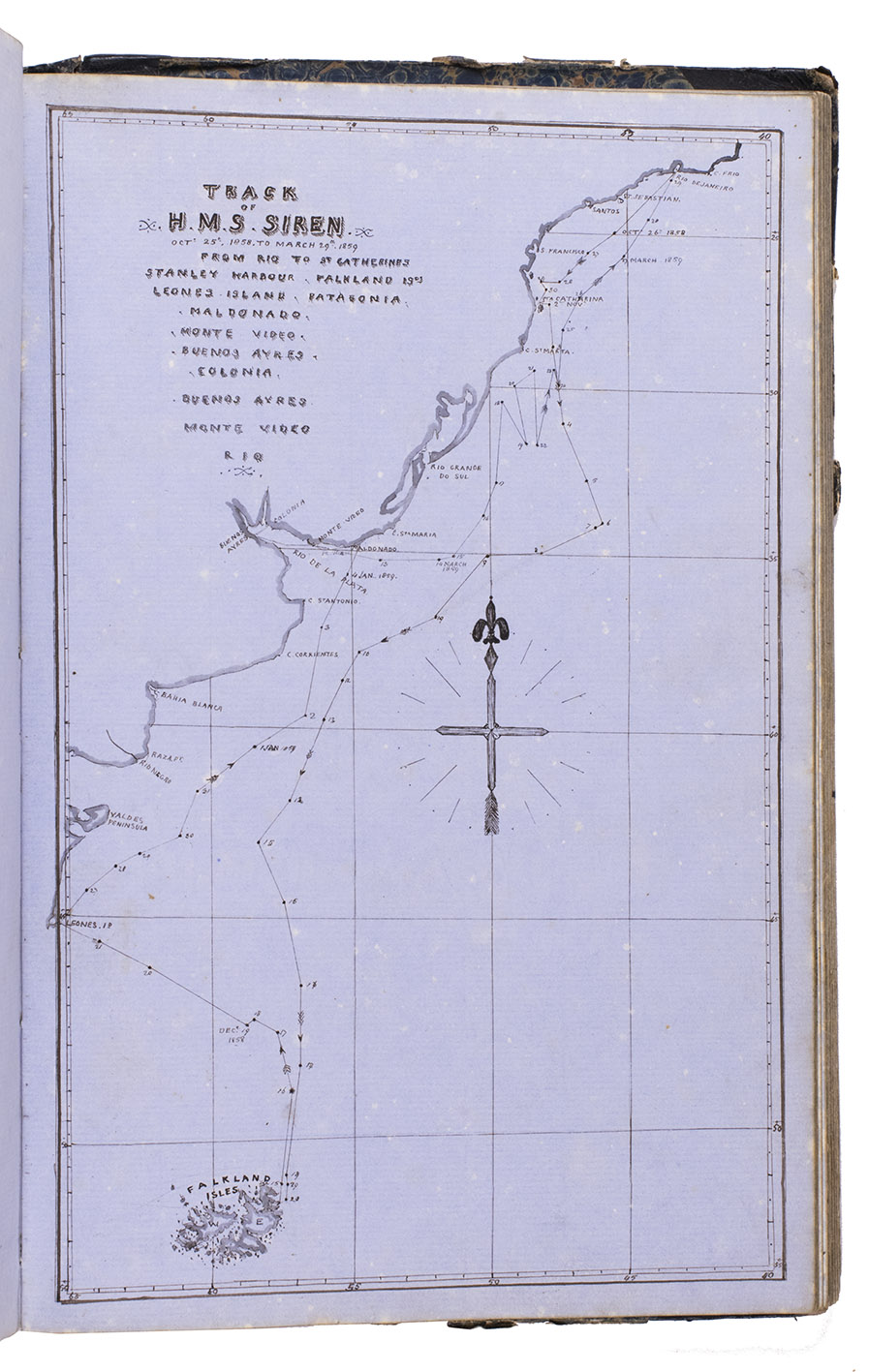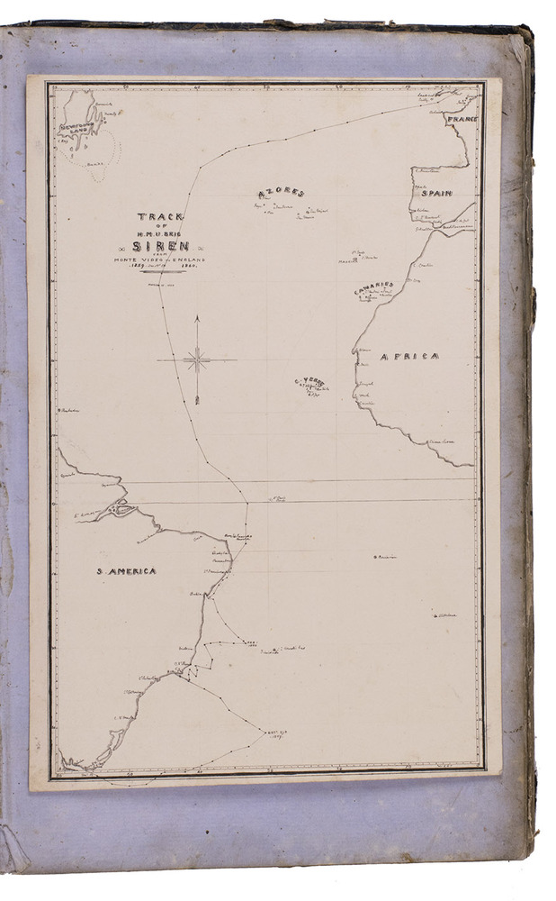 A manuscript log book and journal of voyages to, from and along the coast of South America in the British navy ships Cumberland and Siren, all kept in a single album by the midshipman Thomas Alfred Sneyd-Kynnersley (1839-1874) in the years 1857 to 1860. The first voyage sailed from Cornwall to Rio de Janeiro, while others sailed along the South American coast, including the Falkland Islands (Islas Malvinas), Monte Video, Rio de Janeiro, Buenos Aires, Bahia, Pernambuco, Port and Cape Frio and Bahia de São Marcos. The album includes views from nearly all of these sites, probably all by Sneyd-Kynnersly and some signed by him, plus a full-page survey (with coastal profiles) of Atol das Rocas, a volcanic and coral atoll off the coast of Brazil, providing a detailed record of its state 160 years ago. The drawings are excellent, especially when one considers that Sneyd-Kynnersley set off on these voyages as a 17-year-old junior officer. Sneyd-Kynnersley was born in Uttoxeter in Staffordshire. He was promoted to lieutenant in 1860 but had to take leave soon after due to illness and settled in New Zealand, where he remained to his death.