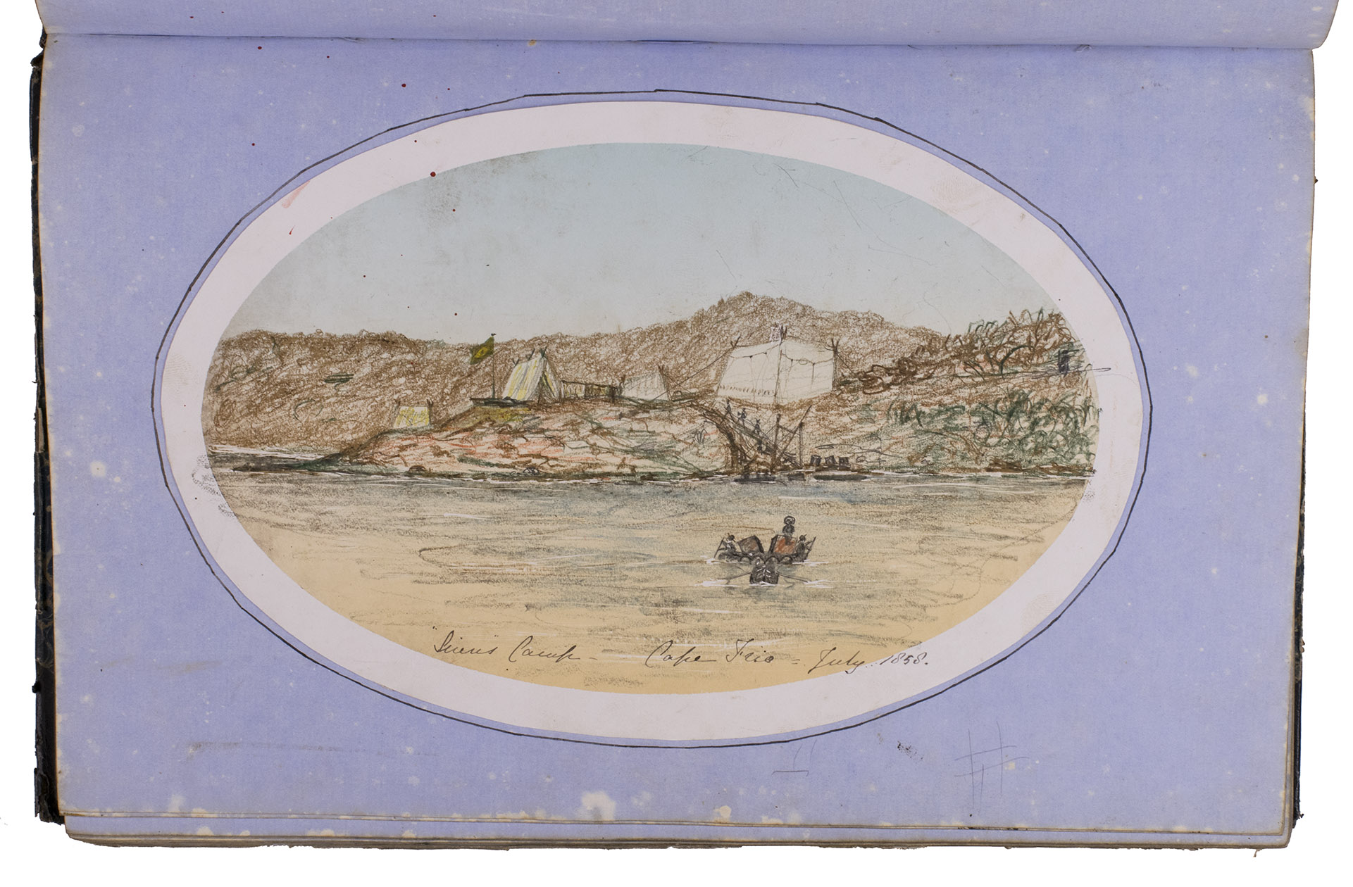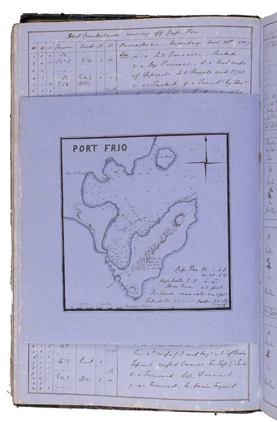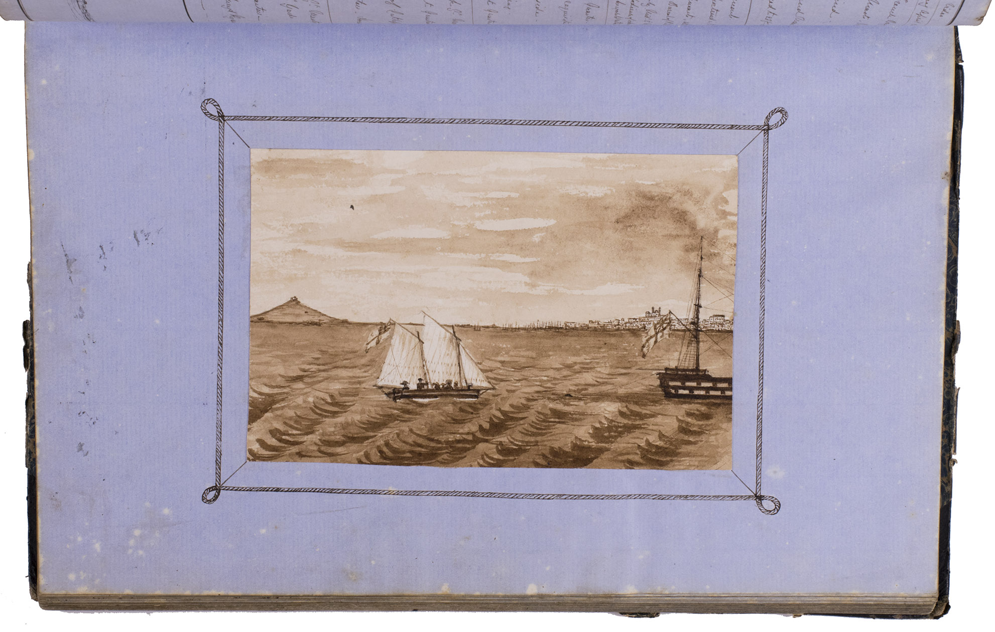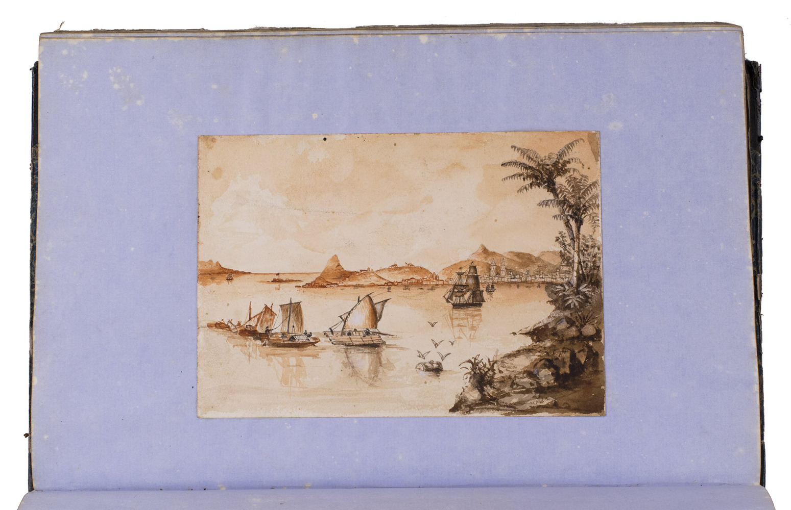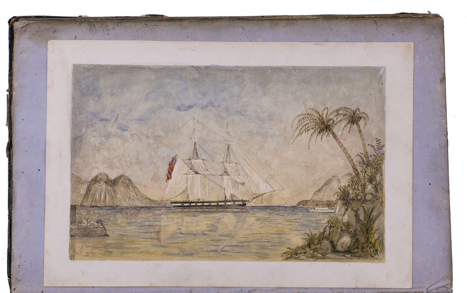 A manuscript log book and journal of voyages to, from and along the coast of South America in the British navy ships Cumberland and Siren, all kept in a single album by the midshipman Thomas Alfred Sneyd-Kynnersley (1839-1874) in the years 1857 to 1860. The first voyage sailed from Cornwall to Rio de Janeiro, while others sailed along the South American coast, including the Falkland Islands (Islas Malvinas), Monte Video, Rio de Janeiro, Buenos Aires, Bahia, Pernambuco, Port and Cape Frio and Bahia de São Marcos. The album includes views from nearly all of these sites, probably all by Sneyd-Kynnersly and some signed by him, plus a full-page survey (with coastal profiles) of Atol das Rocas, a volcanic and coral atoll off the coast of Brazil, providing a detailed record of its state 160 years ago. The drawings are excellent, especially when one considers that Sneyd-Kynnersley set off on these voyages as a 17-year-old junior officer. Sneyd-Kynnersley was born in Uttoxeter in Staffordshire. He was promoted to lieutenant in 1860 but had to take leave soon after due to illness and settled in New Zealand, where he remained to his death.
