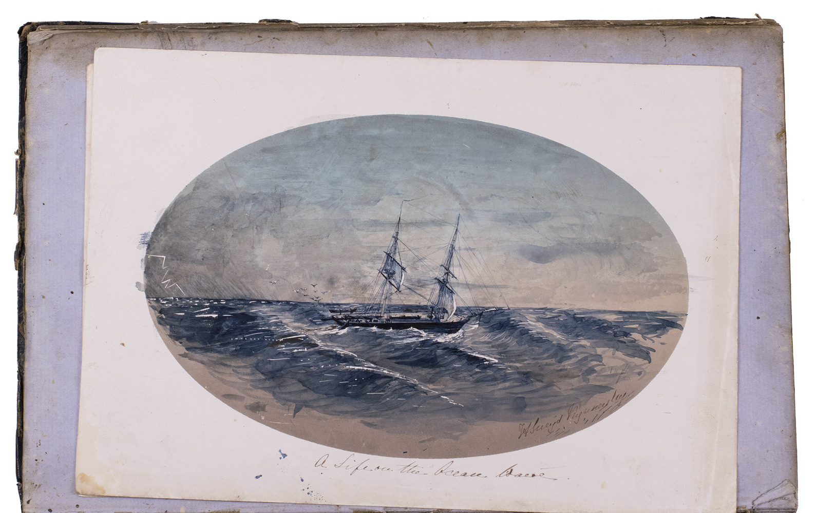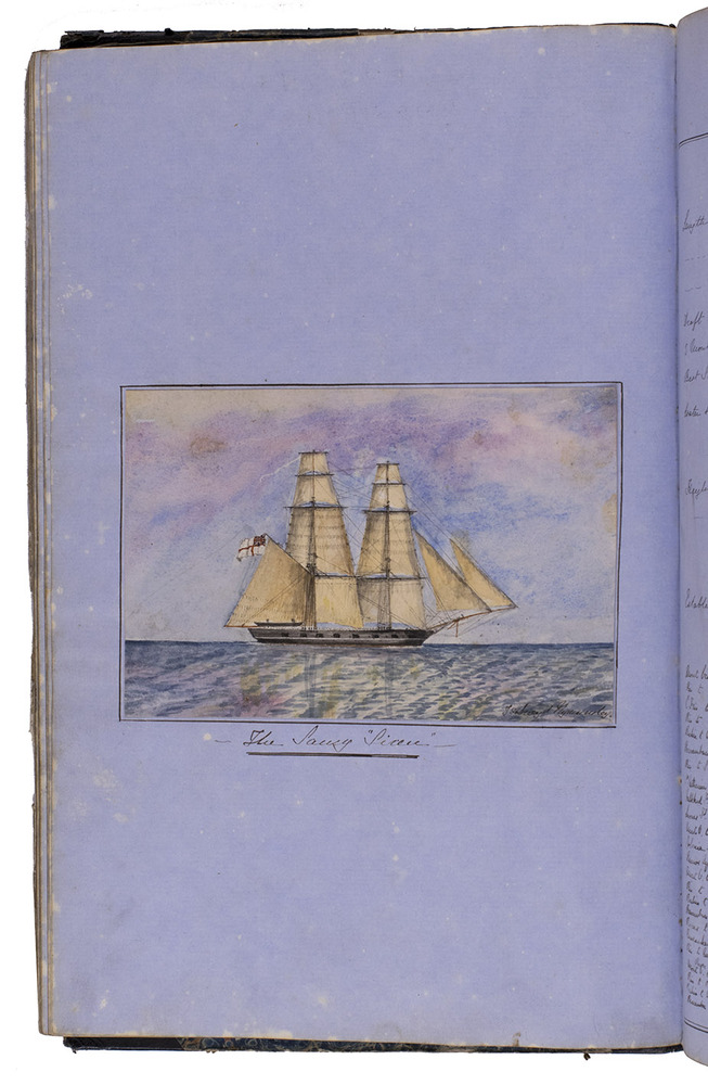 [In the Atlantic, along the European, African and especially the South American coasts, 1857-1860]. Small folio (32 x 20.5 cm). Three English manuscript ships' logs written in a single album in black ink on laid paper with a blue cast, with 3 hand-lettered title-pages, 2 sea charts showing the routes and 8 colour views (in watercolour, coloured pencil and sepia and black ink, mostly ships on the South American coast, but also camps) are drawn on 9 separate leaves, and 6 sea charts showing the routes and about 15 views drawn directly on the album leaves, mostly in black ink, but including a colour plan of one of the ships. Contemporary black half sheepskin. [215 (including 5 blank)], [117 blank] pp.