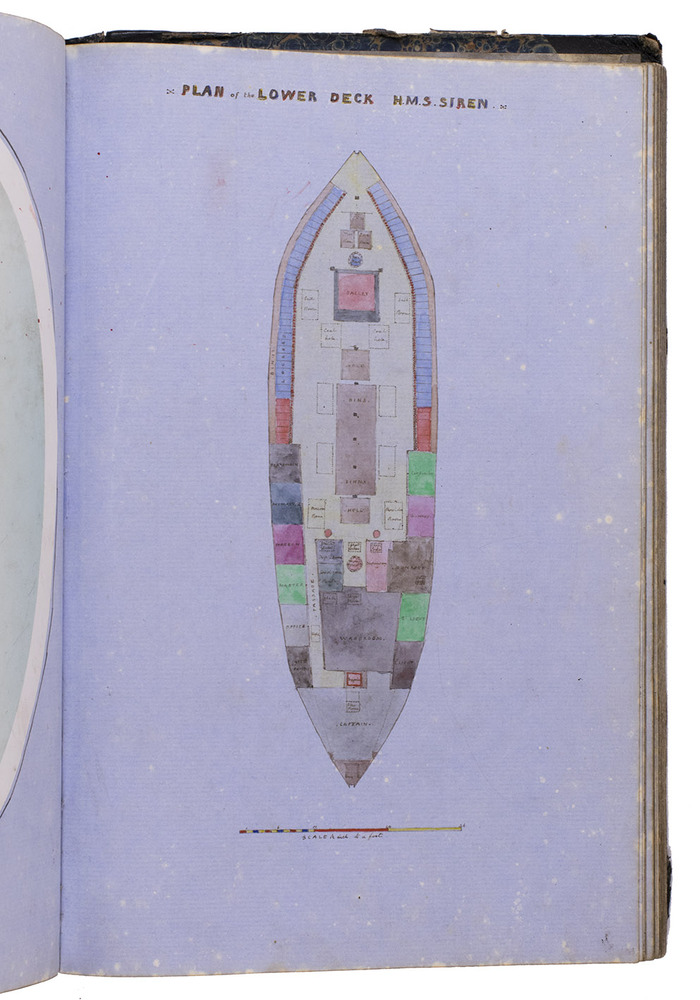 The bluish paper has some white spots throughout and 1 leaf is tattered at the fore-edge, but the text and drawings are in very good condition. The bookblock has separated from the binding at the inside front hinge and shows minor damage at the head and foot of the spine and along the board edges, and a few small, minor scuffs on the boards, but has survived its voyages in surprisingly good condition. A detailed and well-illustrated set of ships' logs, mostly concerning South America. For the author: A. Hutchison, "Kynnersley, Thomas Alfred Sneyd", in" Dictionary of New Zealand Biography (online); for Admiral Wallis: T.A. Heathcote, The British admirals of the fleet 1734-1995 (2002), pp. 248-249.
