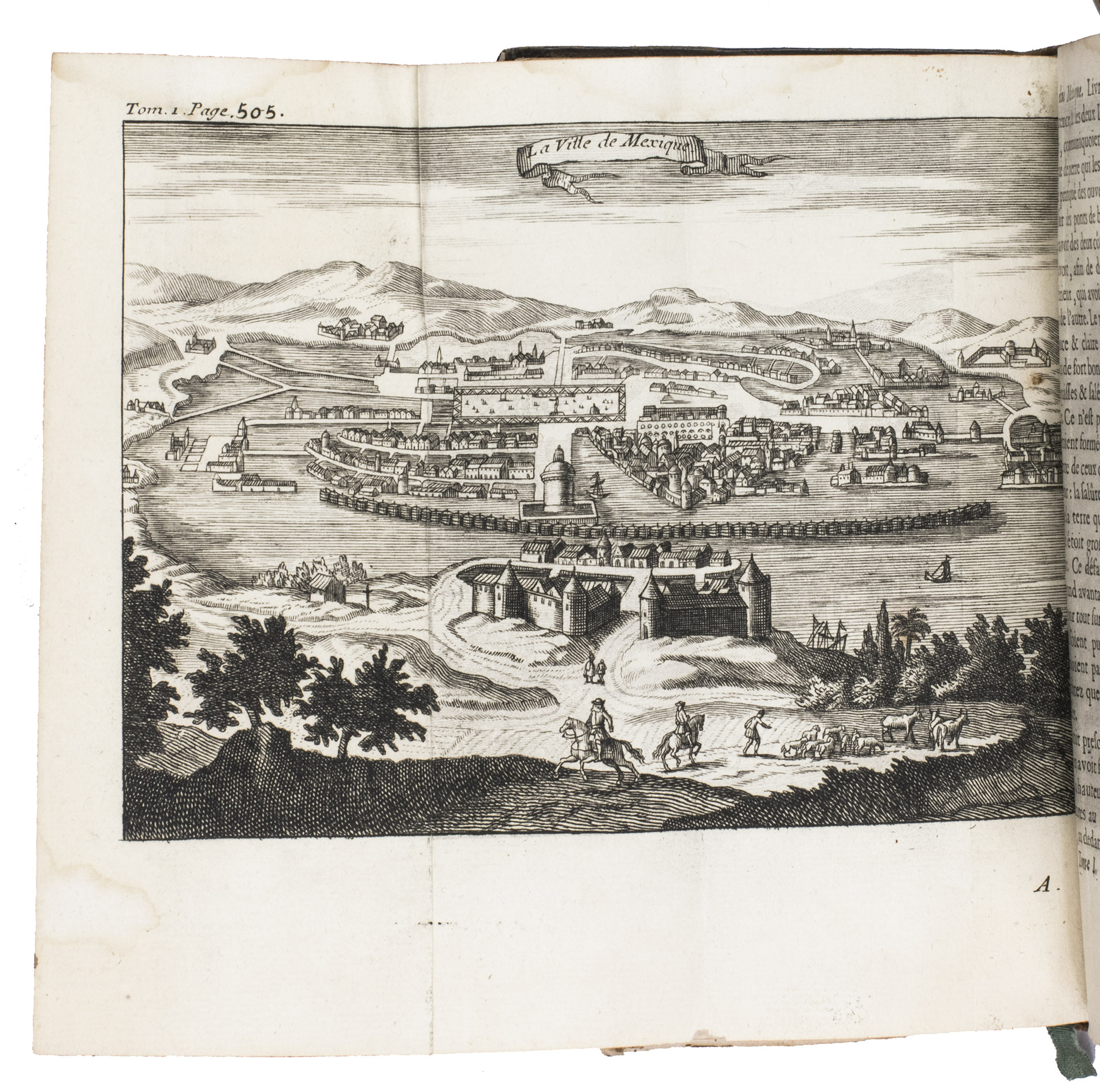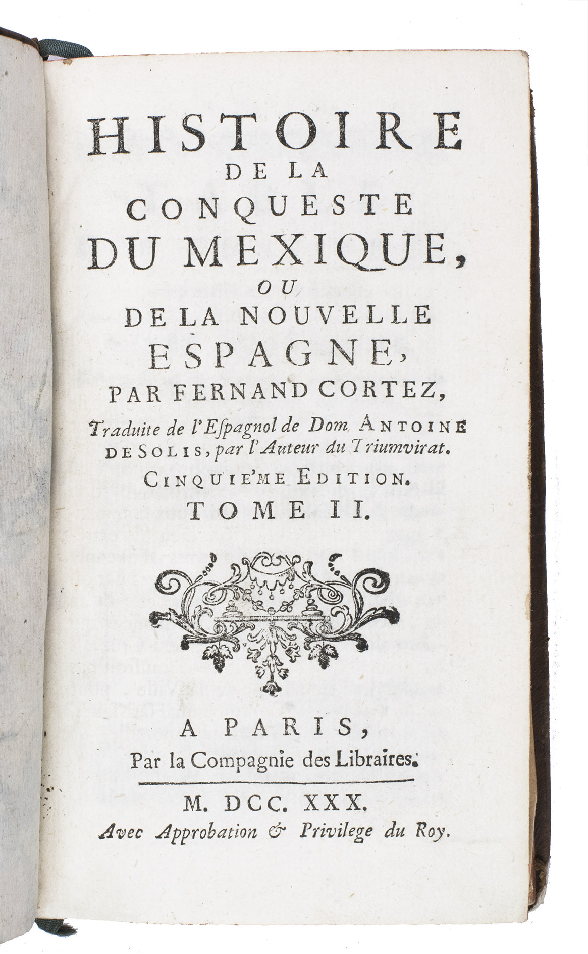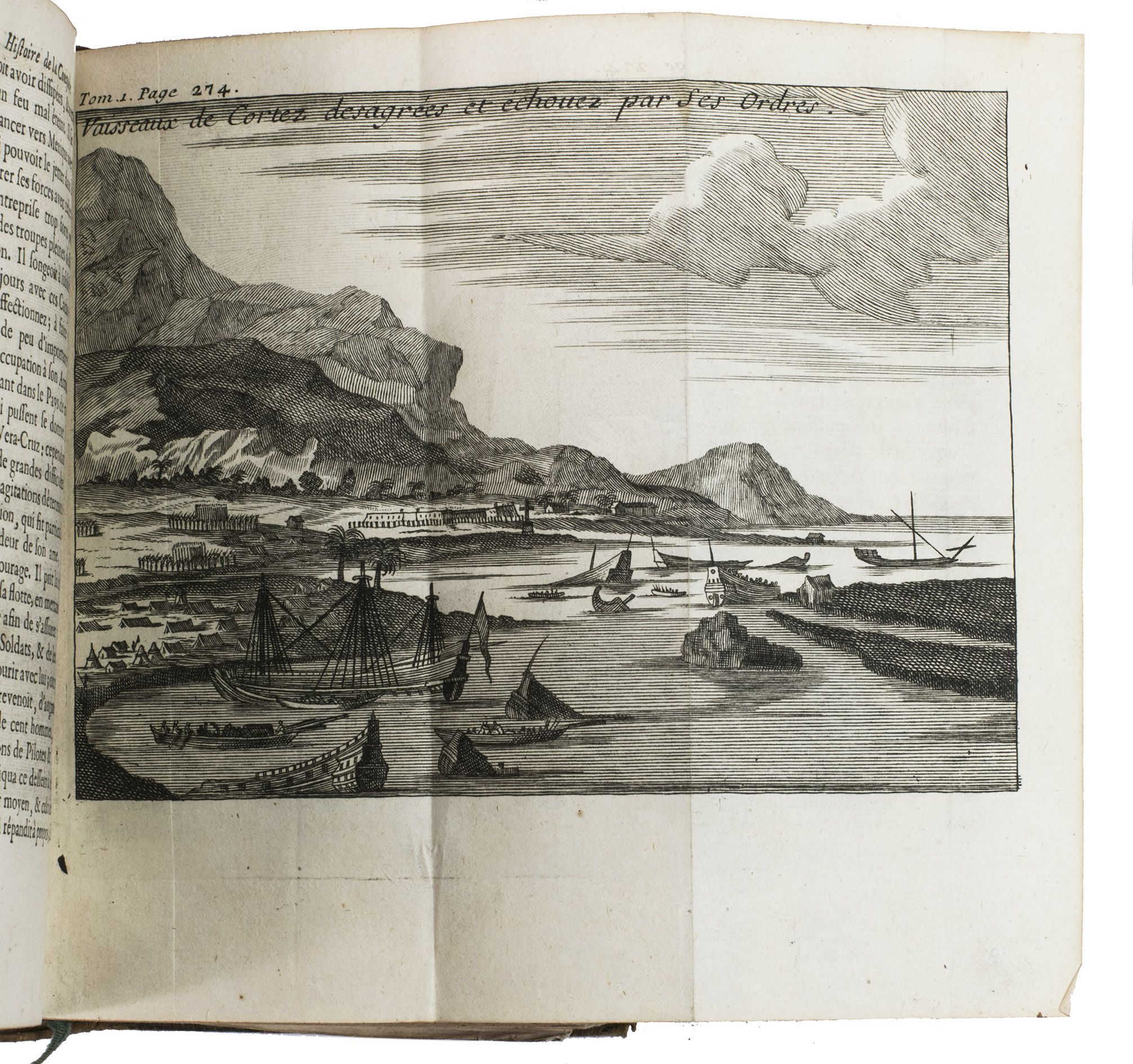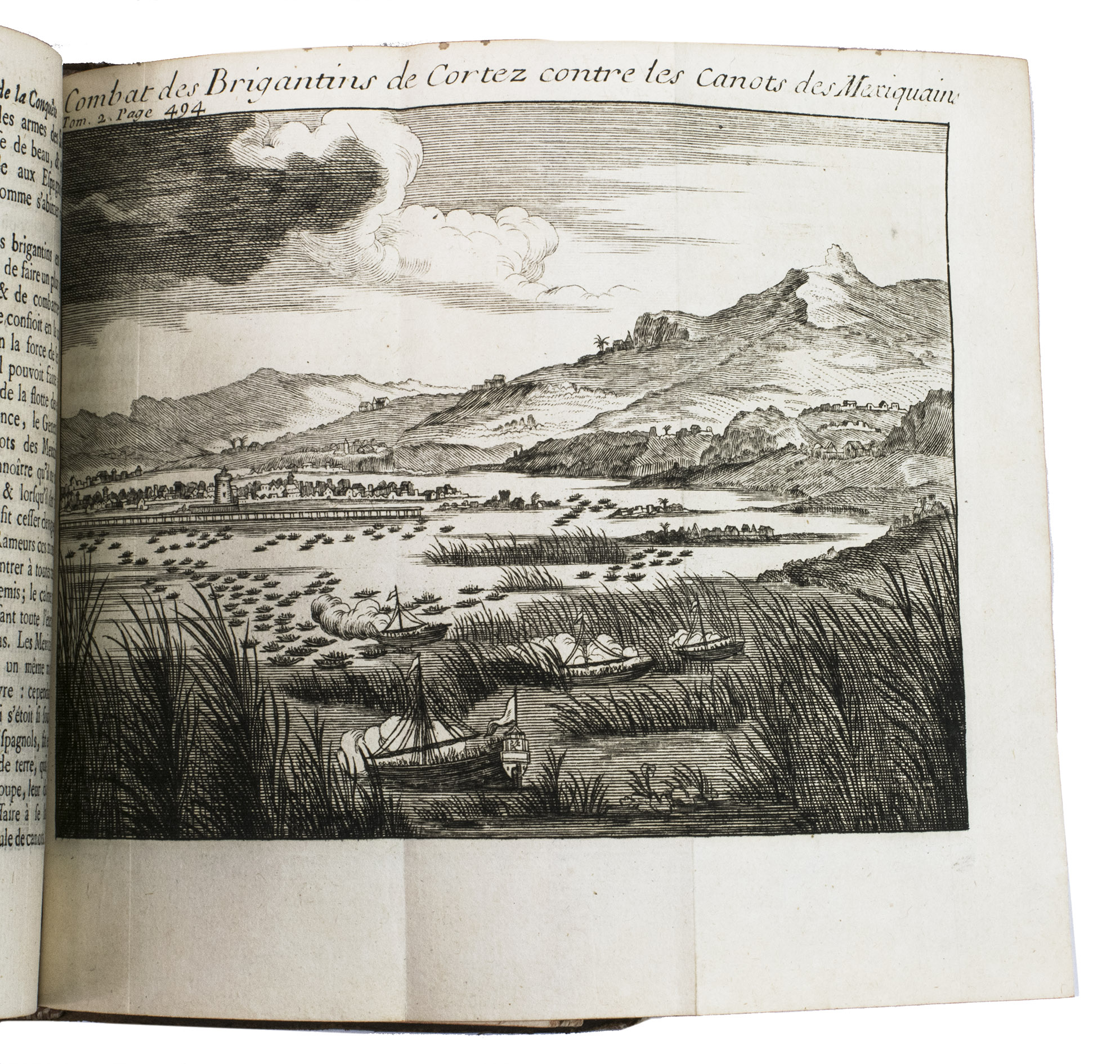 Fourth(?) edition of the French translation of the famous Historia de la Conquista de Mexico by the gifted Spanish historian Antonio de Solís y Ribadeneyra (1610-1686), originally published in Madrid in 1684. Renowned for his historical knowledge and his taste for letters, Solis was invited to become secretary to Philip IV, and in 1666 he was charged with the important function of cronista mayor, historiographer for the Indies and began working on the present publication. It covers in detail the three years following Cortés's conquests of what is now Mexico, mentioning many battles and shifts in power and describing the native inhabitants and their cities, temples, customs, etc. The plates include a general map of Mexico, some views of ships, a view of Mexico-city, a large folding bird's eye view of Tezeuco, a map of the area surrounding the lake of Mexico and views of battles.