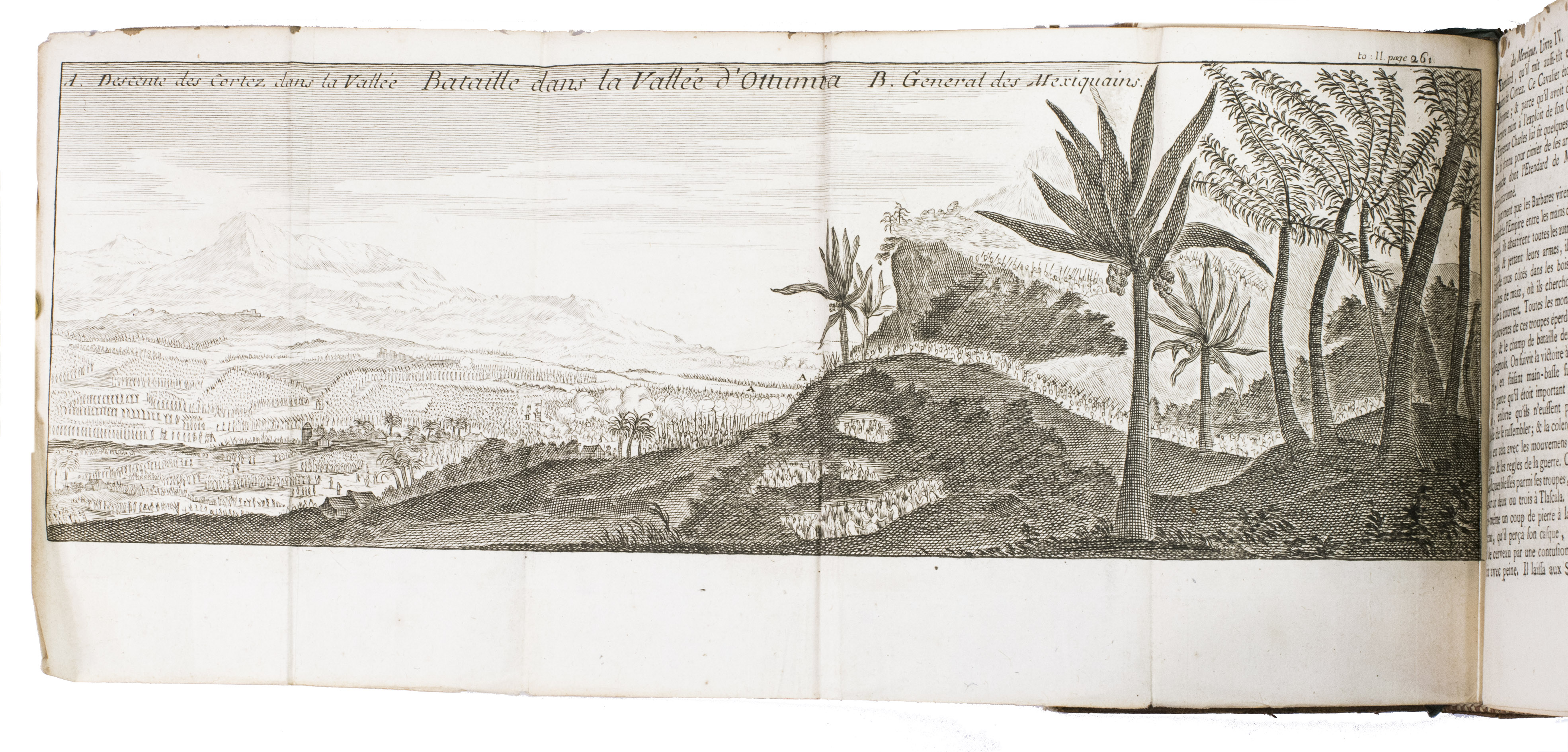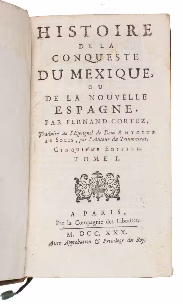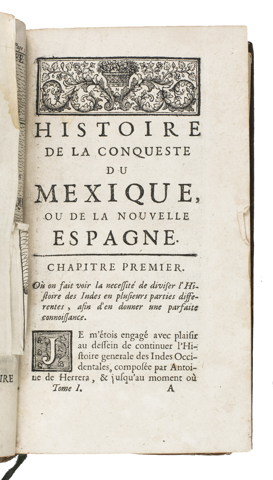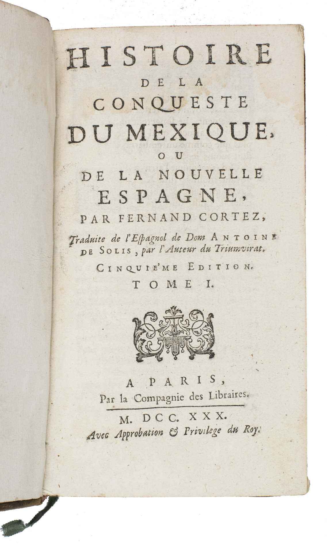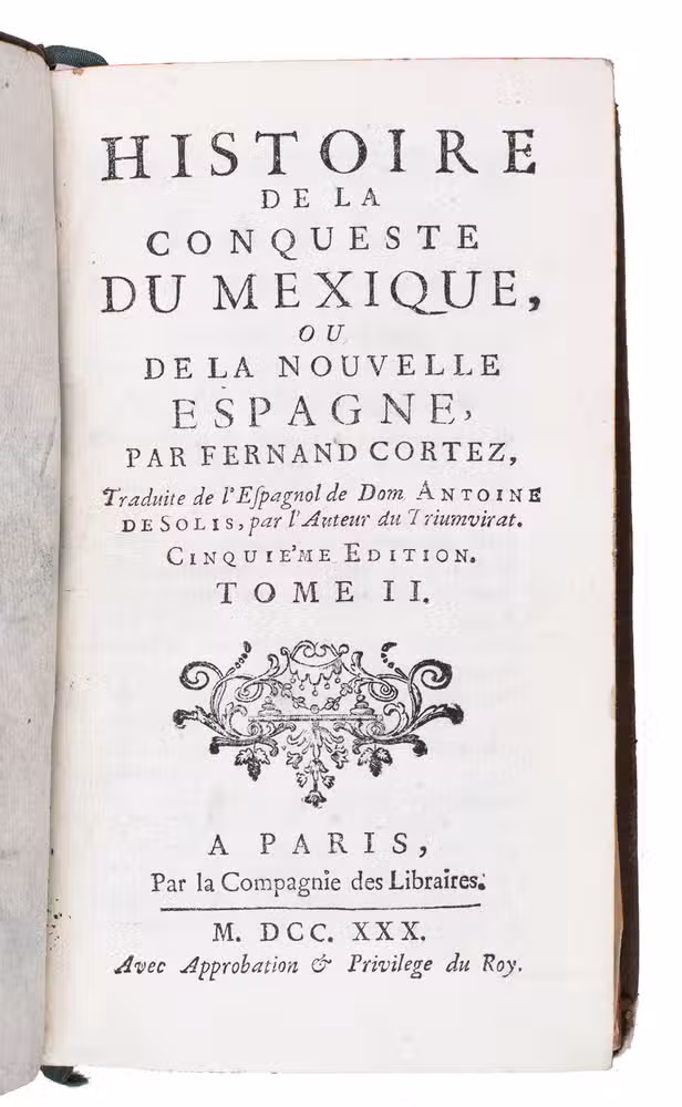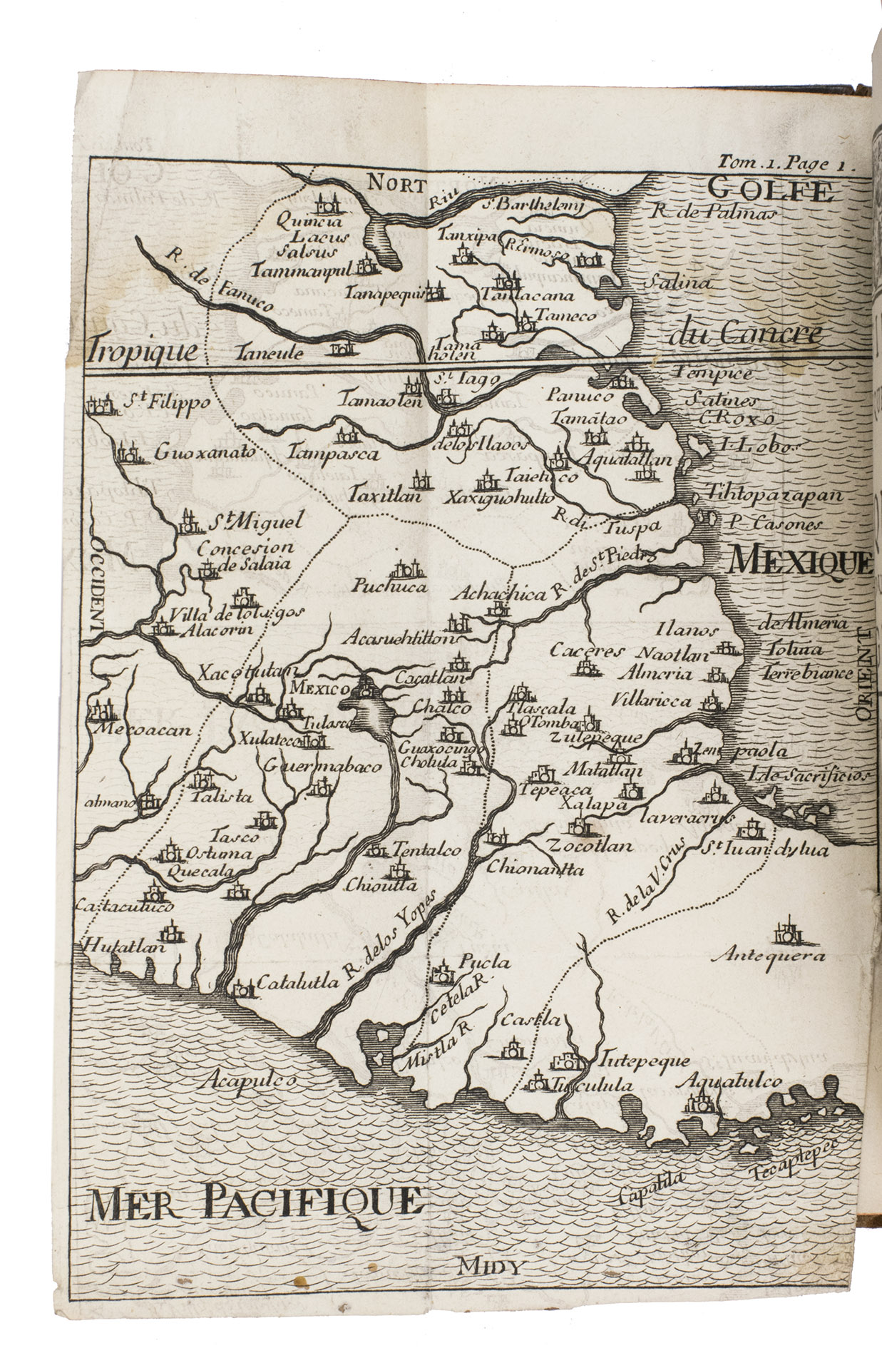 Fourth(?) edition of the French translation of the famous Historia de la Conquista de Mexico by the gifted Spanish historian Antonio de Solís y Ribadeneyra (1610-1686), originally published in Madrid in 1684. Renowned for his historical knowledge and his taste for letters, Solis was invited to become secretary to Philip IV, and in 1666 he was charged with the important function of cronista mayor, historiographer for the Indies and began working on the present publication. It covers in detail the three years following Cortés's conquests of what is now Mexico, mentioning many battles and shifts in power and describing the native inhabitants and their cities, temples, customs, etc. The plates include a general map of Mexico, some views of ships, a view of Mexico-city, a large folding bird's eye view of Tezeuco, a map of the area surrounding the lake of Mexico and views of battles.