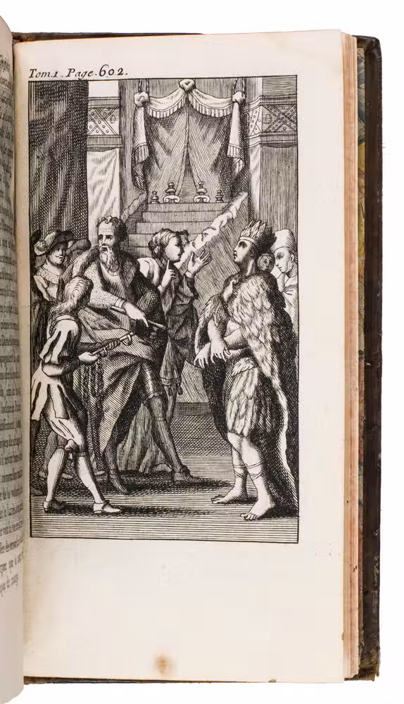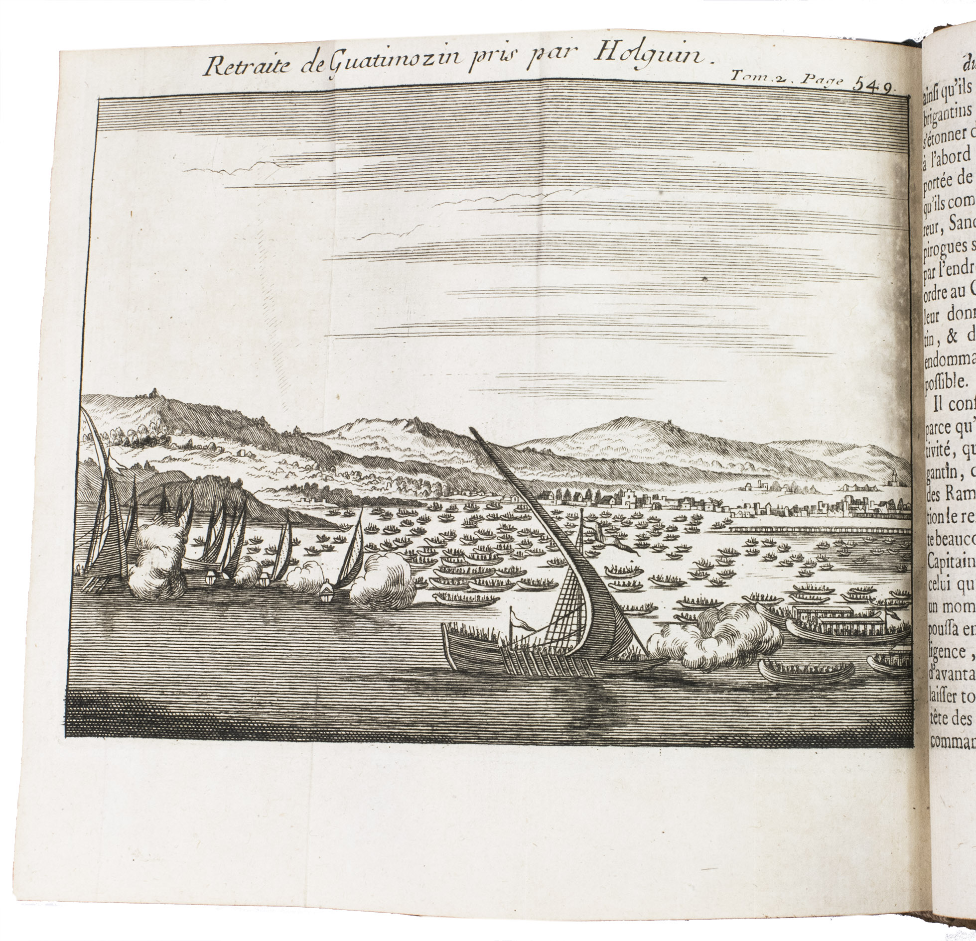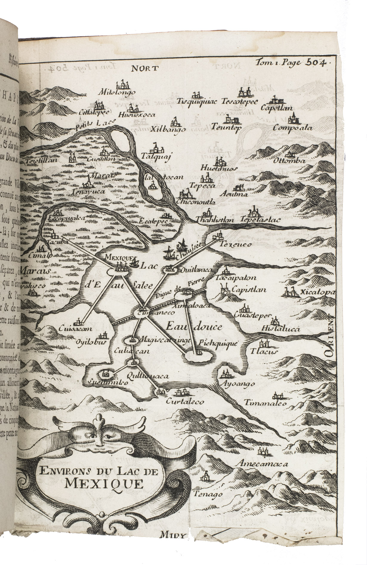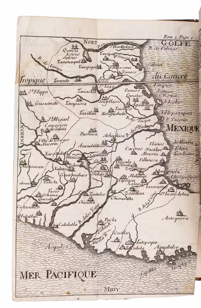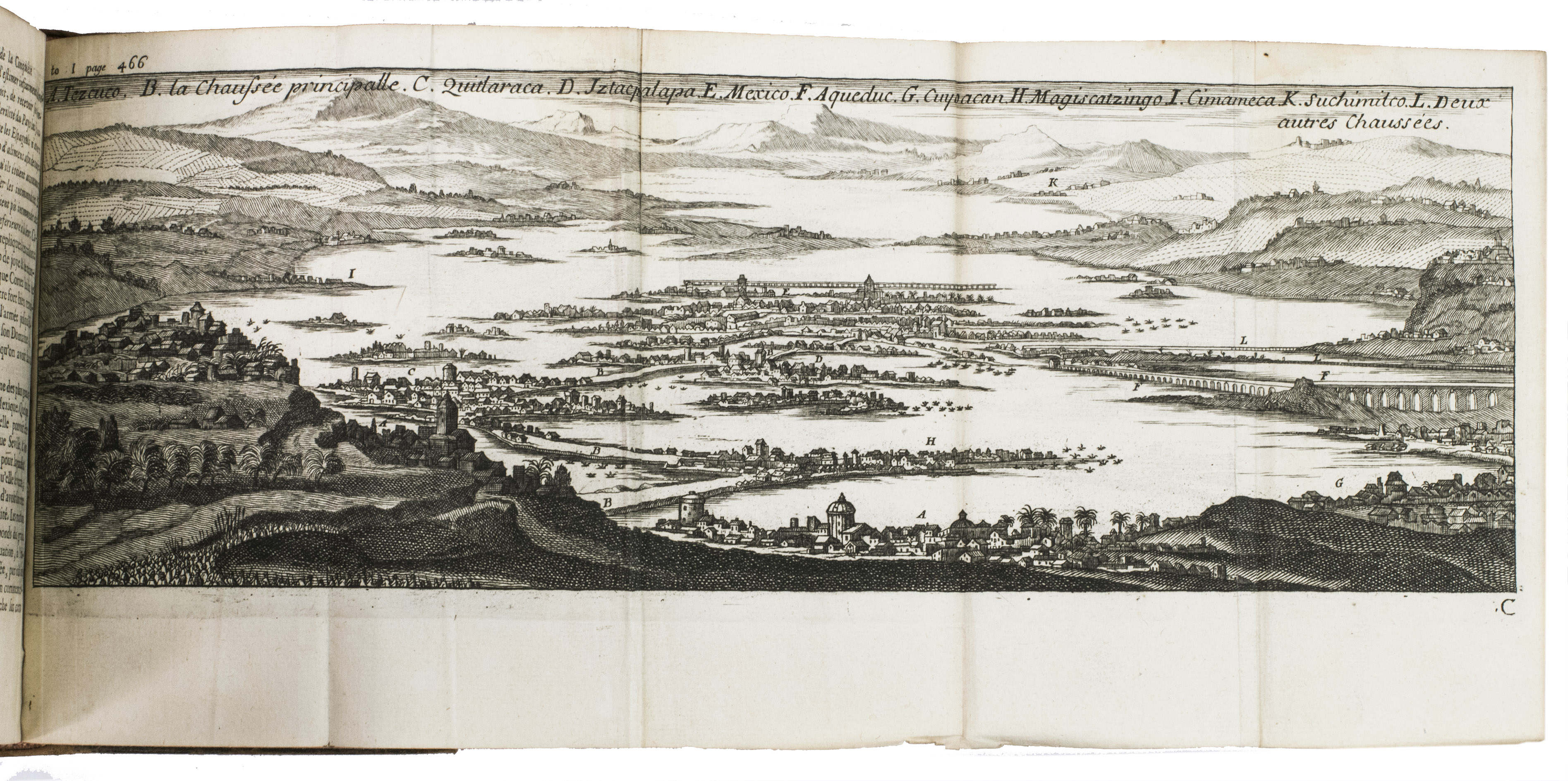 Fourth(?) edition of the French translation of the famous Historia de la Conquista de Mexico by the gifted Spanish historian Antonio de Solís y Ribadeneyra (1610-1686), originally published in Madrid in 1684. Renowned for his historical knowledge and his taste for letters, Solis was invited to become secretary to Philip IV, and in 1666 he was charged with the important function of cronista mayor, historiographer for the Indies and began working on the present publication. It covers in detail the three years following Cortés's conquests of what is now Mexico, mentioning many battles and shifts in power and describing the native inhabitants and their cities, temples, customs, etc. The plates include a general map of Mexico, some views of ships, a view of Mexico-city, a large folding bird's eye view of Tezeuco, a map of the area surrounding the lake of Mexico and views of battles.