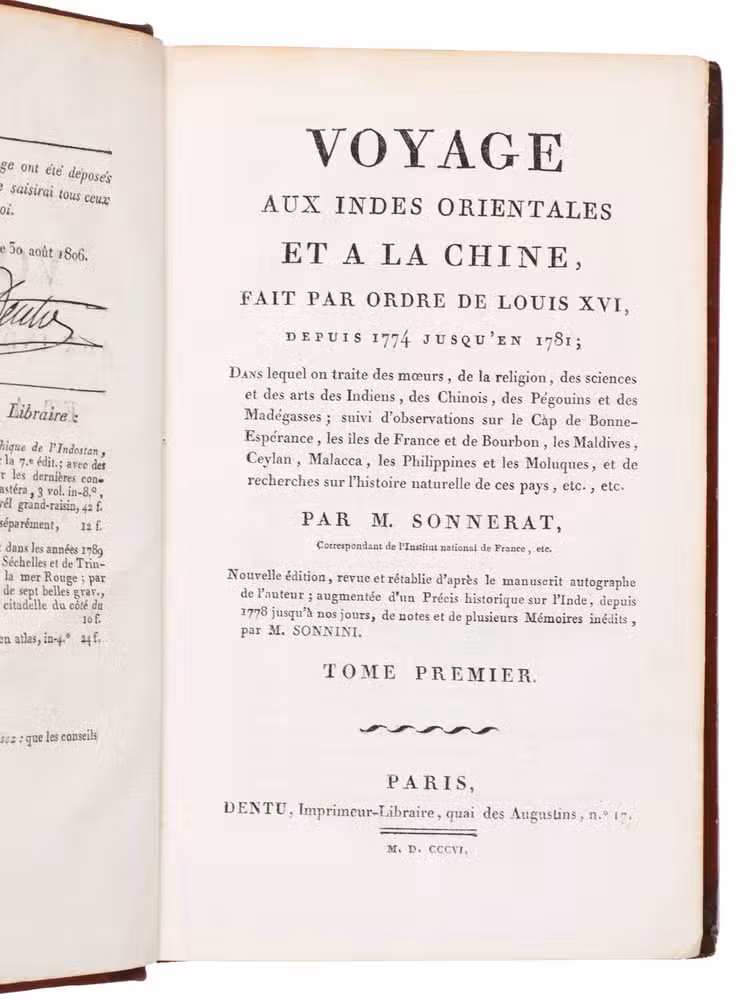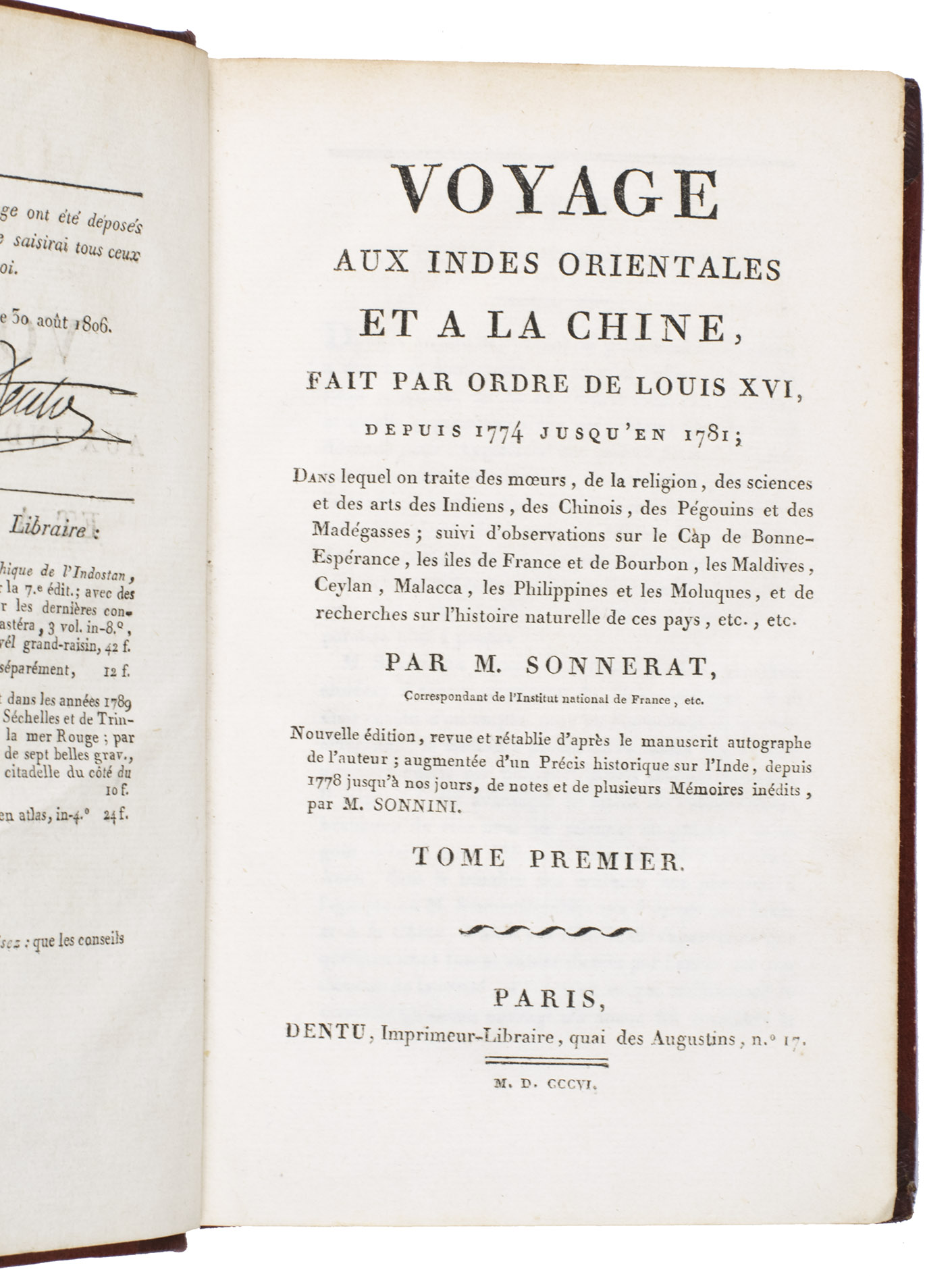 Much enlarged edition of a classic of natural history and discoveries in the Far East, including China, Ceylon, Malacca, the Philippines, Burma and the Maldives by Pierre Sonnerat (1748-1814), a well-known French naturalist and explorer. Sonnerat made several voyages to southeast Asia, visiting the Philippines and Moluccas between 1769 and 1772, and India and China from 1774 to 1781. Charles-Nicolas-Sigisbert Sonnini de Manoucourt (1751-1812) contributed much to this edition. "... in his two major publications it is evident that his insight into other civilisations gave a strong impetus in Europe to the spread of a fashionable interest in the religion, arts, and customs of India and the Indian Archipelago" (DSB).