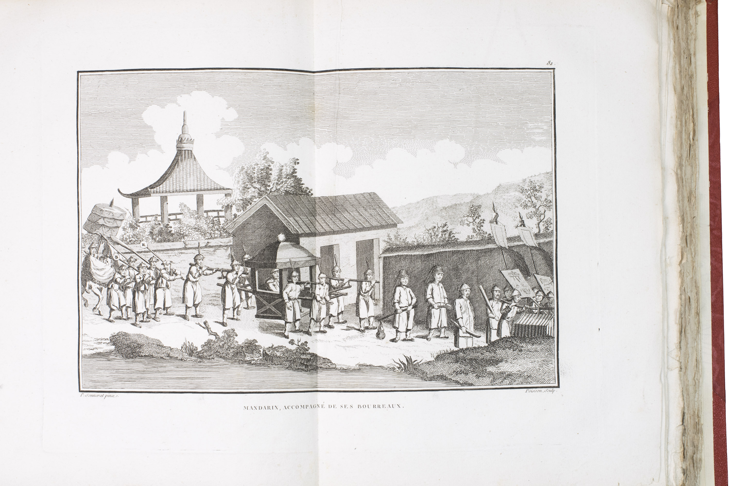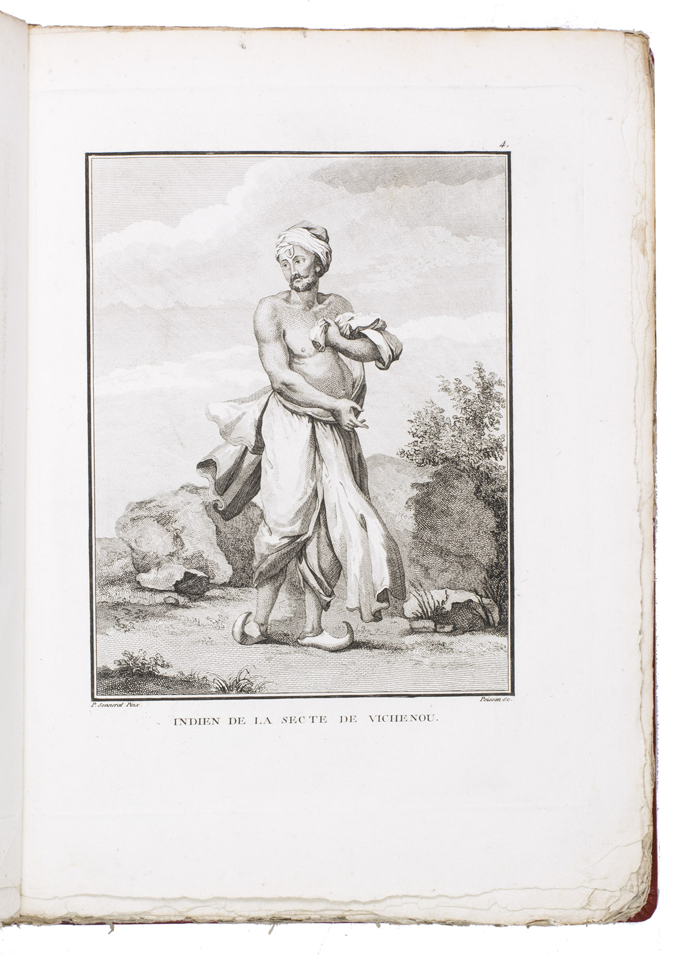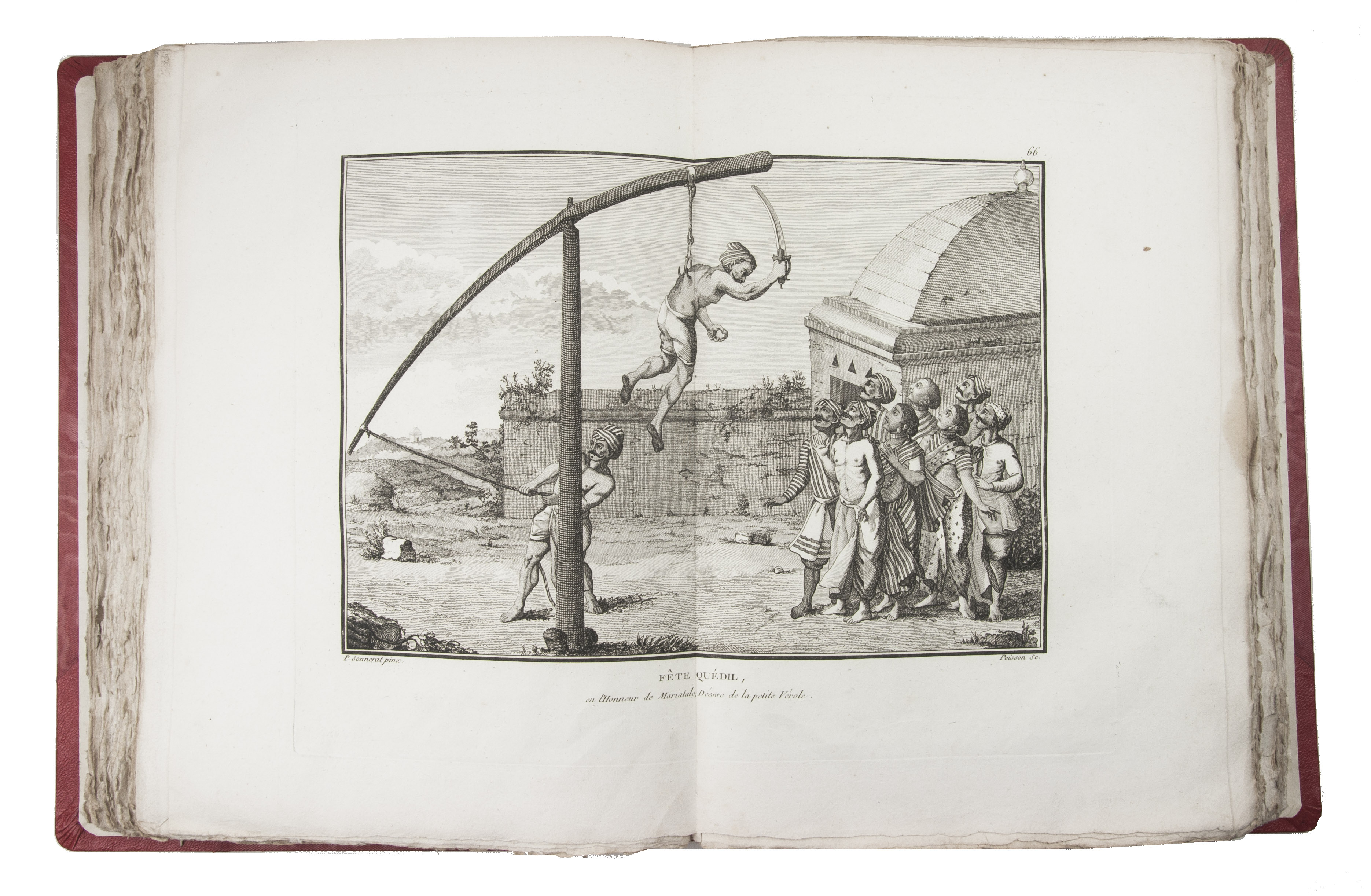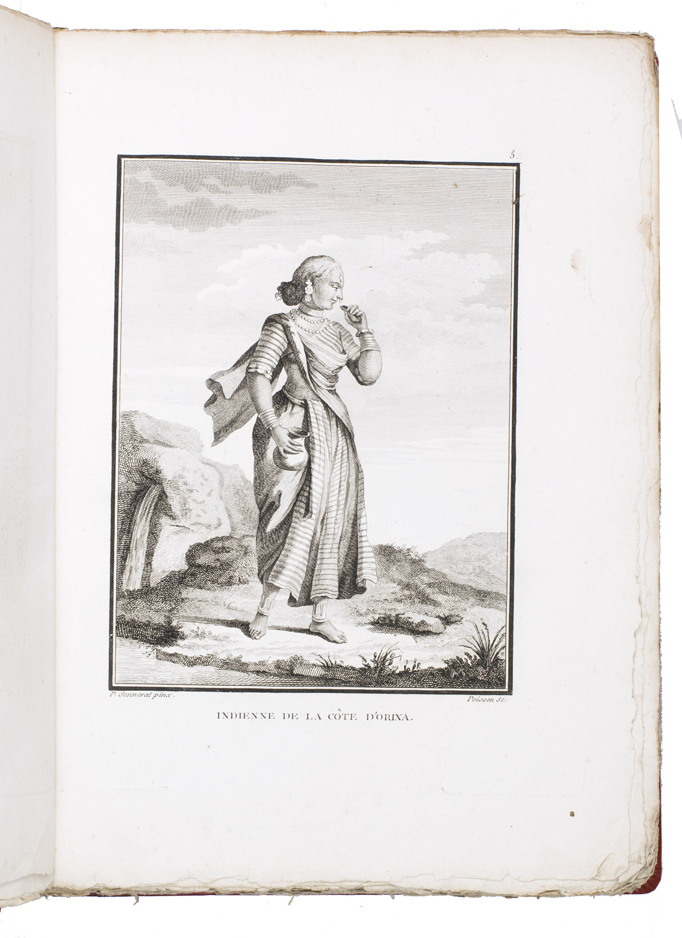 Paris, Dentu, 1806. 4 text volumes (8vo) and 1 atlas (4to). With 140 numbered engraved plates: a double-page plan of the city of Pondichéry, India, 19 double- and 120 single-page views and plates. Contemporary red half sheepskin (text) and modern red half cloth (atlas). Text volumes: XXVIII, 372; [4], 445; [4], 412, [2]; [4], 488, [1] pp.