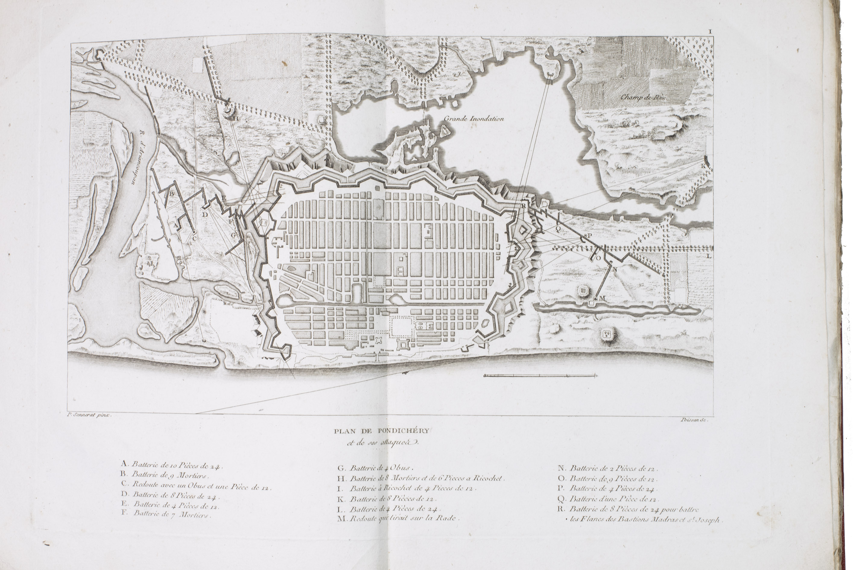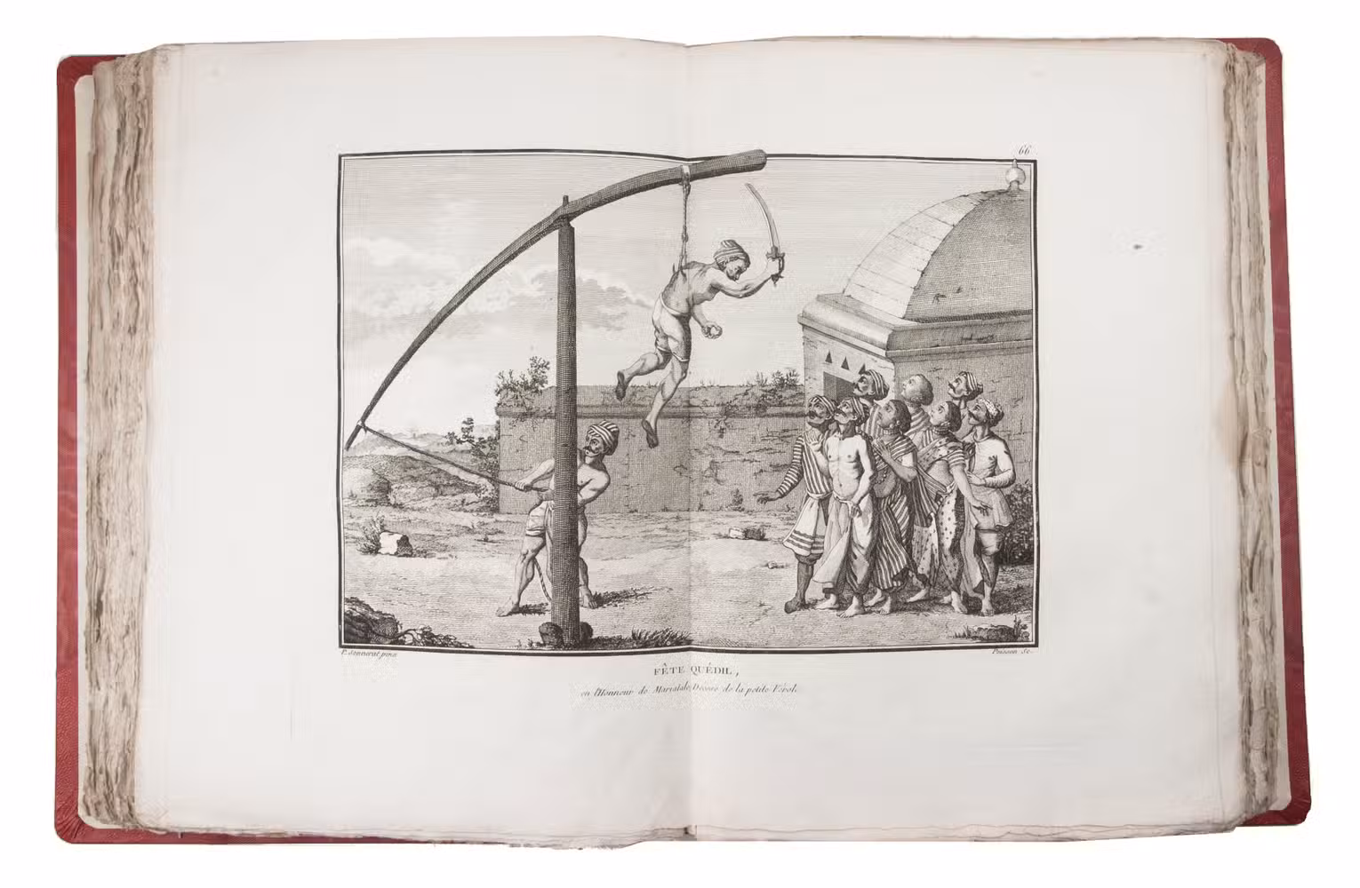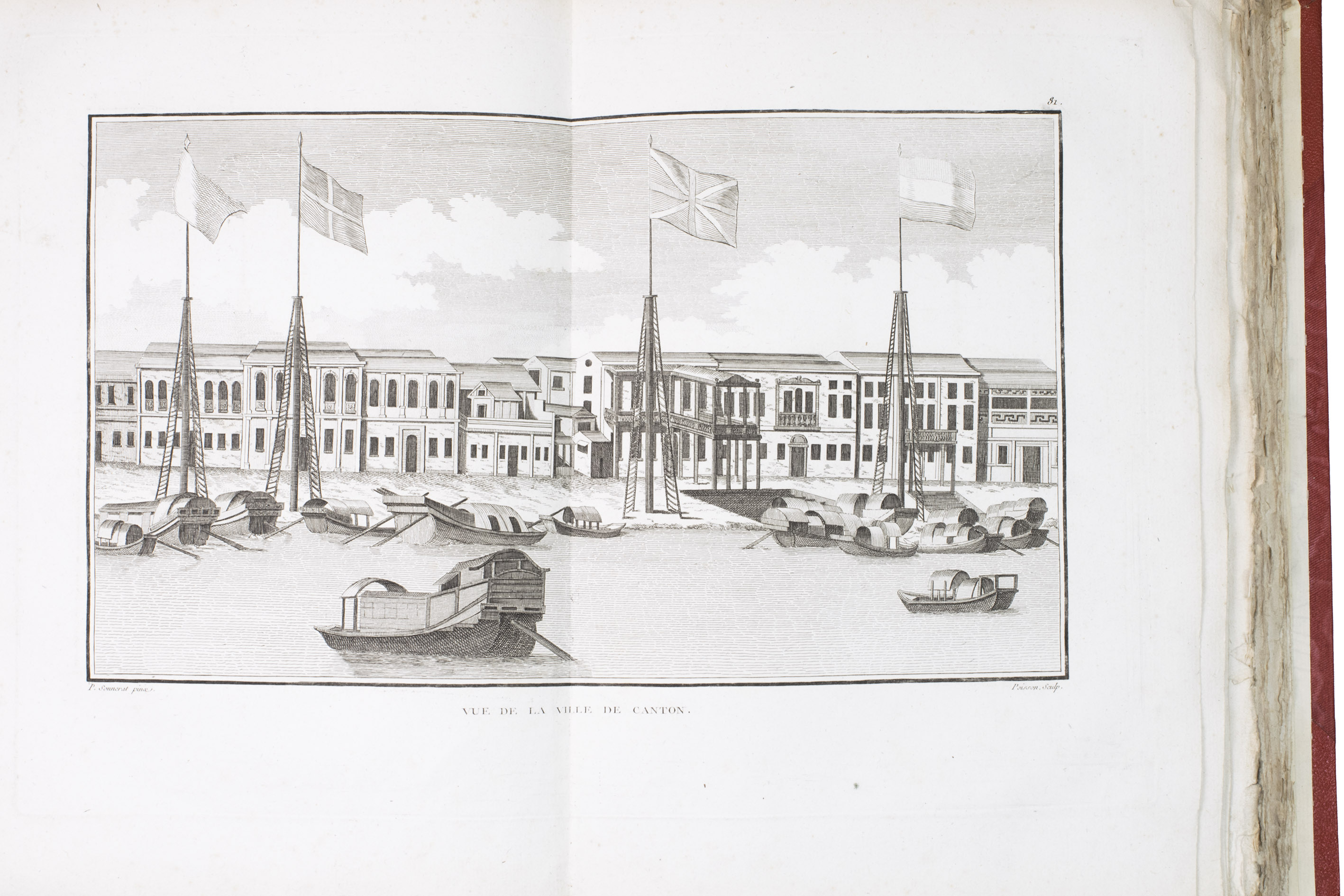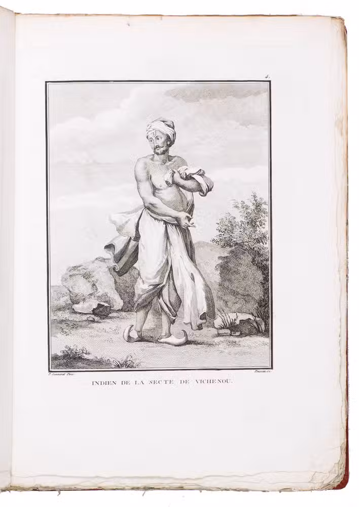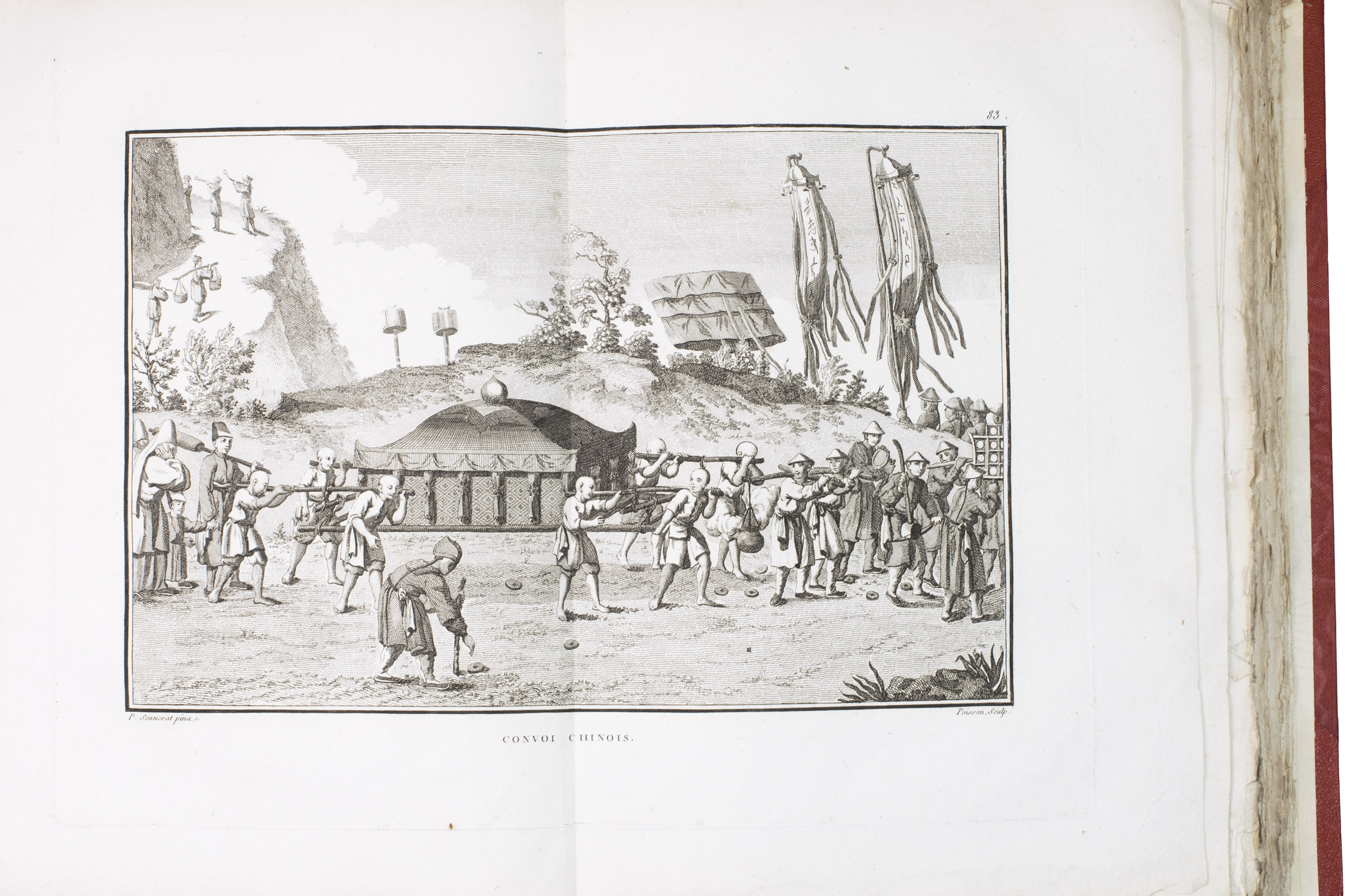 Paris, Dentu, 1806. 4 text volumes (8vo) and 1 atlas (4to). With 140 numbered engraved plates: a double-page plan of the city of Pondichéry, India, 19 double- and 120 single-page views and plates. Contemporary red half sheepskin (text) and modern red half cloth (atlas). Text volumes: XXVIII, 372; [4], 445; [4], 412, [2]; [4], 488, [1] pp.