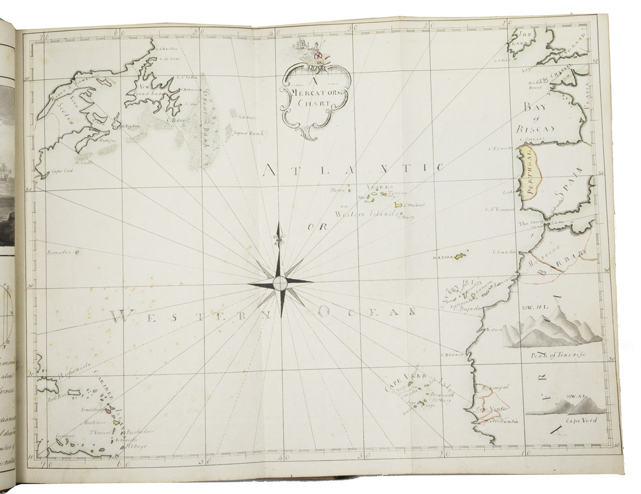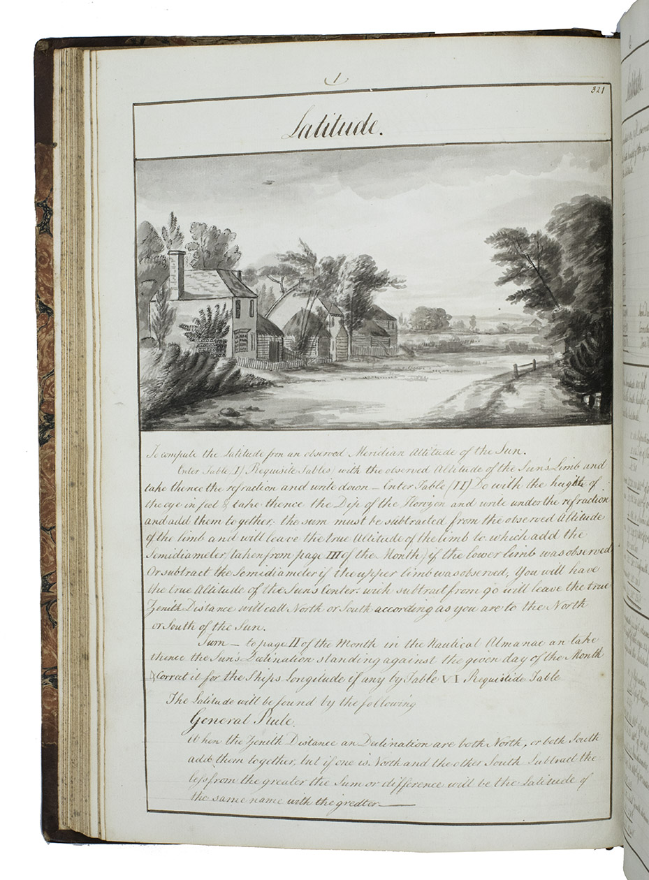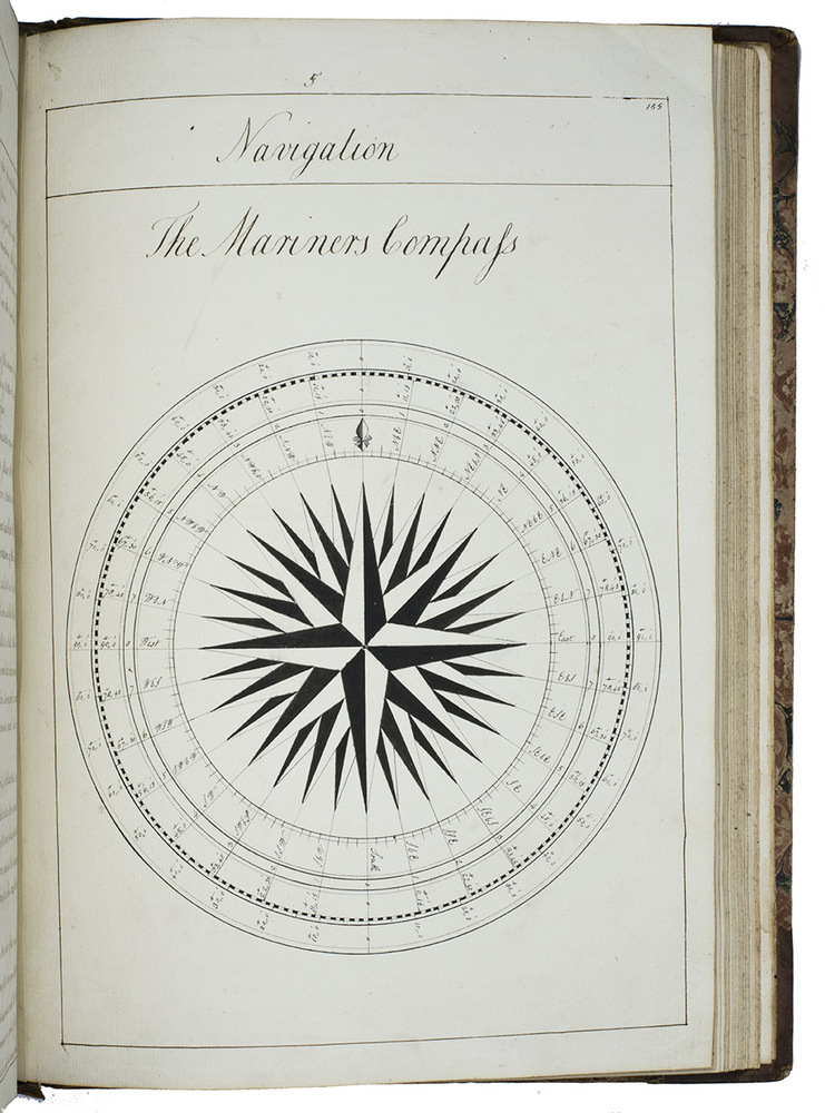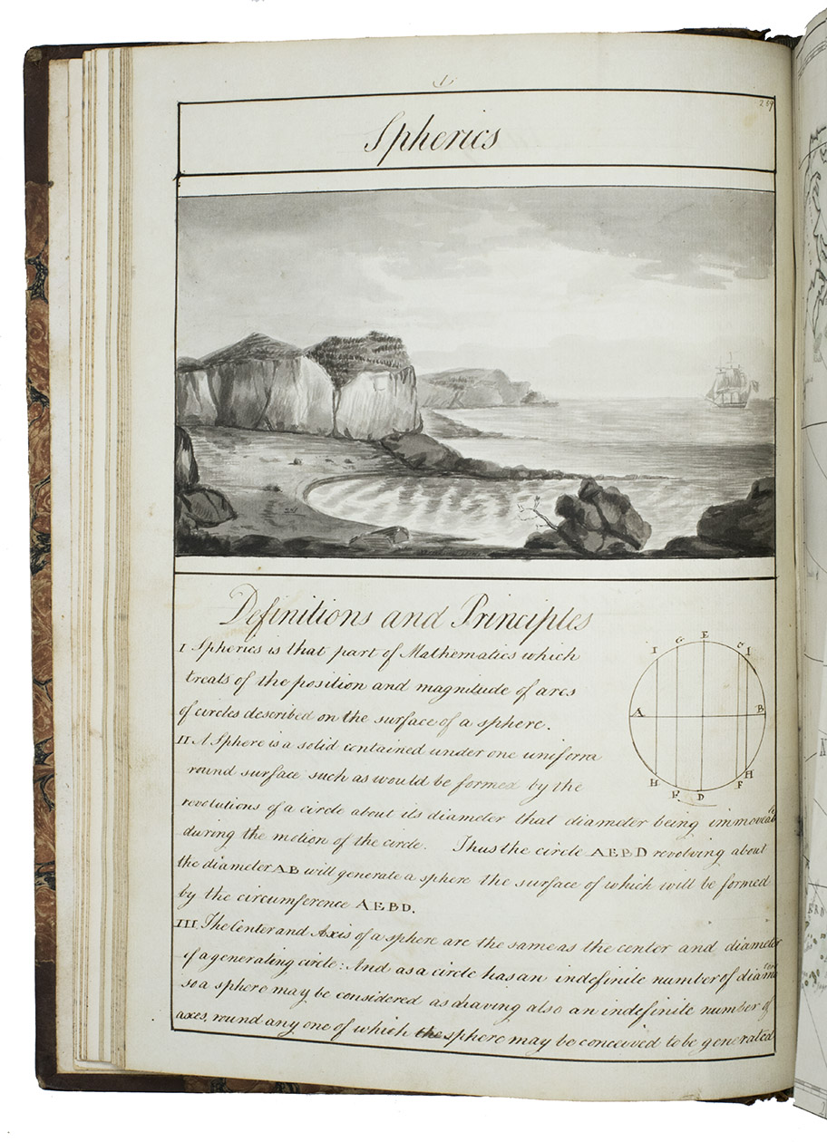 Exercises in mathematics, navigation, fortification, surveying, mechanics, etc., at the Royal Naval Academy in Portsmouth, finely executed by the future Admiral Charles Sotheby (1782-1814) when he studied there in the years 1795 to 1798 (probably ages 13 to 15). The large folding nautical chart of the North Atlantic shows the North American coast from Newfoundland to Cape Cod, the Caribbean and Atlantic islands and the coasts of West Africa and western Europe, while the full-page one includes the coasts of Greenland, Iceland, western Europe, West Africa, the Atlantic islands and a sand bank off Newfoundland. The other nautical charts show Christmas Island (off the coast of Java, though the form differs), Palmerston Island (in the South Pacific) and Table Bay (at Cape Town, South Africa) in great detail. The pages have been numbered as a whole, with a single series covering both volumes, and mostly also section by section with the following number of pages: arithmetic 56, geometry 48, plane trigonometry 18, the description and use of the terrestrial globe 5, geography 12, chronology 10, navigation 17 & 29, spherics 28, astronomy 34, latitude 13, longitude [33], days works [= journal keeping] [22], marine surveying [31], fortification [29], gunnery [22] and mechanics [19].