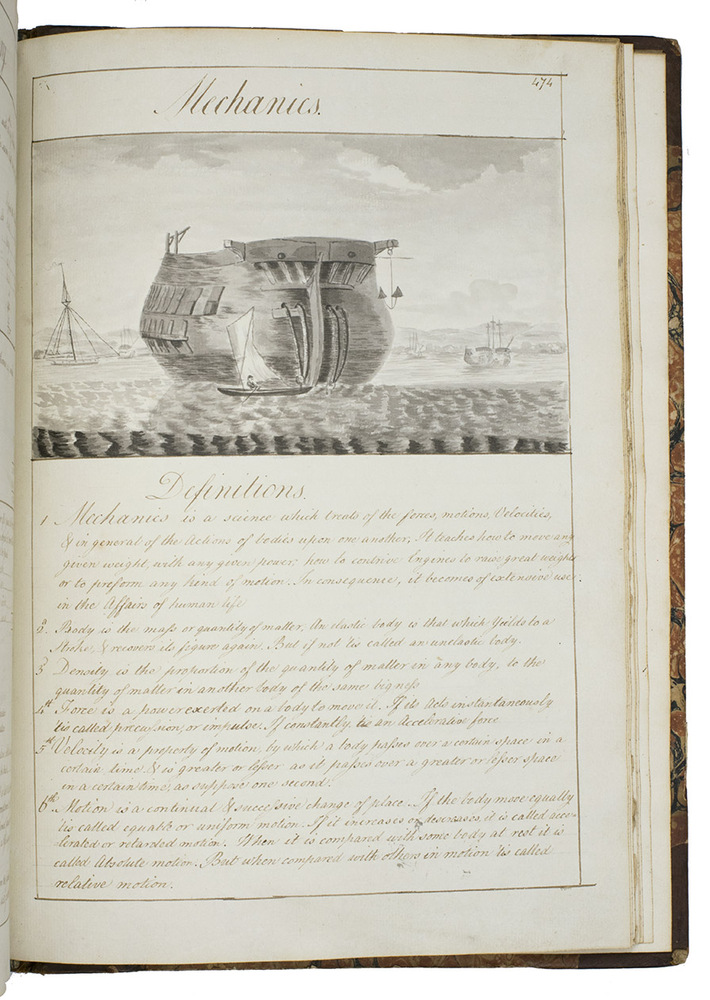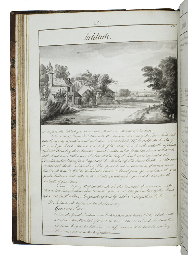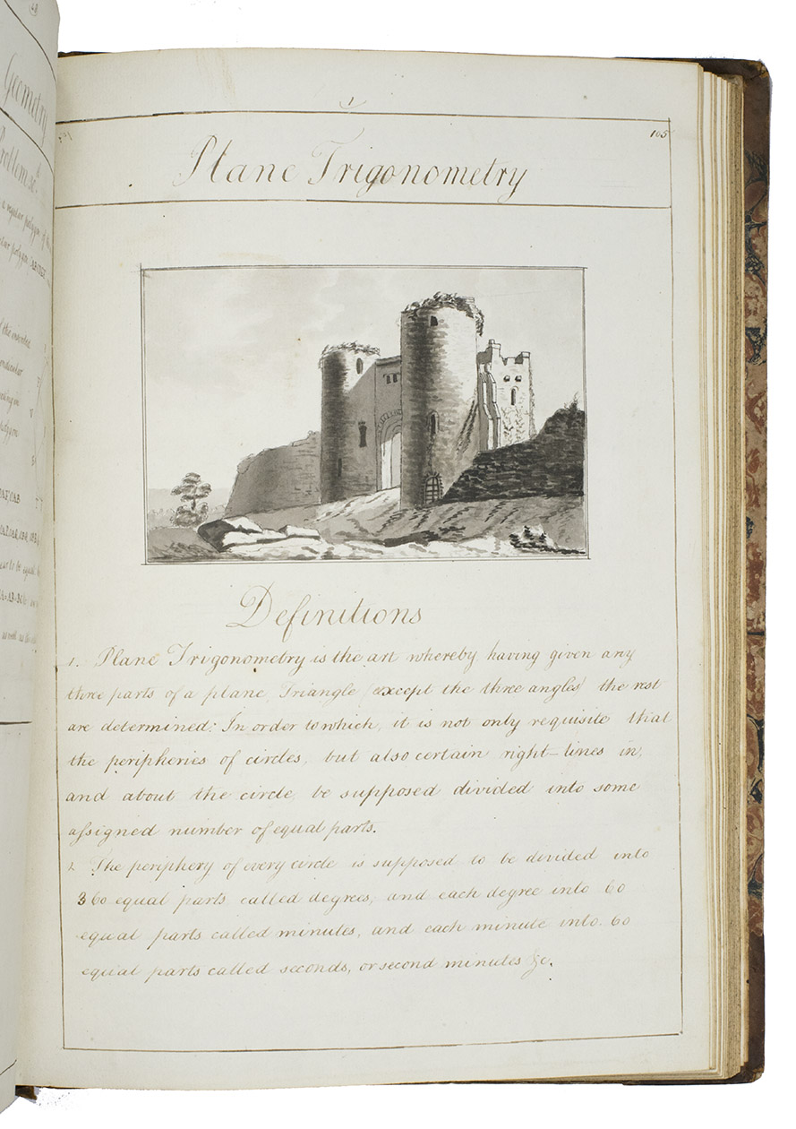 [Portsmouth], "177 " [recté 1795-1798]. 2 volumes. Imperial 4to (37.5 x 27 cm). Manuscript school exercises with a pre-printed engraved title-page with a blank space for the student to add his name, with 4 full-page and 1 larger folding nautical charts (some partly in colour), 7 full-page fortification plans (in black ink with 1 to 3 colours), 4 full-page astronomical diagrams (2 also with yellow), a full-page compass rose, 23 pen and ink wash views in the text (9 x 15 cm to 12.5 x 22 cm, 1 also with blue washes), and numerous other diagrams (including maps in the surveying section) and some illustrations in the text. Near contemporary (ca. 1803) blind- and gold-tooled half calf, blue sprinkled edges. engraved title-page + “229” [= 228]; 230-493, [2 blank] pp., with pp. 229 and 493 blank excepting the page numbers.
