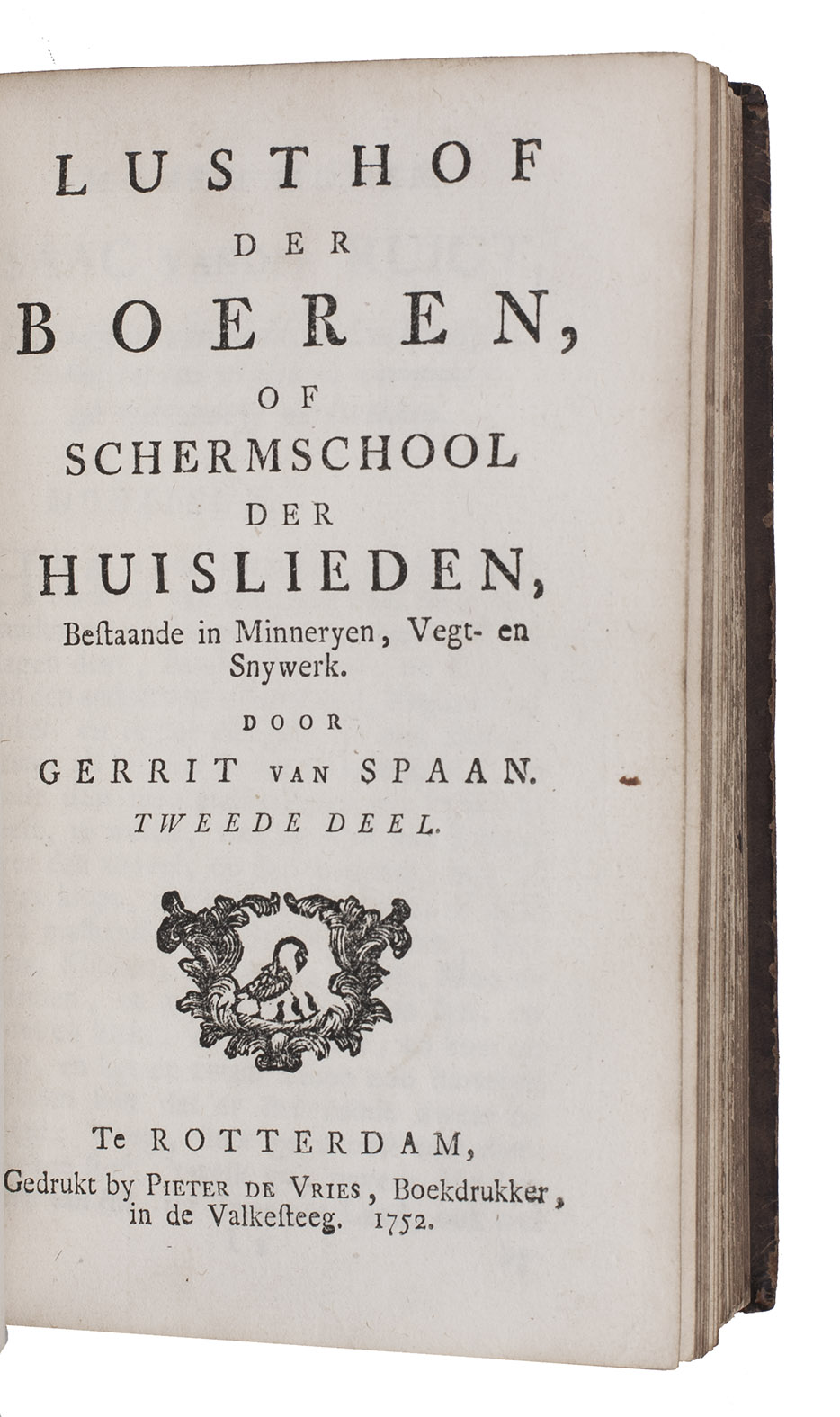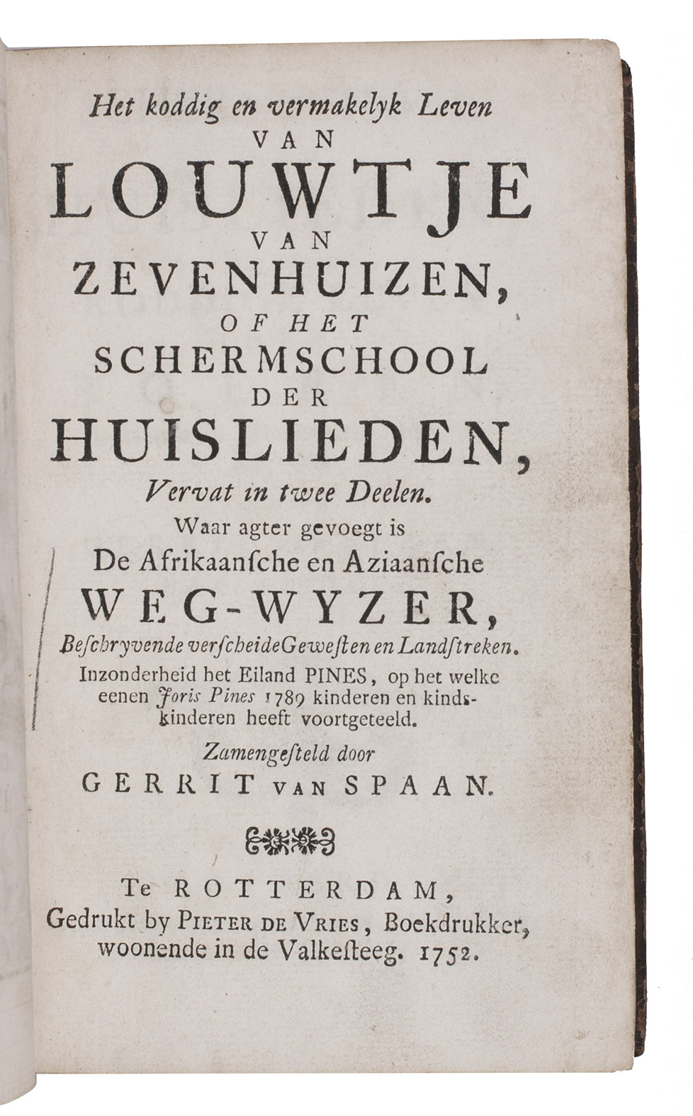 Second edition, by the printer-publisher of the 1704 first edition, of a rare coarse satire whose title can be translated as, "The comical and entertaining life of Louwtje Zevenhuizen, or the family fencing school." The two volumes of the "fencing school" are followed by the African and Asiatic guide, which Spaan had published separately in 1694 and 1695. The former includes a chapter on the fictitious Isle of Pines.