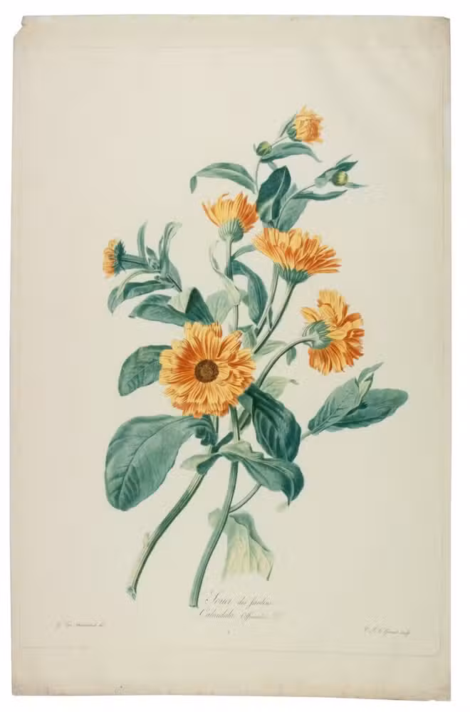 [Paris, 1799-1801]. Stipple engraving on unwatermarked wove paper (56 x 36.5 cm), printed in colour à la poupée and finished by hand, of a Calendula officinalis showing two branches with seven flowers and buds in various stages, signed "P.F. Le Grand sculp." In passepartout.