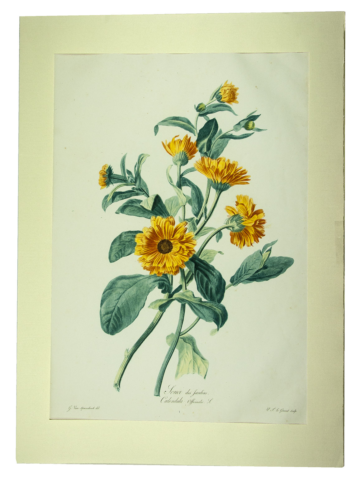 Magnificent illustration of a Calendula officinalis, commonly known as a pot marigold, printed in colour and delicately finished by hand. This flowering plant is probably native to southern Europe, but also found further north in Europe and elsewhere in warm temperate regions. It is originally part of a series of flower prints by Gerard van Spaendonck, the only engraved work published during his lifetime, "entitled Fleurs dessinées d'après Nature, which contains twenty-four magnificent drawings, brilliantly interpreted in stipple by P.F. Le Grand and other engravers. These are probably the finest engravings of flowers ever made" (Blunt) and "they are among the most breath-taking series of plates in the [Hunt] library" (Hunt). The series was originally published in 6 parts with 4 plates and available printed in black, printed in colour, or (as in the present case) printed in colour and finished by hand.