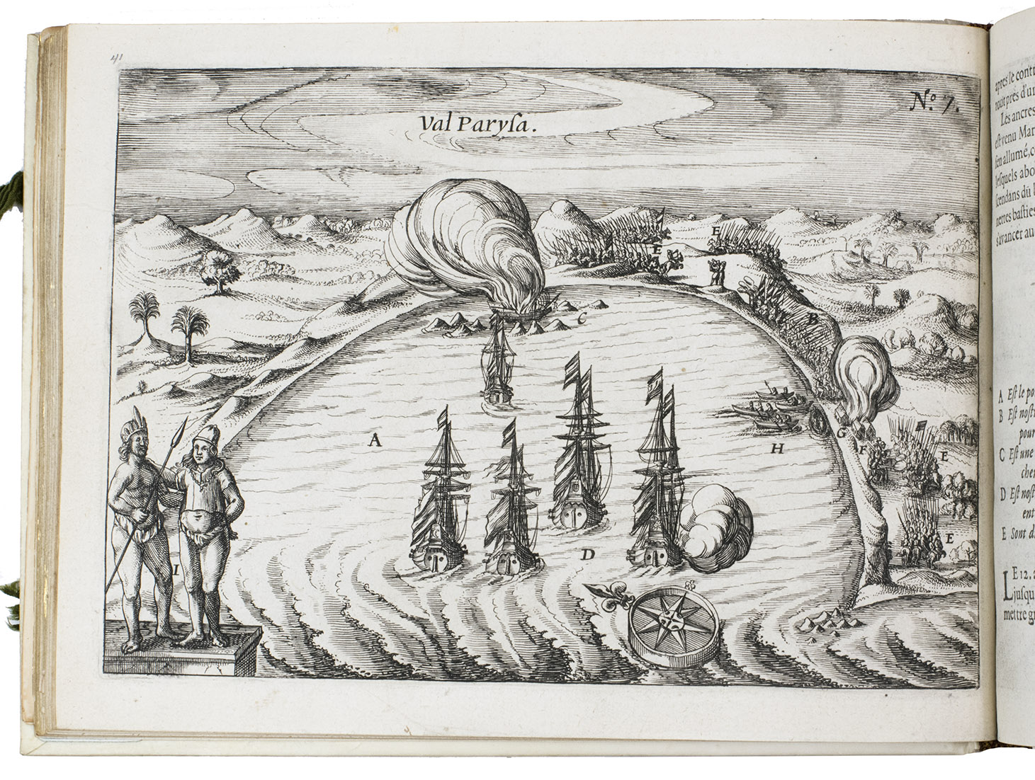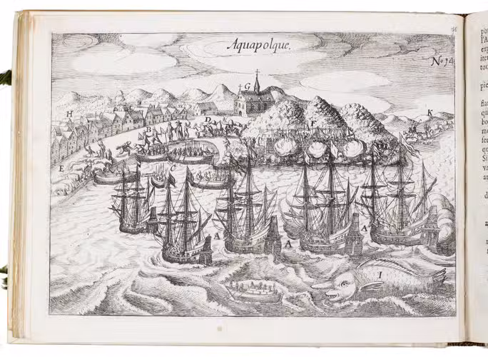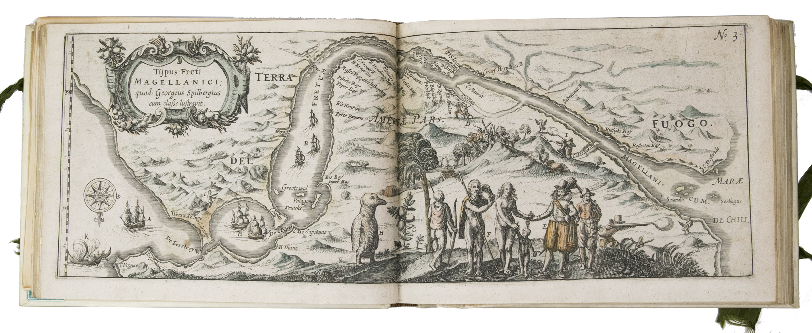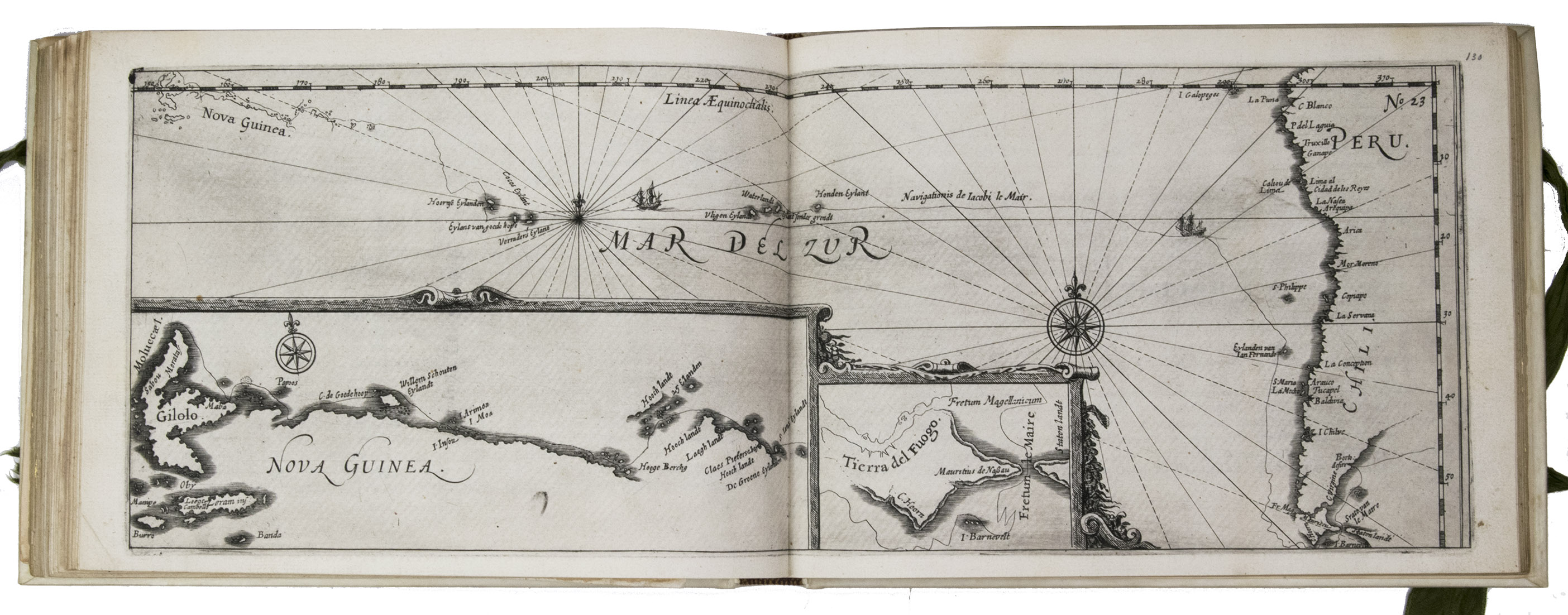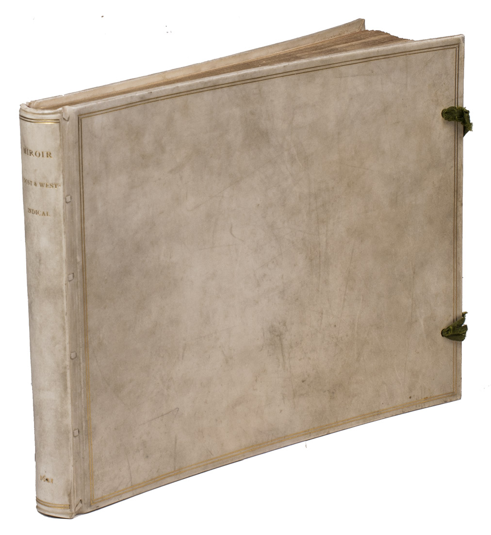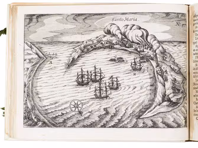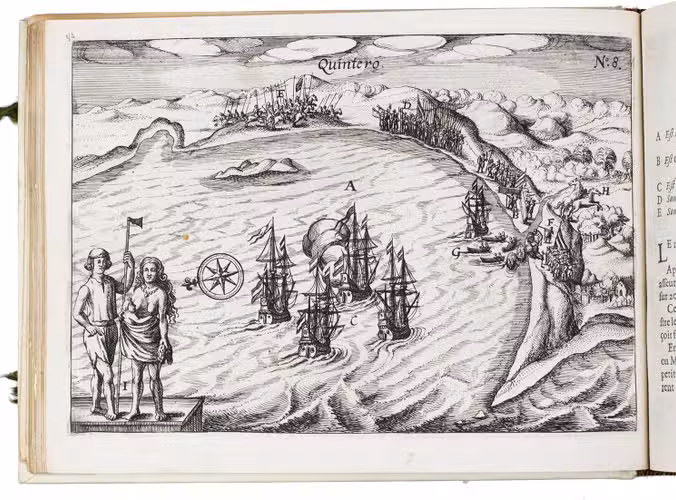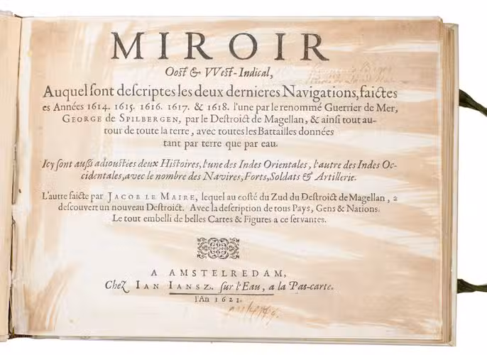 First and only edition of the French translation of one of the bestsellers of illustrated 17th-century travel literature, describing one of the most famous early voyages around the world by Joris van Spilbergen (1568-1620), a veteran Dutch East Indies naval officer-turned-pirate, undertaken from 1614 to 1618. A short survey of another of the most important early voyages around the world, by Schouten and Le Maire in the years 1615 to 1617, is added at the end (pp. 117-172) with drop-title "Navigationes Australes". It reports Le Maire's proof that Tierra del Fuego is an island and his discovery of what is still called the Strait of Le Maire, an alternative route to the Pacific. Rich in ethnographic detail, the numerous illustrations in the Miroir include oversized penguins, llamas and an Andean condor with a nine-foot wing span. Naval battles, beleaguered Spanish settlements, and newly discovered islands are also depicted in detail, making the work a valuable compendium of adventure on the high seas during the Age of Discovery.