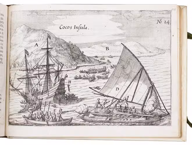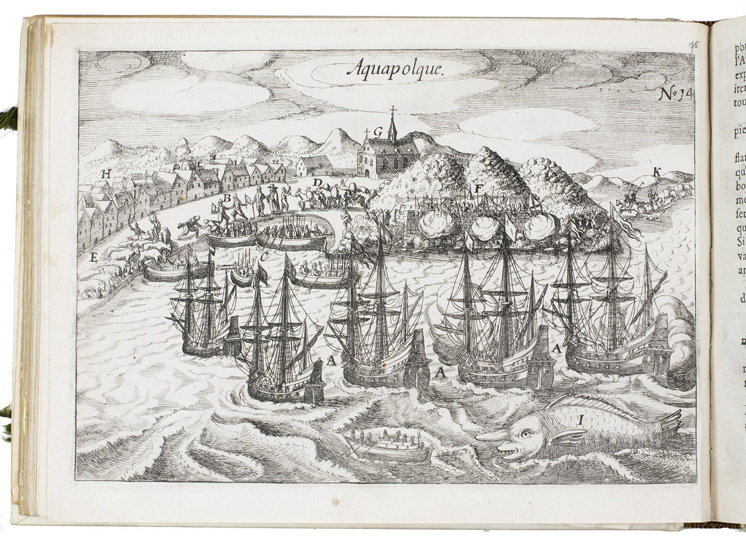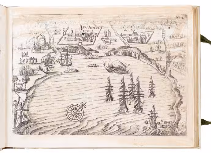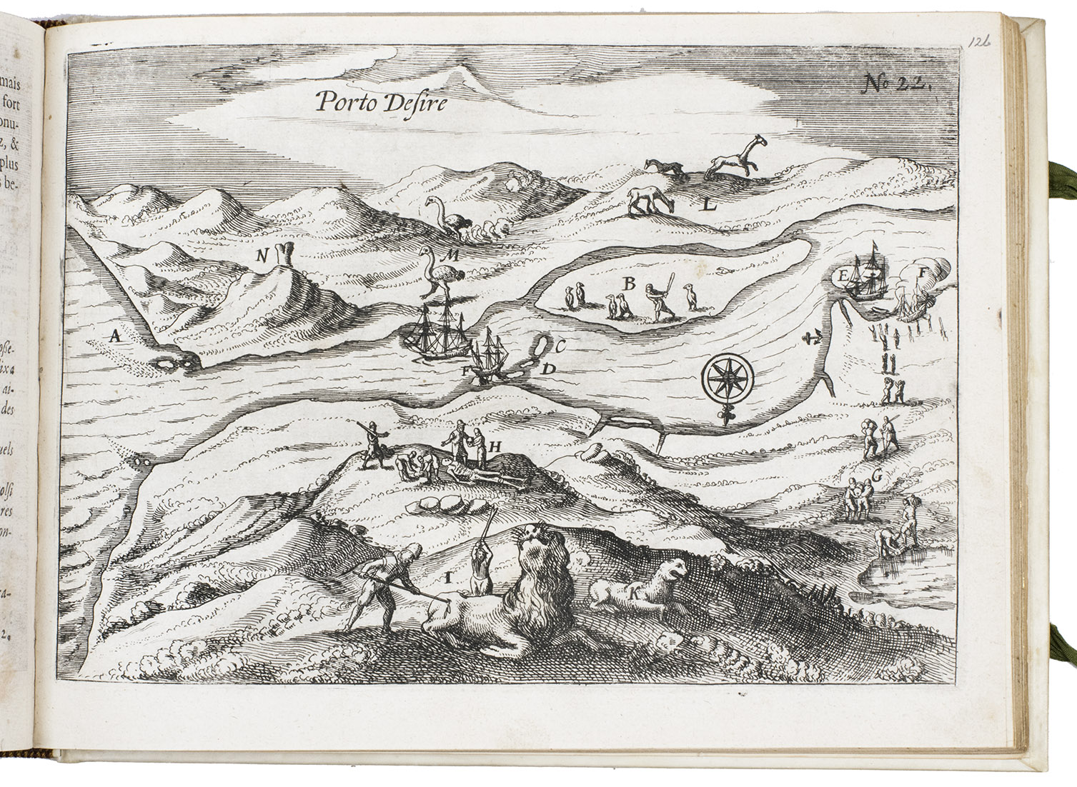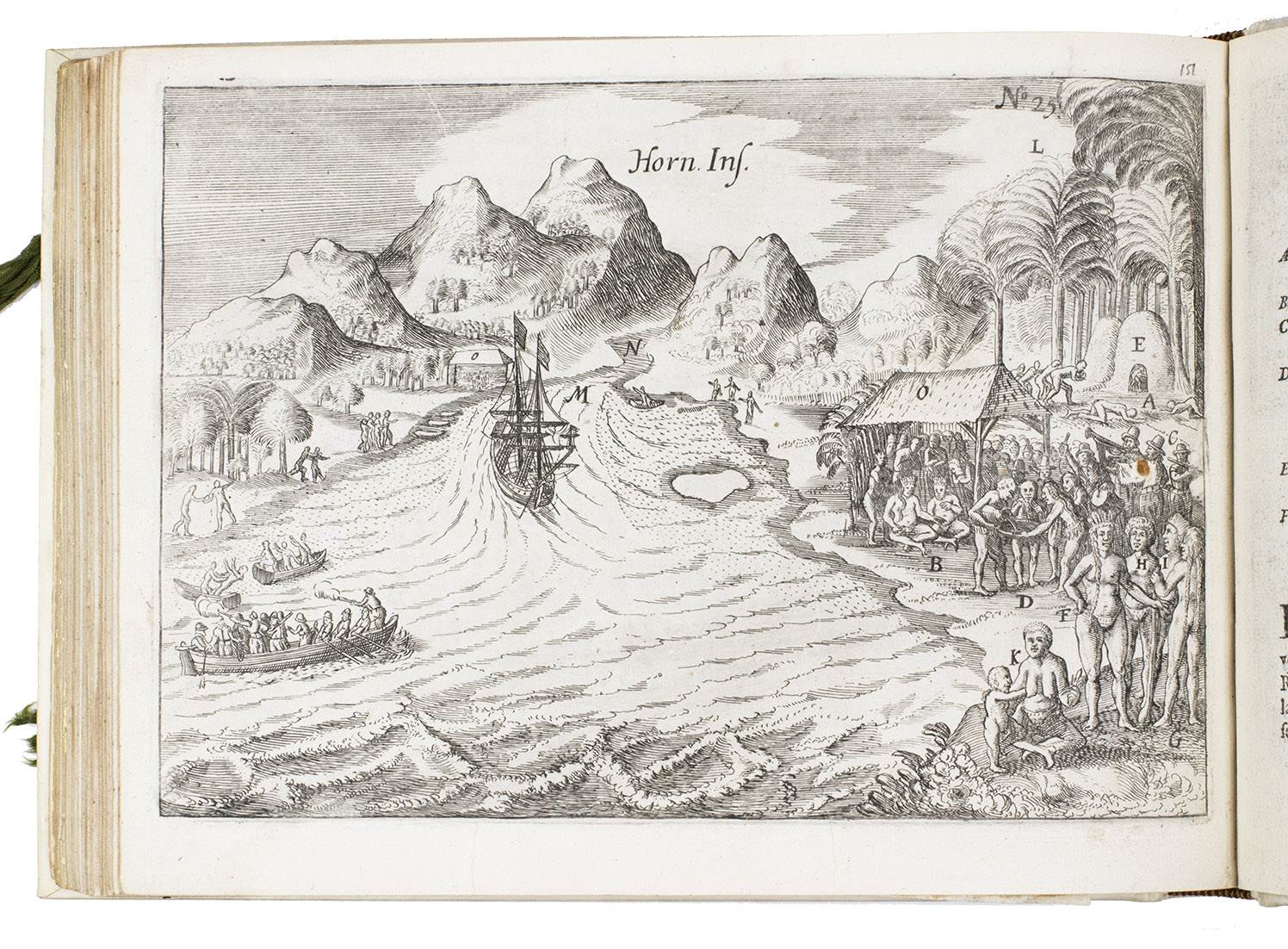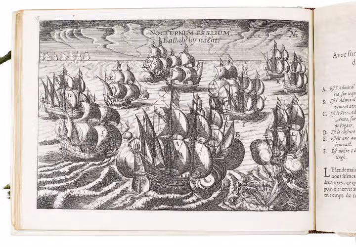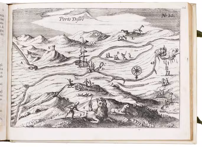 First and only edition of the French translation of one of the bestsellers of illustrated 17th-century travel literature, describing one of the most famous early voyages around the world by Joris van Spilbergen (1568-1620), a veteran Dutch East Indies naval officer-turned-pirate, undertaken from 1614 to 1618. A short survey of another of the most important early voyages around the world, by Schouten and Le Maire in the years 1615 to 1617, is added at the end (pp. 117-172) with drop-title "Navigationes Australes". It reports Le Maire's proof that Tierra del Fuego is an island and his discovery of what is still called the Strait of Le Maire, an alternative route to the Pacific. Rich in ethnographic detail, the numerous illustrations in the Miroir include oversized penguins, llamas and an Andean condor with a nine-foot wing span. Naval battles, beleaguered Spanish settlements, and newly discovered islands are also depicted in detail, making the work a valuable compendium of adventure on the high seas during the Age of Discovery.
