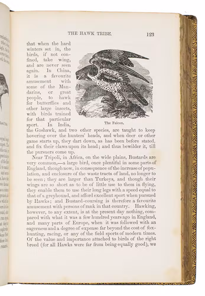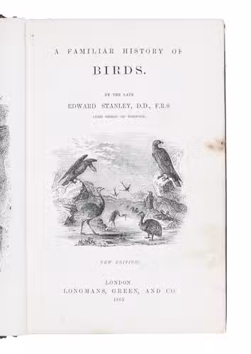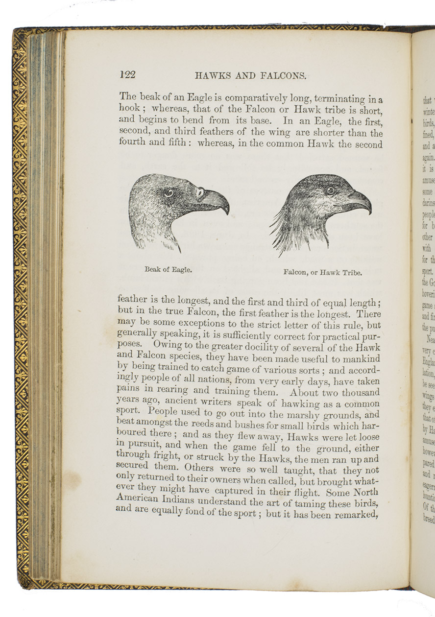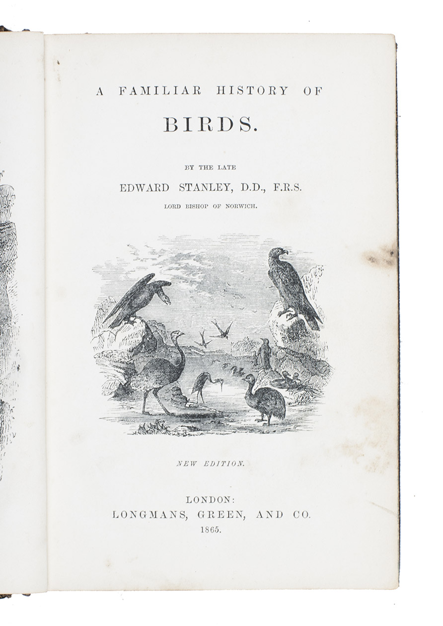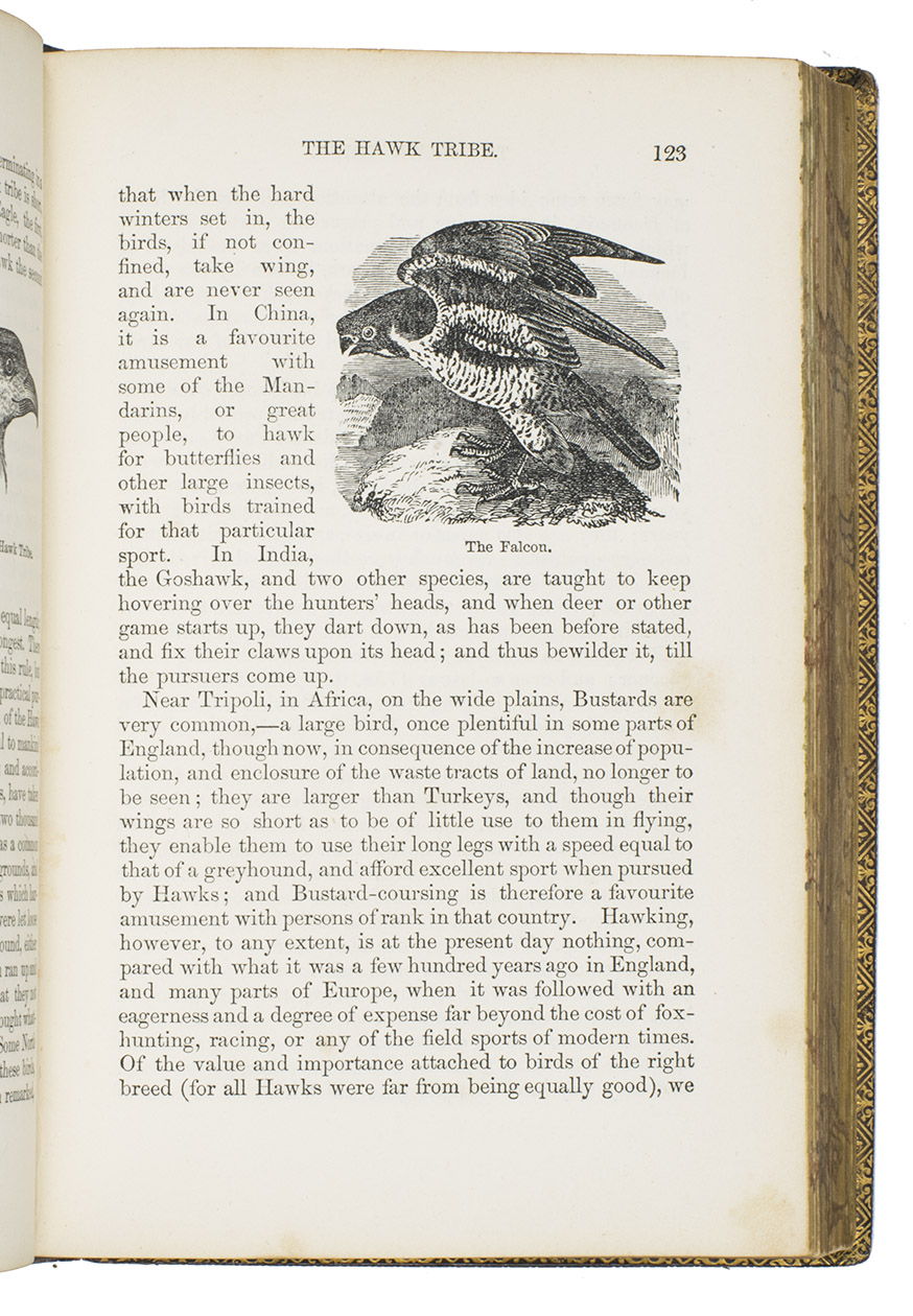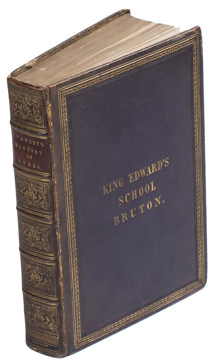 Fifth edition (1865) of a general account of bird life in its various aspects written by Edward Stanley (1779-1849), Bishop of Norwich, first published in 1835. The present copy, probably in a school prize binding, has a charming fore-edge painting of a scene showing a hunt with falcons. The edges have been gilded over the painting, so that the scene appears when the fore-edge is fanned. Stanley presents various facts and anecdotes about numerous species of birds and their instincts and habits. The preliminary advertisement notes that the book is intended for a class of readers who want to know more about birds, but to whom mere scientific details would be unacceptable. It contains 20 chapters. The first 5 describe the general classification, the external and internal structure of birds, their organs of sound, and their plumage, wings and flight. The last 15 describe different kinds of birds, including eagles, hawks, falcons, owls, birds of paradise, ostriches, water birds, toucans, ducks and penguins, but also the flamingo, albatross and peacock. The book also notes some remarkable facts, for example that hawks were sacred to Egyptians and were often found in mummy pits. The text is illustrated with many images of birds. Sometimes these images just show the appearance of the birds, but sometimes they also show their internal structure, for example the skeleton. Although the classification is obsolete and many statements, presented by Stanley as facts, are inaccurate, this work has some value as a juvenile ornithological work. The present copy is probably in a prize binding from the 16th-century free grammar school, King Edward [VI]s School in Bruton, but has no certificate or recipients name (Longman apparently supplied them: we have seen a notice of their 1861 edition of Macaulay in a prize binding for the same school).