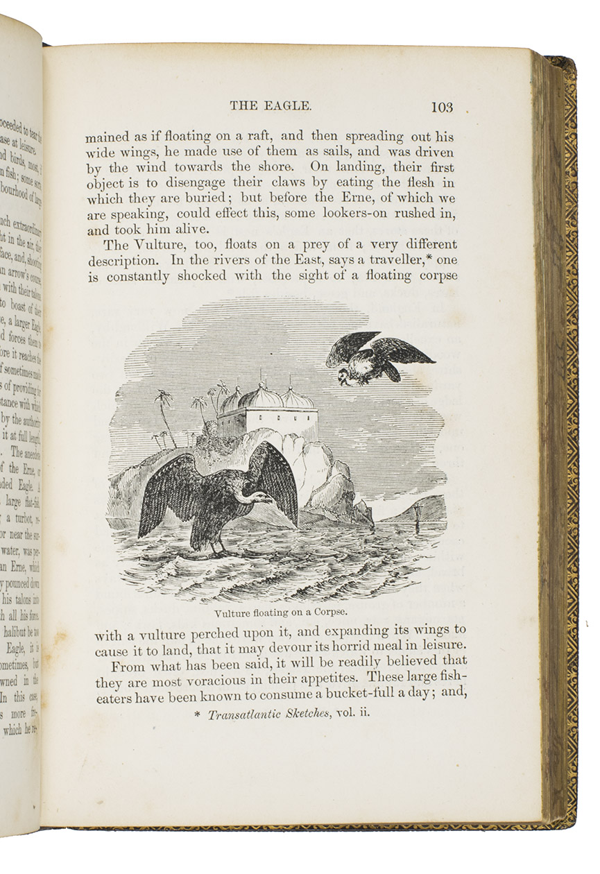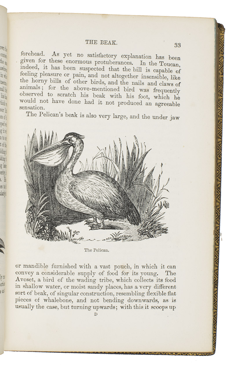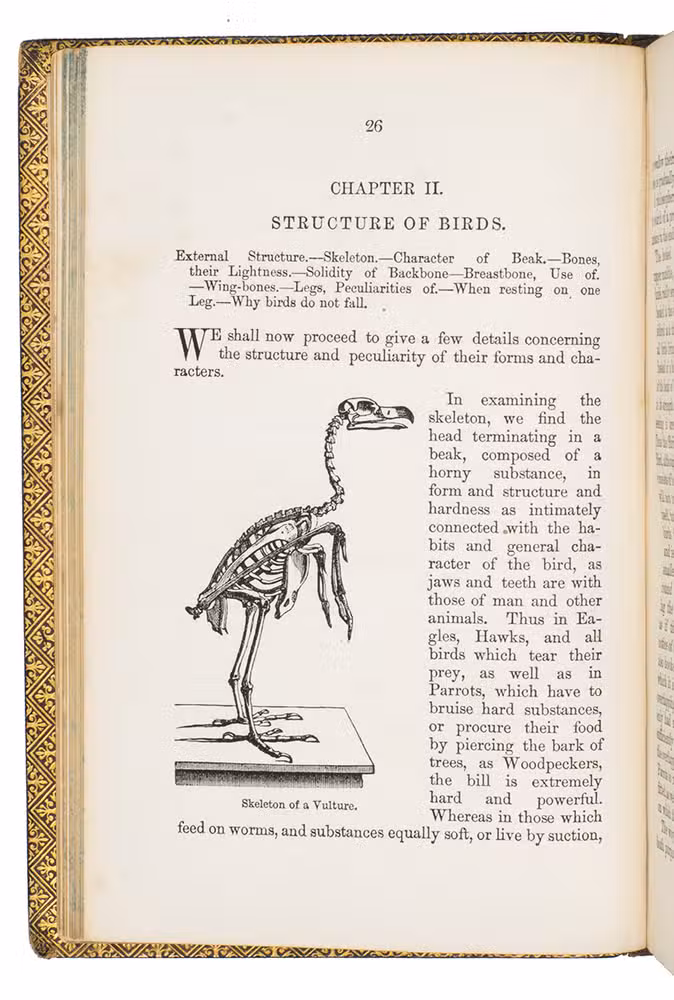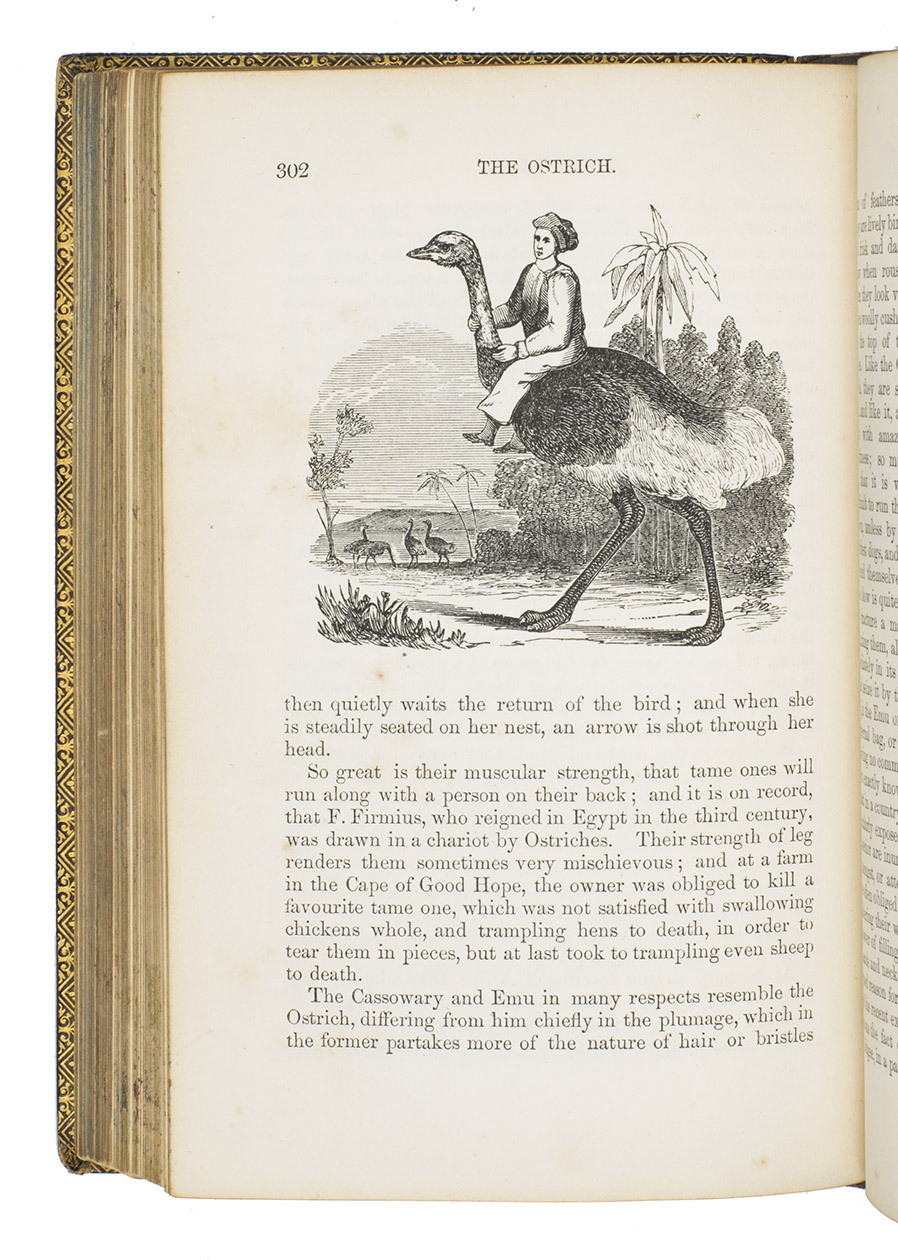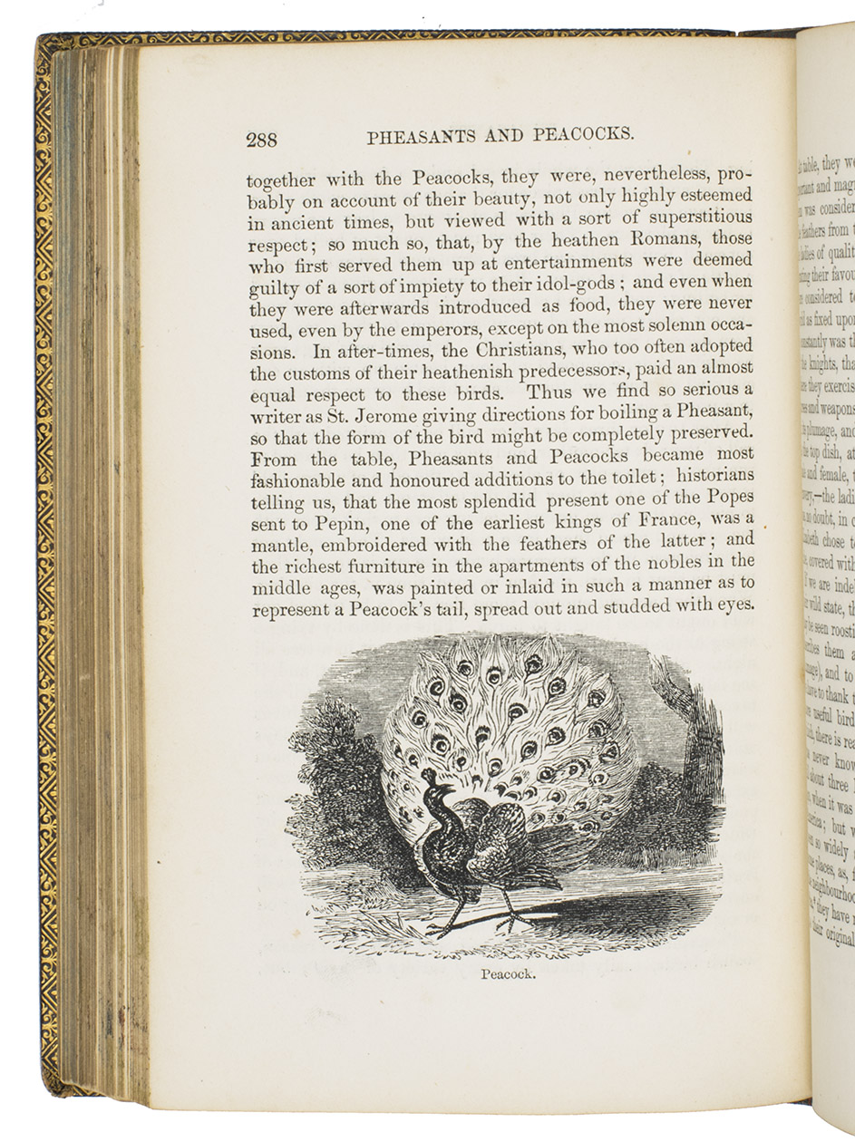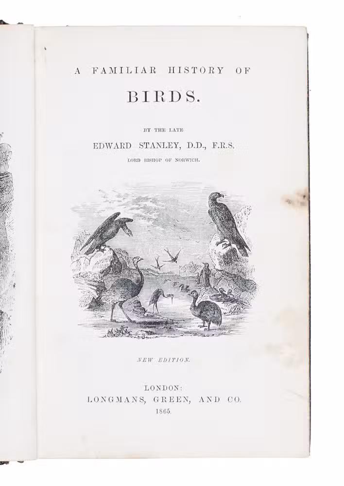 Fifth edition (1865) of a general account of bird life in its various aspects written by Edward Stanley (1779-1849), Bishop of Norwich, first published in 1835. The present copy, probably in a school prize binding, has a charming fore-edge painting of a scene showing a hunt with falcons. The edges have been gilded over the painting, so that the scene appears when the fore-edge is fanned. Stanley presents various facts and anecdotes about numerous species of birds and their instincts and habits. The preliminary advertisement notes that the book is intended for a class of readers who want to know more about birds, but to whom mere scientific details would be unacceptable. It contains 20 chapters. The first 5 describe the general classification, the external and internal structure of birds, their organs of sound, and their plumage, wings and flight. The last 15 describe different kinds of birds, including eagles, hawks, falcons, owls, birds of paradise, ostriches, water birds, toucans, ducks and penguins, but also the flamingo, albatross and peacock. The book also notes some remarkable facts, for example that hawks were sacred to Egyptians and were often found in mummy pits. The text is illustrated with many images of birds. Sometimes these images just show the appearance of the birds, but sometimes they also show their internal structure, for example the skeleton. Although the classification is obsolete and many statements, presented by Stanley as facts, are inaccurate, this work has some value as a juvenile ornithological work. The present copy is probably in a prize binding from the 16th-century free grammar school, King Edward [VI]s School in Bruton, but has no certificate or recipients name (Longman apparently supplied them: we have seen a notice of their 1861 edition of Macaulay in a prize binding for the same school).