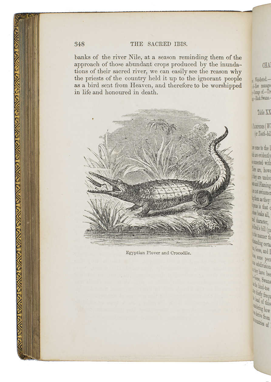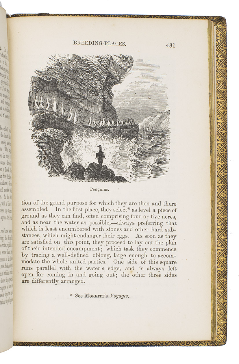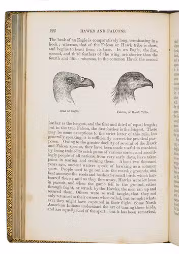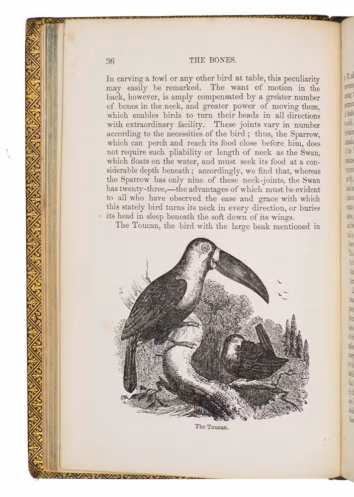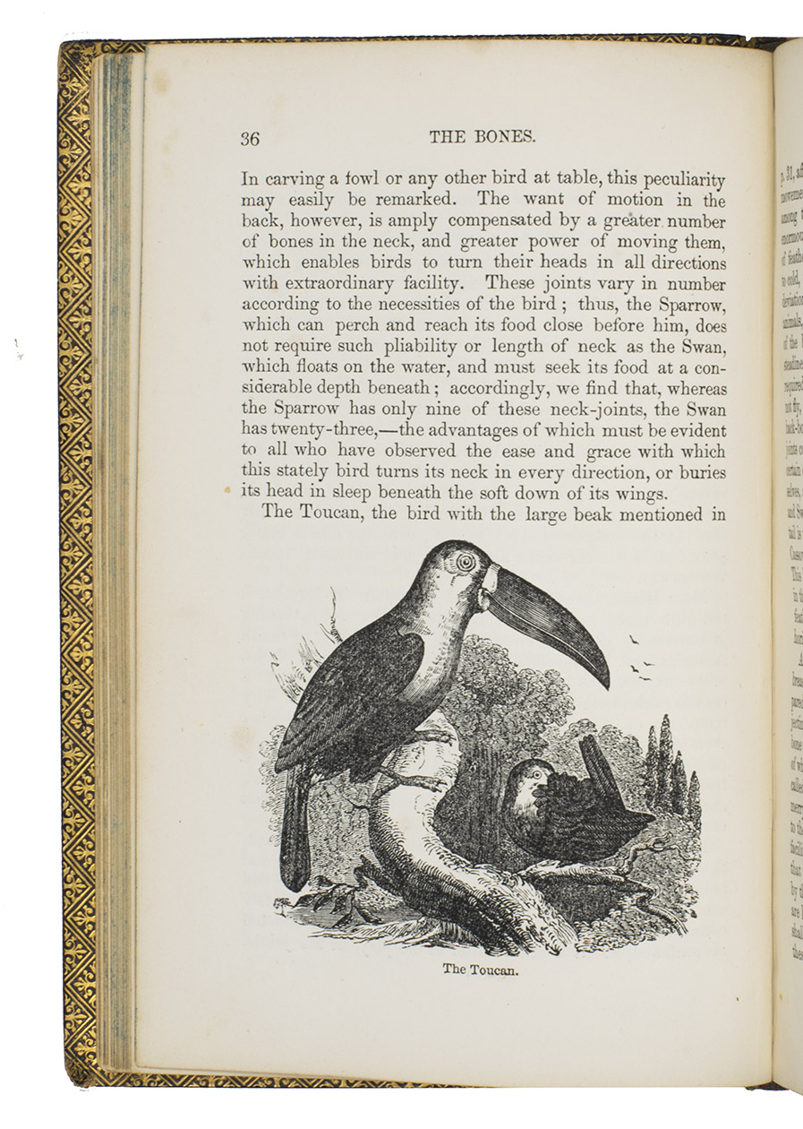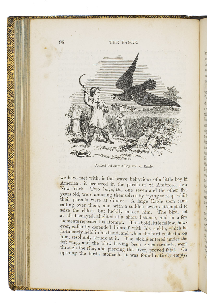 Fifth edition (1865) of a general account of bird life in its various aspects written by Edward Stanley (1779-1849), Bishop of Norwich, first published in 1835. The present copy, probably in a school prize binding, has a charming fore-edge painting of a scene showing a hunt with falcons. The edges have been gilded over the painting, so that the scene appears when the fore-edge is fanned. Stanley presents various facts and anecdotes about numerous species of birds and their instincts and habits. The preliminary advertisement notes that the book is intended for a class of readers who want to know more about birds, but to whom mere scientific details would be unacceptable. It contains 20 chapters. The first 5 describe the general classification, the external and internal structure of birds, their organs of sound, and their plumage, wings and flight. The last 15 describe different kinds of birds, including eagles, hawks, falcons, owls, birds of paradise, ostriches, water birds, toucans, ducks and penguins, but also the flamingo, albatross and peacock. The book also notes some remarkable facts, for example that hawks were sacred to Egyptians and were often found in mummy pits. The text is illustrated with many images of birds. Sometimes these images just show the appearance of the birds, but sometimes they also show their internal structure, for example the skeleton. Although the classification is obsolete and many statements, presented by Stanley as facts, are inaccurate, this work has some value as a juvenile ornithological work. The present copy is probably in a prize binding from the 16th-century free grammar school, King Edward [VI]s School in Bruton, but has no certificate or recipients name (Longman apparently supplied them: we have seen a notice of their 1861 edition of Macaulay in a prize binding for the same school).