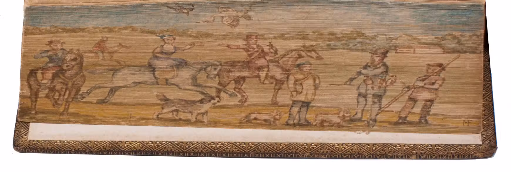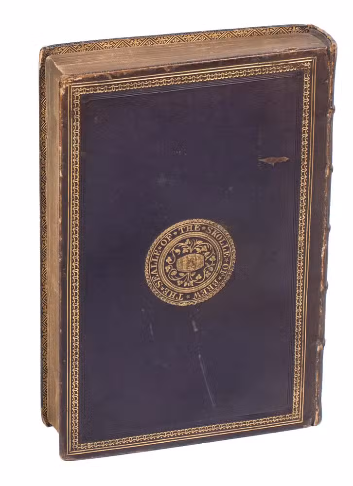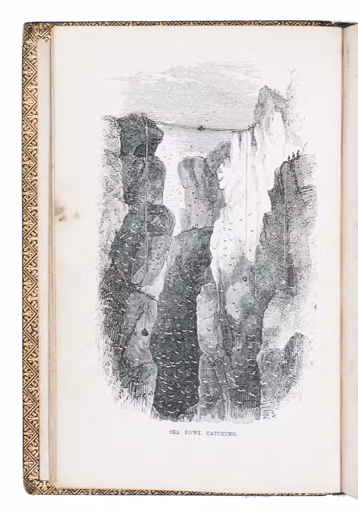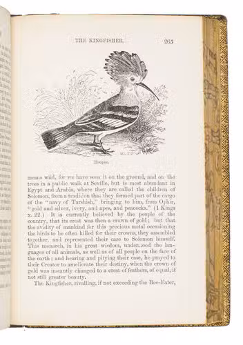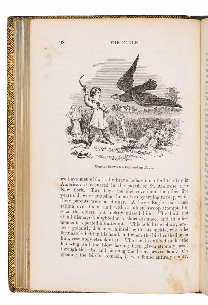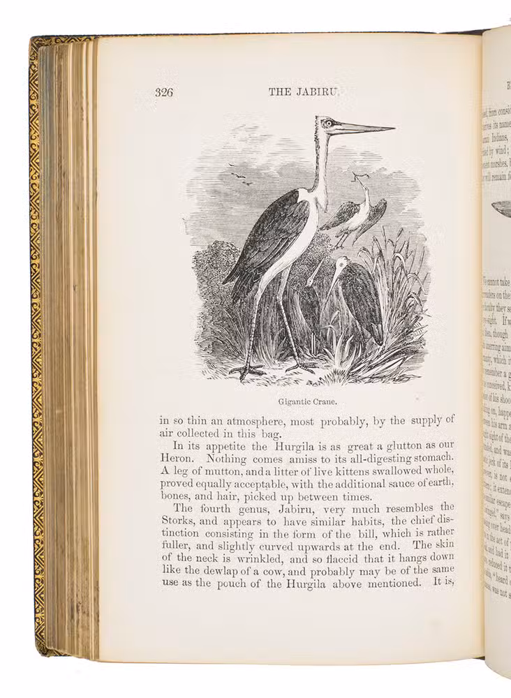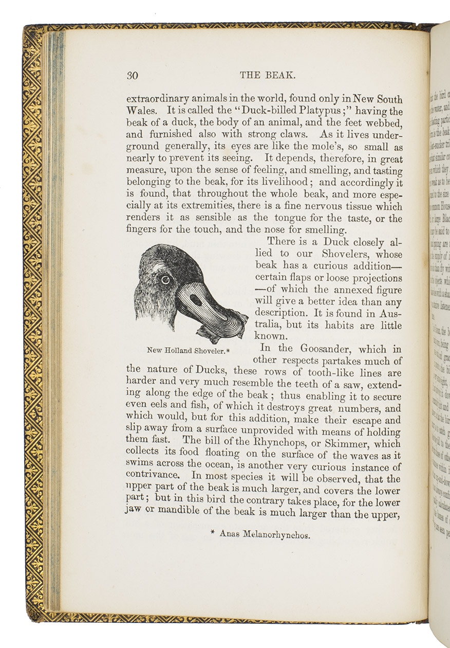 Fifth edition (1865) of a general account of bird life in its various aspects written by Edward Stanley (1779-1849), Bishop of Norwich, first published in 1835. The present copy, probably in a school prize binding, has a charming fore-edge painting of a scene showing a hunt with falcons. The edges have been gilded over the painting, so that the scene appears when the fore-edge is fanned. Stanley presents various facts and anecdotes about numerous species of birds and their instincts and habits. The preliminary advertisement notes that the book is intended for a class of readers who want to know more about birds, but to whom mere scientific details would be unacceptable. It contains 20 chapters. The first 5 describe the general classification, the external and internal structure of birds, their organs of sound, and their plumage, wings and flight. The last 15 describe different kinds of birds, including eagles, hawks, falcons, owls, birds of paradise, ostriches, water birds, toucans, ducks and penguins, but also the flamingo, albatross and peacock. The book also notes some remarkable facts, for example that hawks were sacred to Egyptians and were often found in mummy pits. The text is illustrated with many images of birds. Sometimes these images just show the appearance of the birds, but sometimes they also show their internal structure, for example the skeleton. Although the classification is obsolete and many statements, presented by Stanley as facts, are inaccurate, this work has some value as a juvenile ornithological work. The present copy is probably in a prize binding from the 16th-century free grammar school, King Edward [VI]s School in Bruton, but has no certificate or recipients name (Longman apparently supplied them: we have seen a notice of their 1861 edition of Macaulay in a prize binding for the same school).
